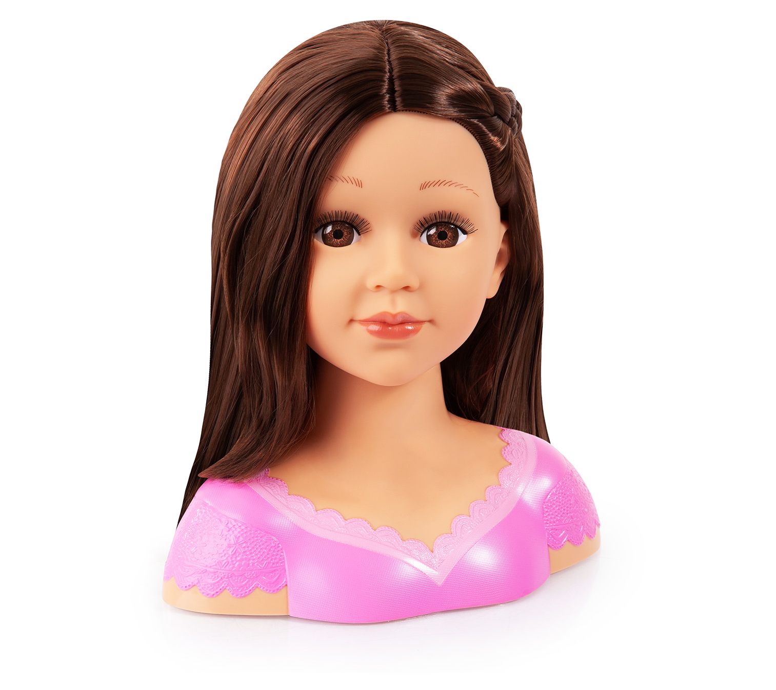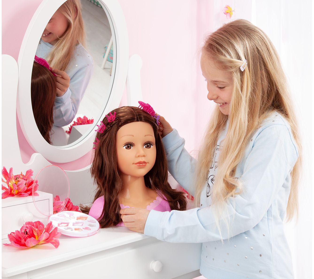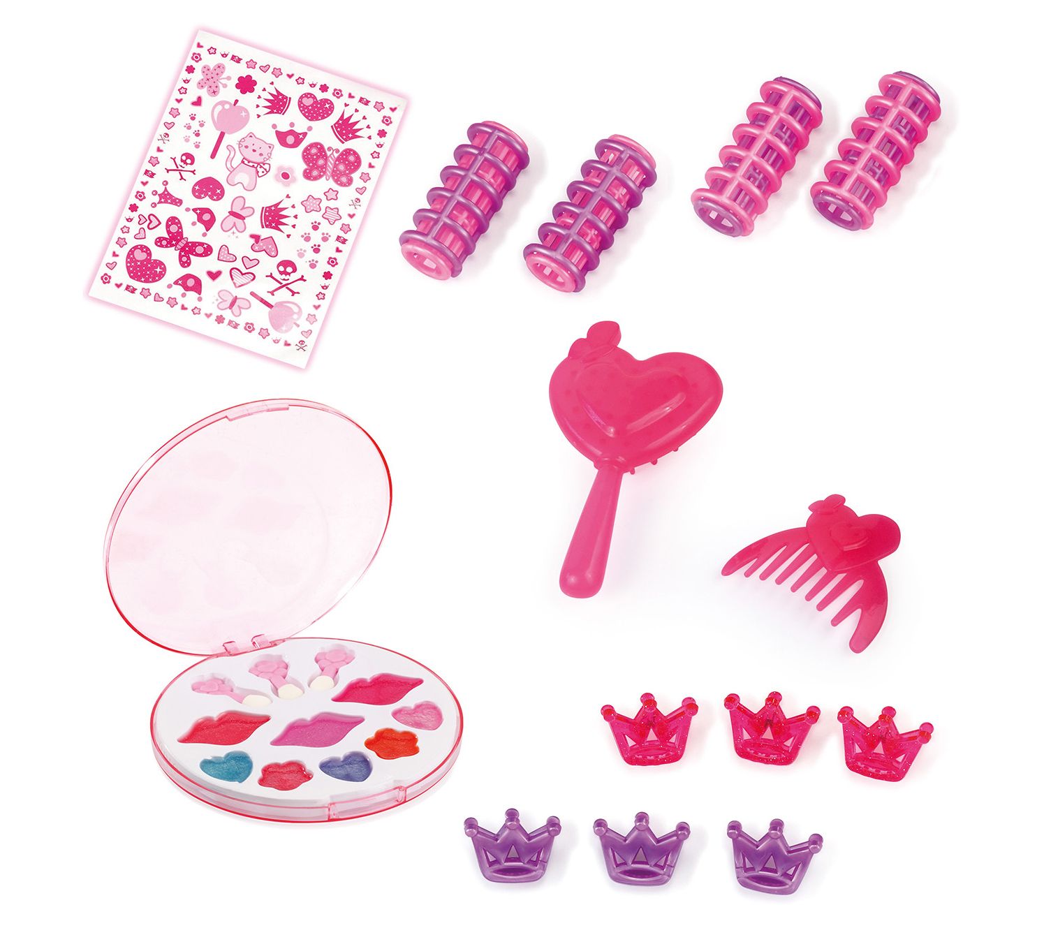 • Includes styling head, brush, comb, four hair curlers, six hair clips, stickers, and make up