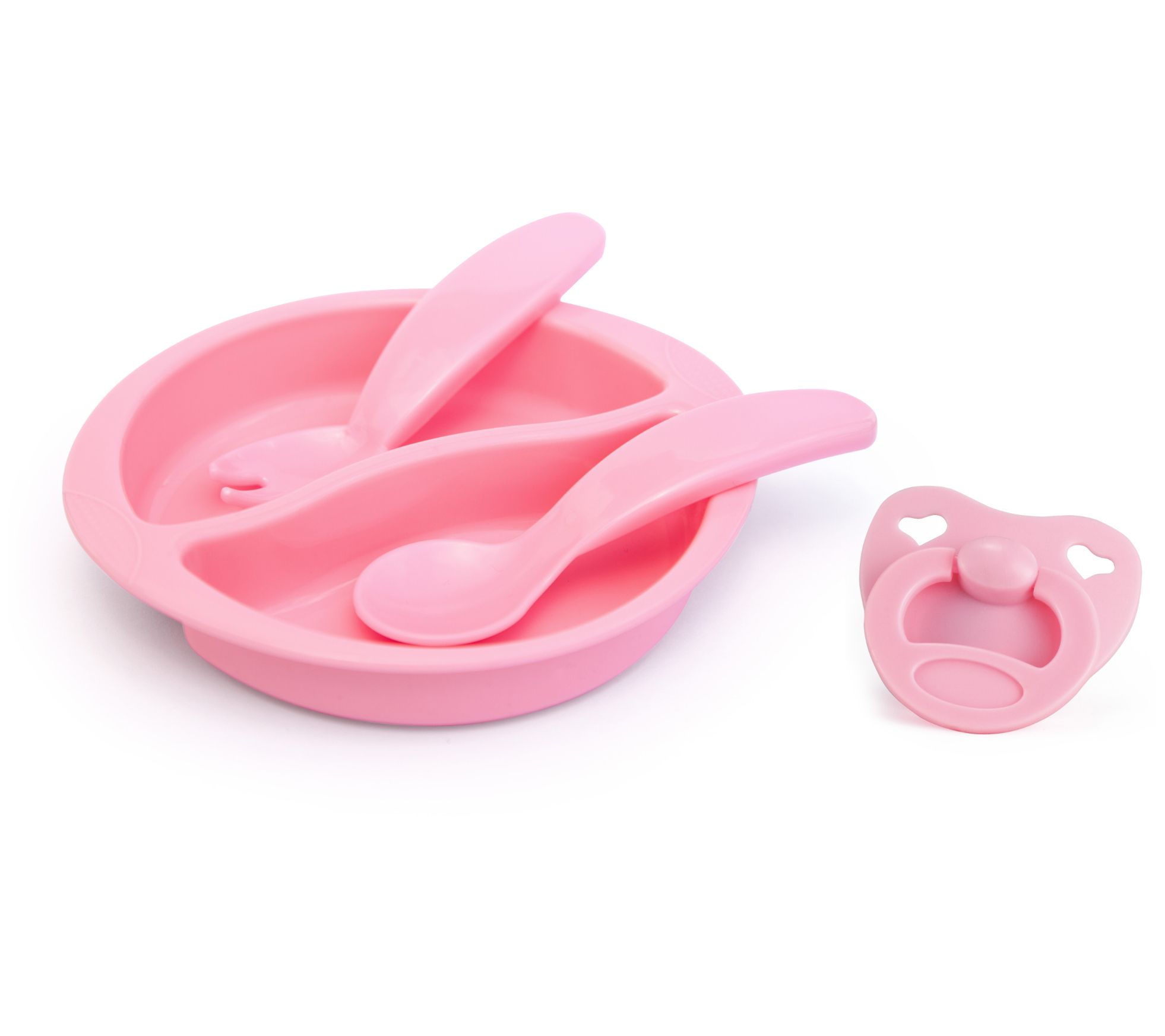 • Includes travel bed, a blanket, a pillow, a table seat, a plate with fork and spoon, a bottle, a pacifier, and a bib