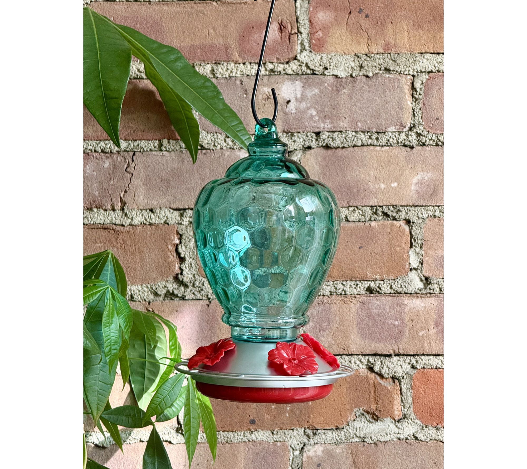 Create a vibrant hub for hummingbirds with this blown glass feeder, designed with four detailed feeding ports and bright red flowers that entice tiny visitors to your patio or garden. Fill it up, hang with the included hook, and enjoy watching these lively birds pause for a sweet treat. Cleaning is simple with the included brush. From Ultimate Innovations.