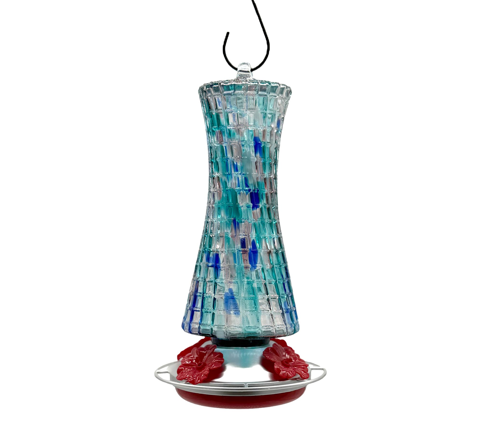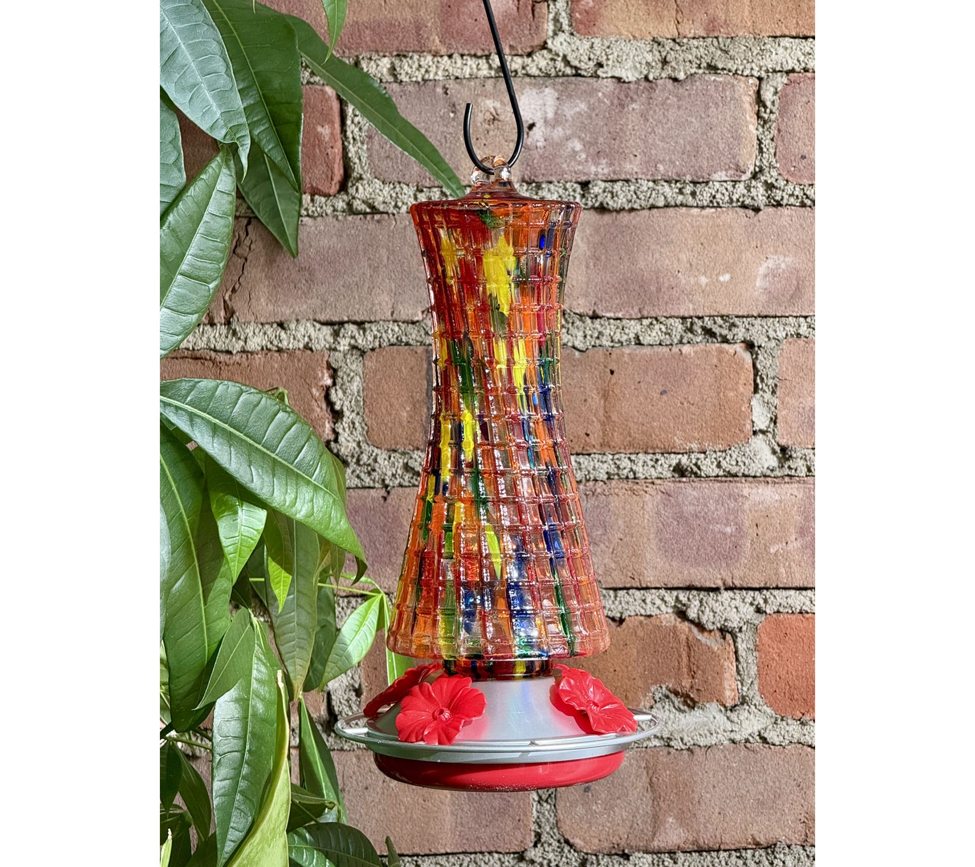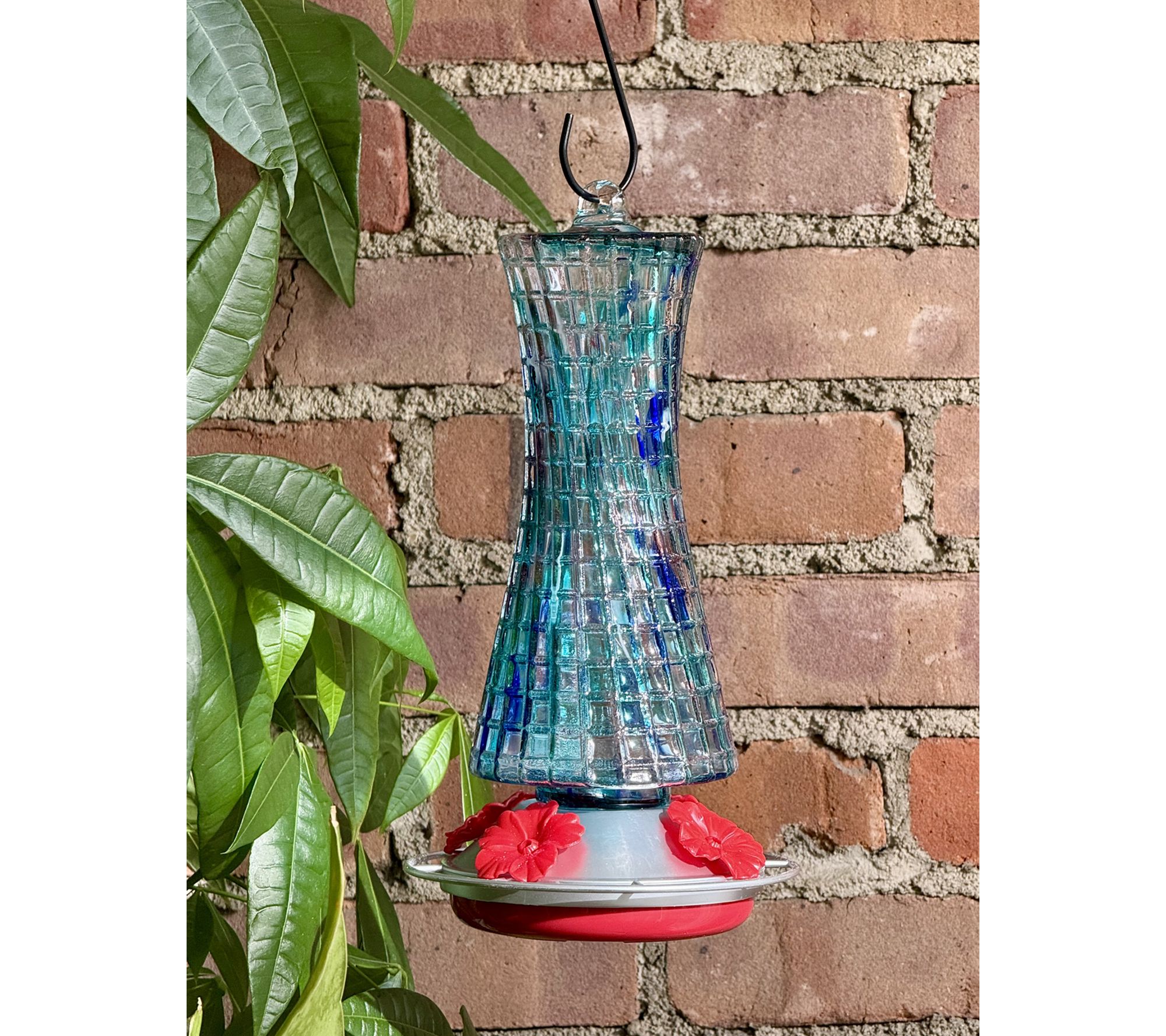 Welcome hummingbirds into your backyard with this charming glass feeder, designed with four ornate feeding ports and bright red flower accents to attract feathered visitors. Fill with sweet nectar, hang it easily with the included hook, and enjoy watching these delightful birds sip and flutter nearby. From Ultimate Innovations.