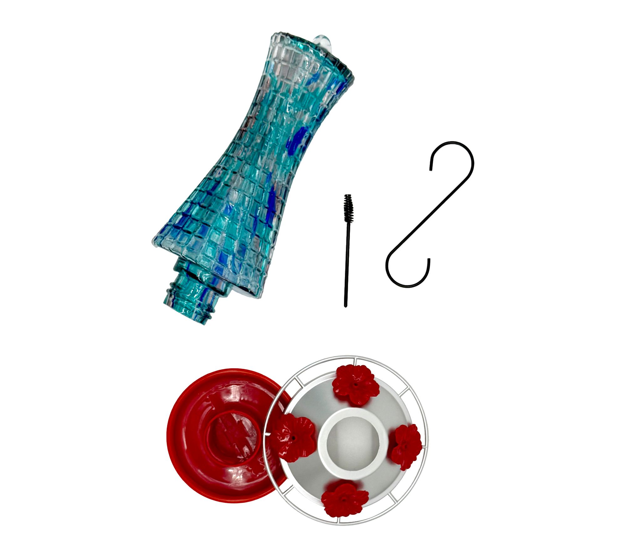 Includes hummingbird feeder with hanging hook and cleaning brush
