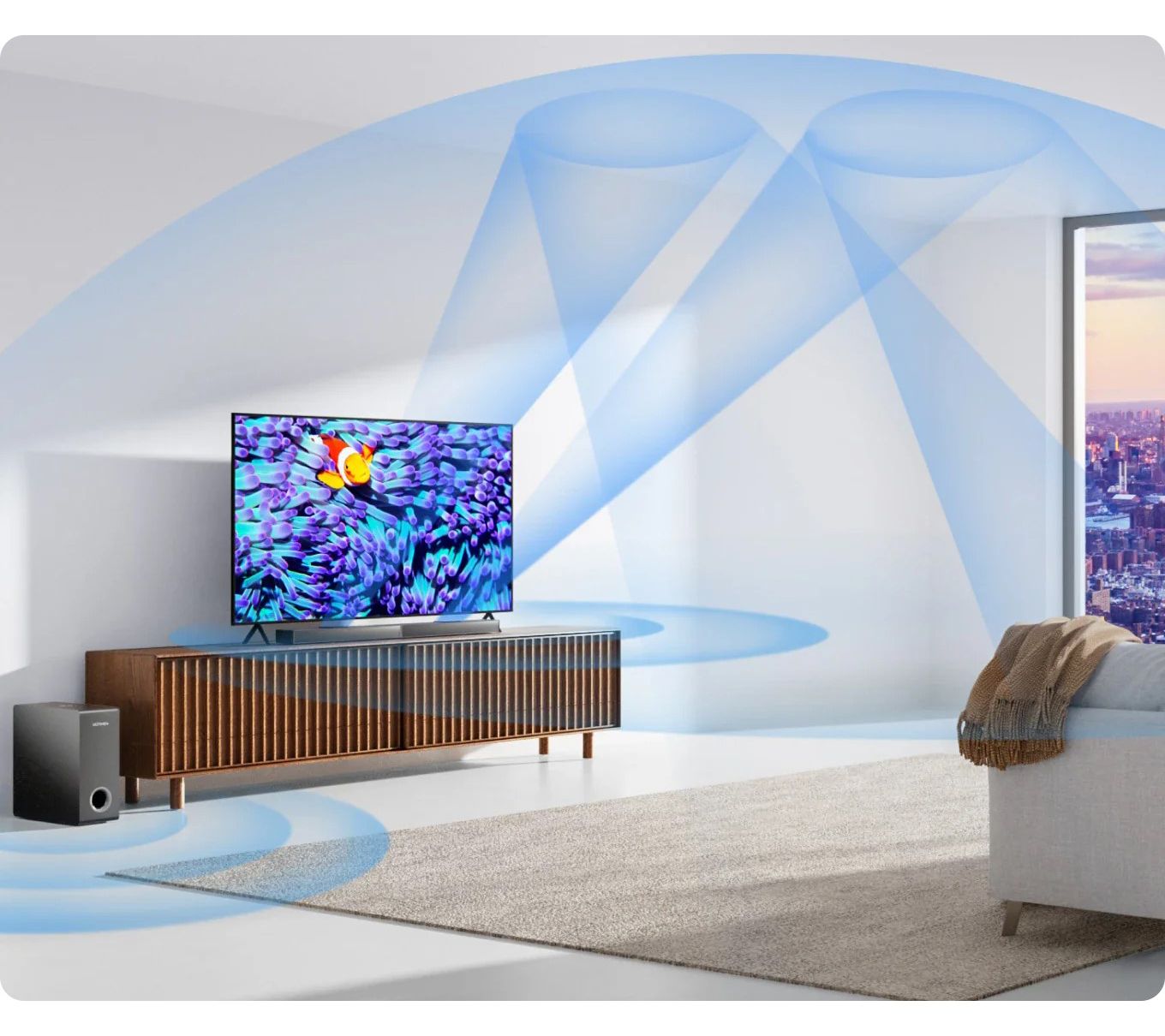 Dive into a real Dolby Atmos experience with the ultra-slim Ultimea Nova S70 3.1.2-channel soundbar. Its three main channels and two up-firing drivers enhance sound clarity and create an immersive audio field. With BassMax technology, enjoy adjustable, thunderous bass that brings your entertainment to life. From Ultimea.