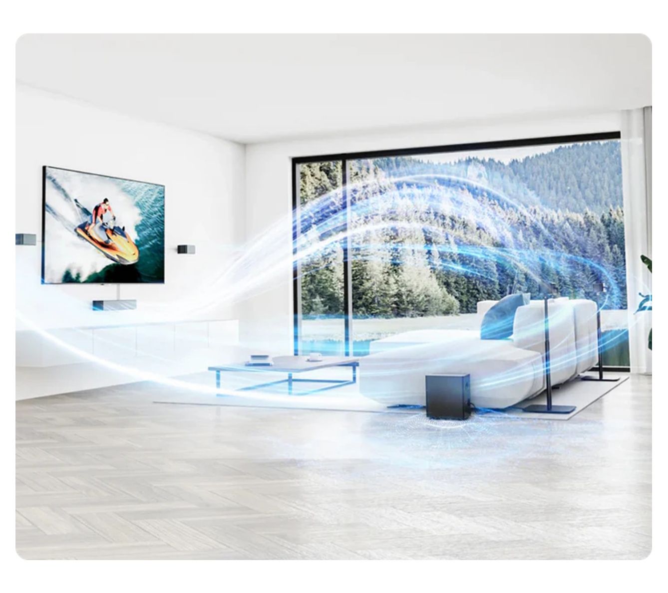 • Includes soundbar, subwoofer, four surround speakers, AC adaptor/charger, cables, HDMI cable, mounting materials, and wireless remote