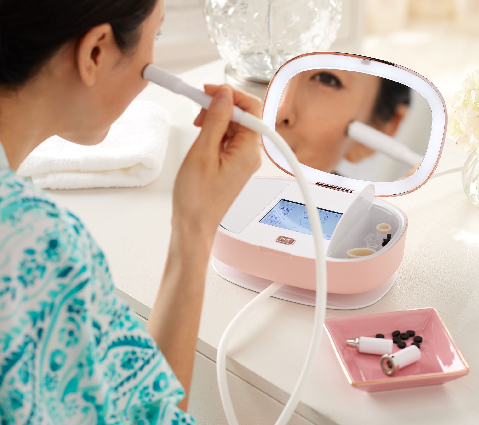 How do I use it: For the first time user, select Sensitive Mode if you have sensitive or easily irritated skin. For all others, select Auto Mode and hit the start button. From there, the screen will guide you through a simple treatment cycle of the entire face and neck in exactly five minutes. Sensitive Mode and Auto Mode both set the timer and suction level for each section of the face, updating based on what works best for each section.