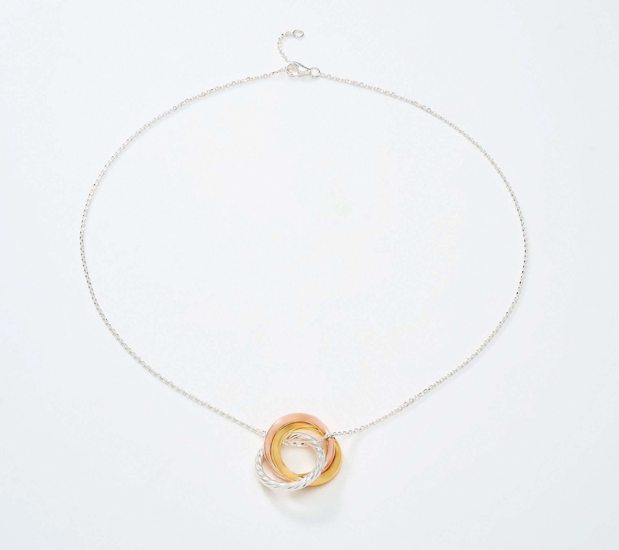 A symbol of lasting connection, this infinity circle necklace brings meaning and contemporary elegance to every ensemble. The triple interlocking rings, each with distinctive finishes, stand out beautifully whether you wear the pendant on the included forzatina chain or add it to another favorite piece. From UltraFine® 950 Silver Nickel-Free Jewelry.