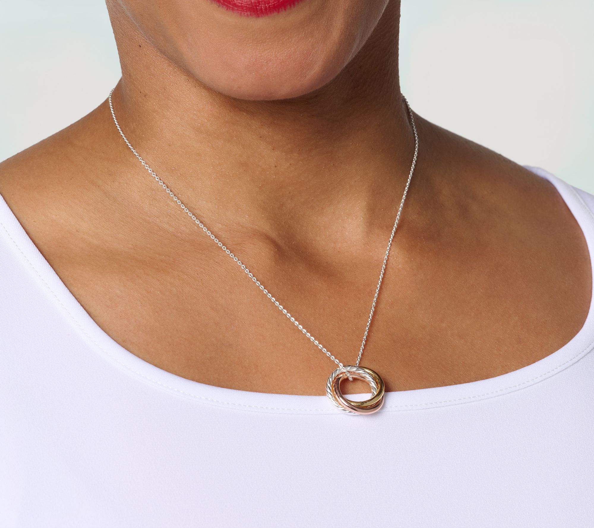 • Forzatina chain; removable infinity circle pendant with two polished interlocking rings and one twisted interlocking ring