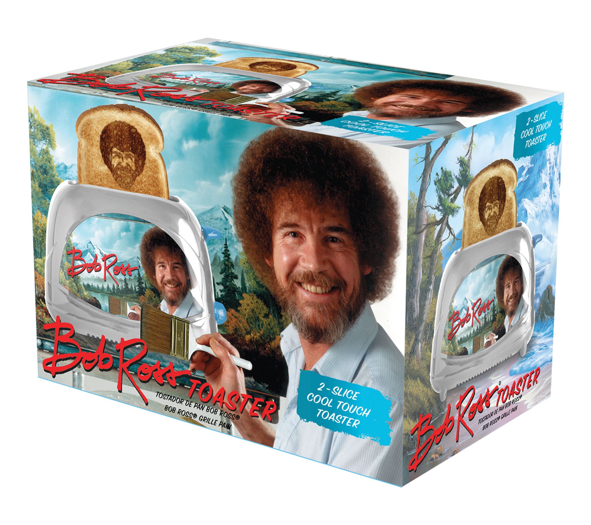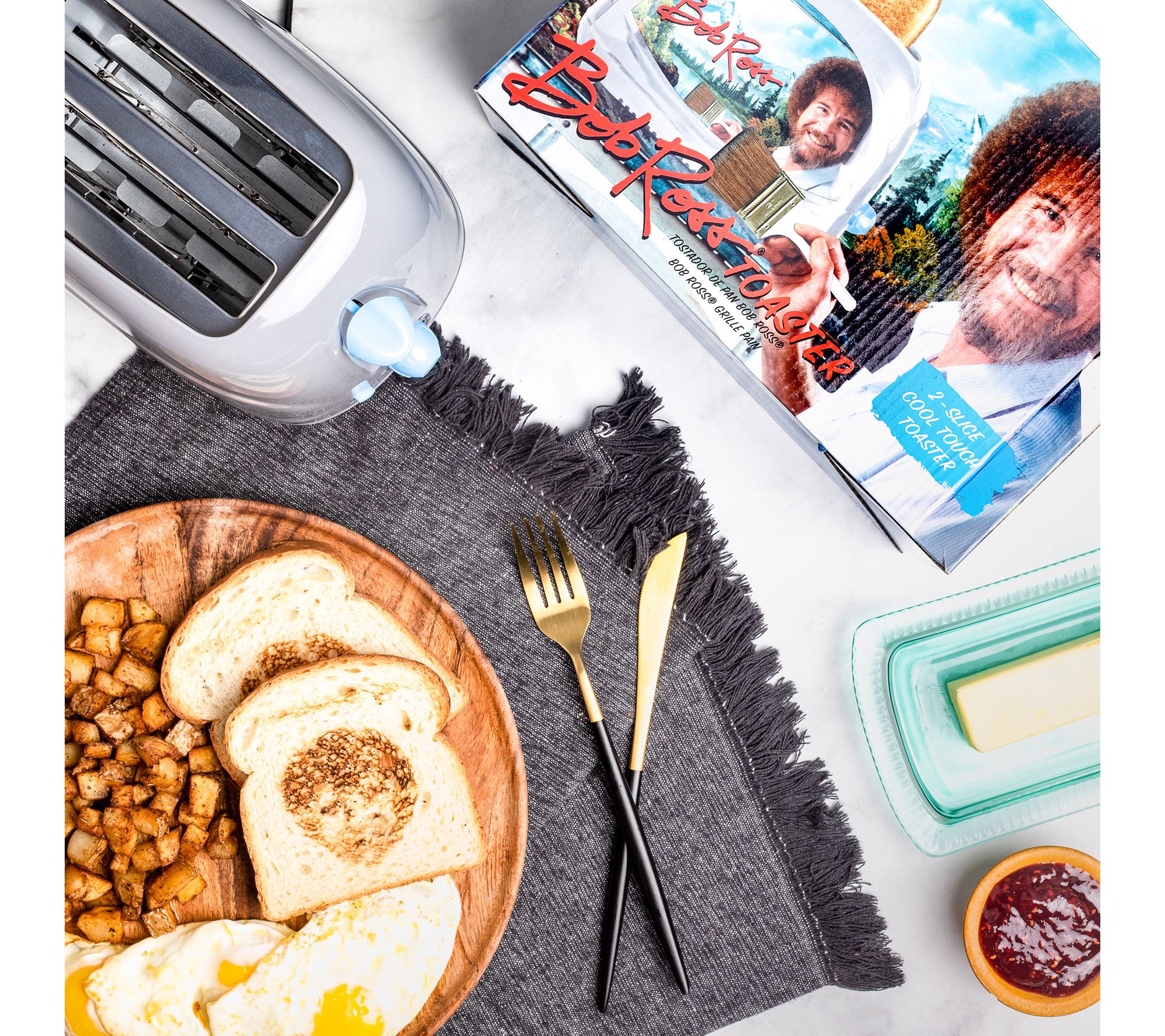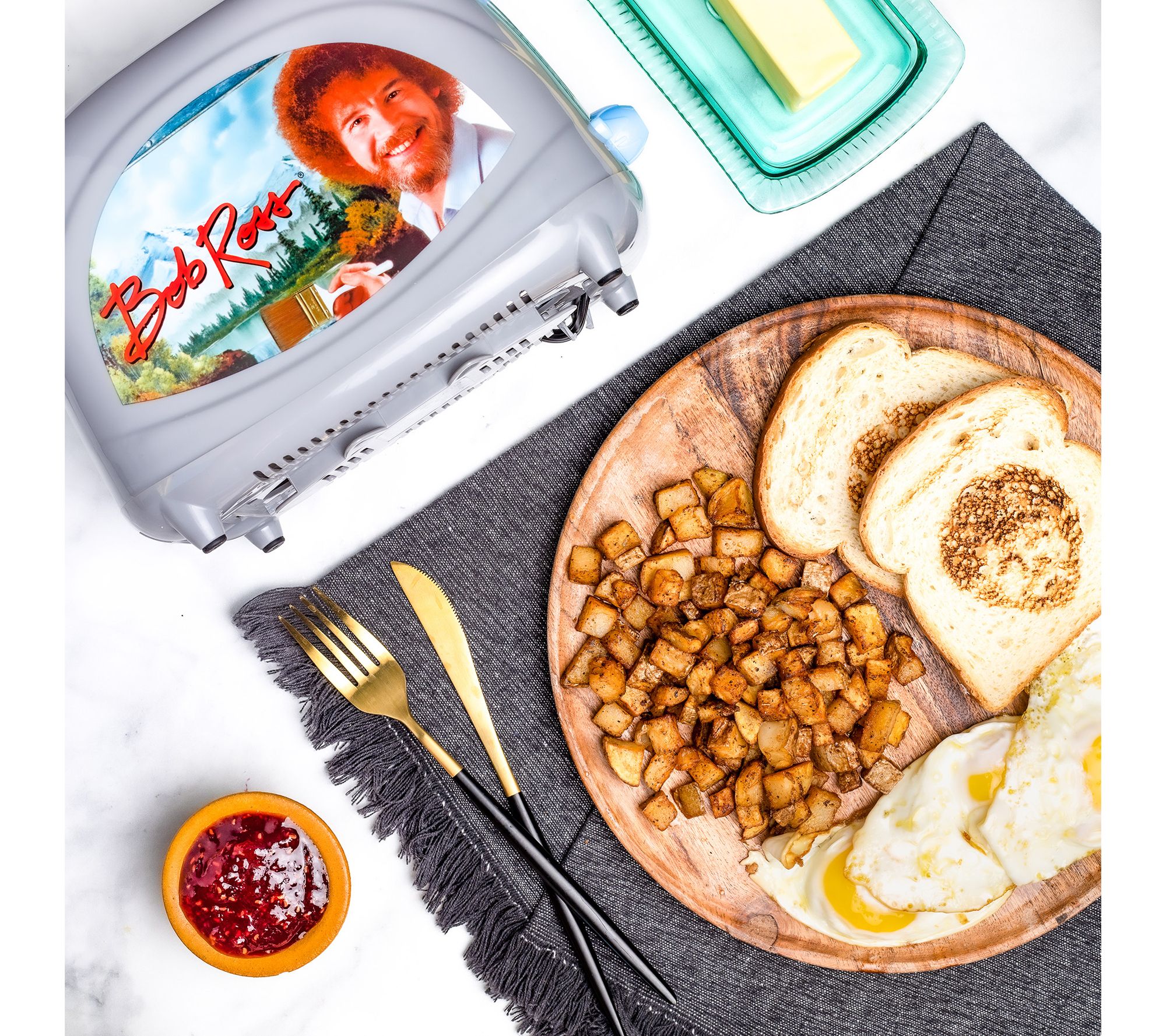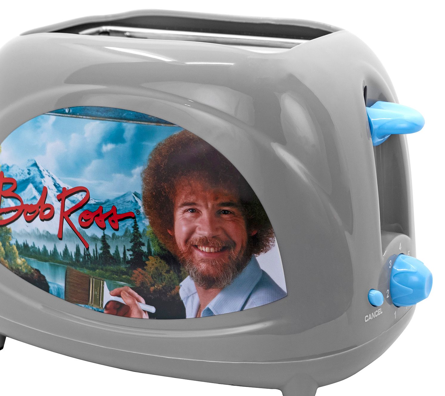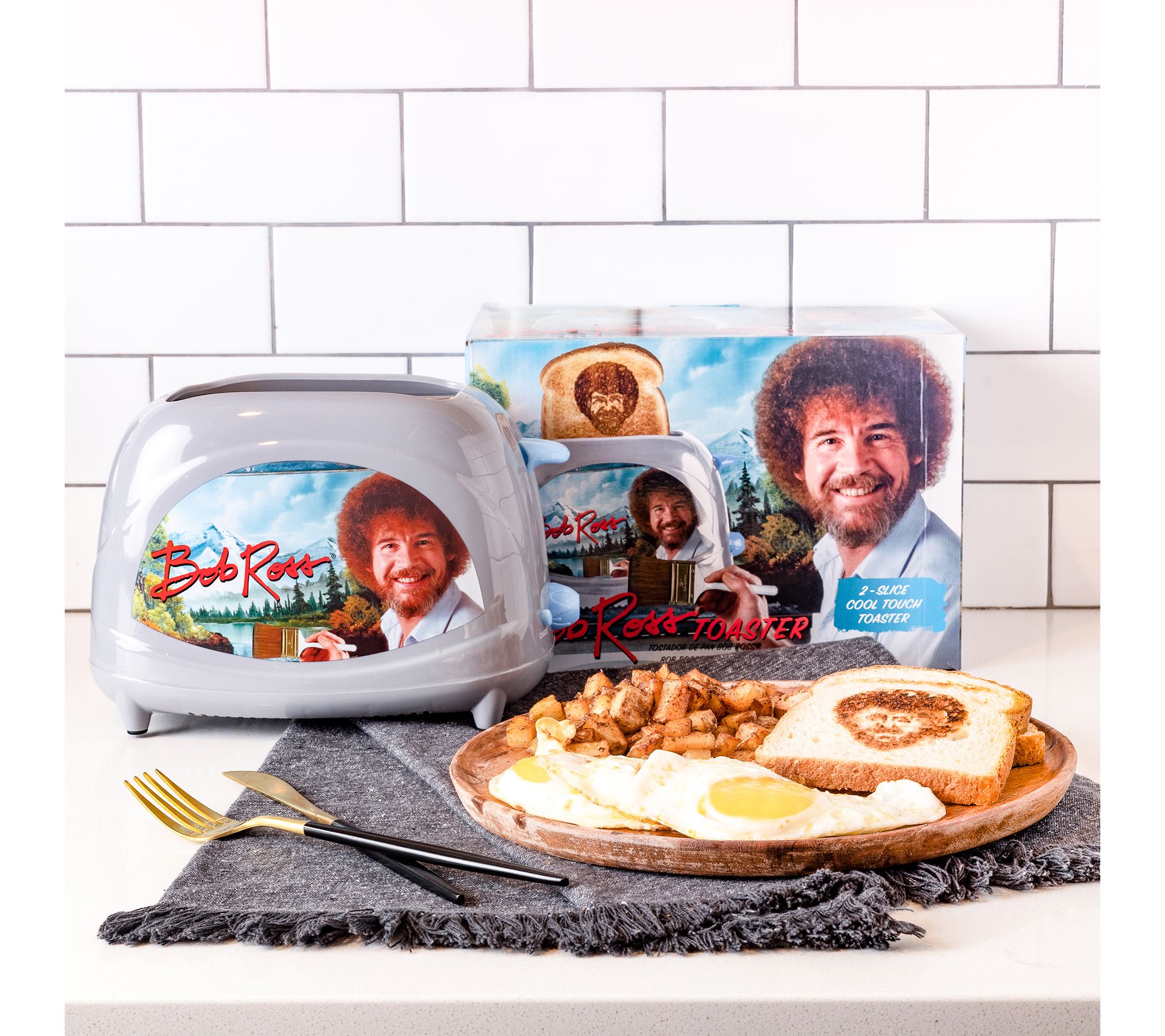 Bring a touch of joy to your mornings with the Uncanny Brands Bob Ross 2-slice toaster. Watch as Bob's iconic face and halo of hair appear on your toast, making breakfast a delightful experience. With reheat, defrost, and quick stop functions, this toaster ensures perfect slices every time. From Uncanny Brands.