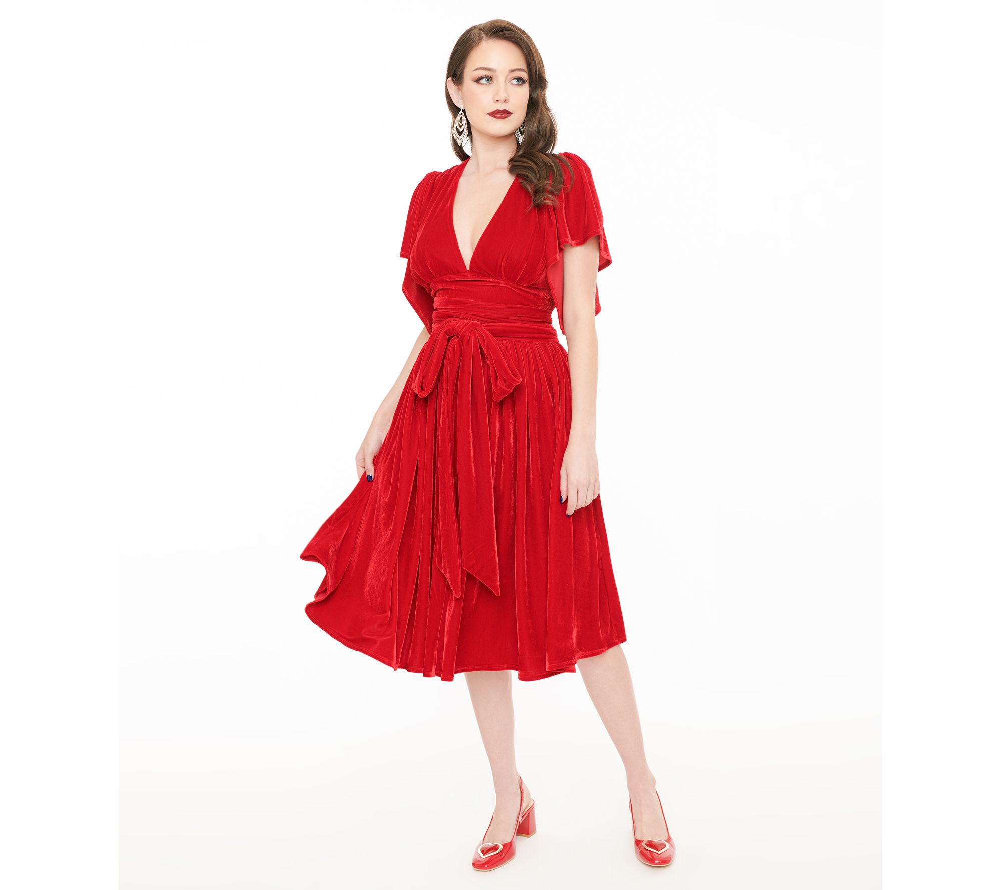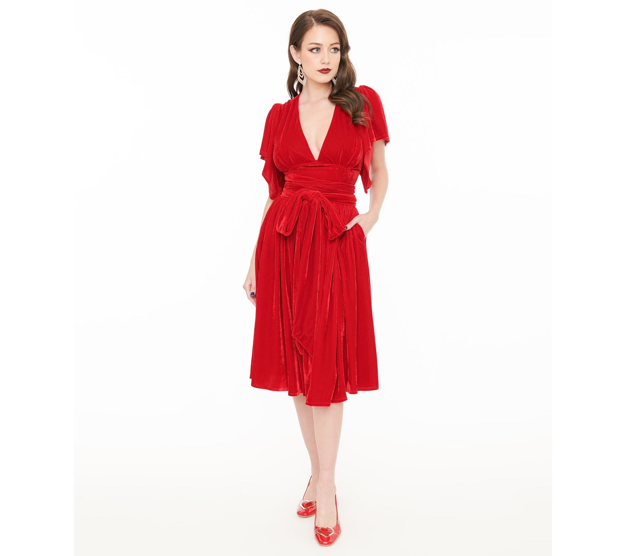 Turn heads at every event with this 1940s-inspired swing dress. Crafted from luxurious red velvet, it features dreamy short flutter sleeves and a flattering deep V-neck that beautifully accentuates your silhouette. The attached self-tie sash cinches your waist just right, while handy side pockets add a touch of practicality, making this vintage-inspired gem perfect for twirling through any occasion. From Unique Vintage.