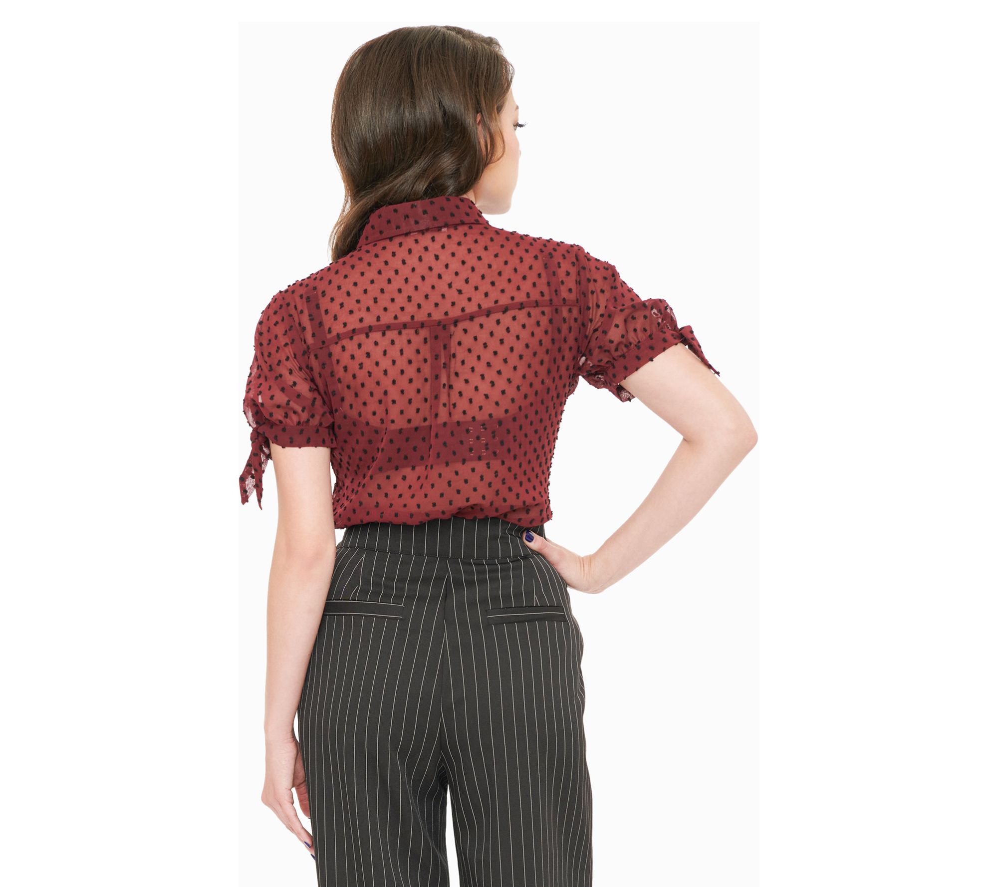 Take a step back in time with a stylish twist wearing this 1950s-inspired blouse. Crafted in sheer burgundy with black clip dots, this charming top features a button-up front, a classic collar, and short sleeves with self-tie keyhole cuffs that add a delightful detail. Whether you're headed to brunch or a vintage-themed event, this blouse will keep you looking effortlessly chic. From Unique Vintage.