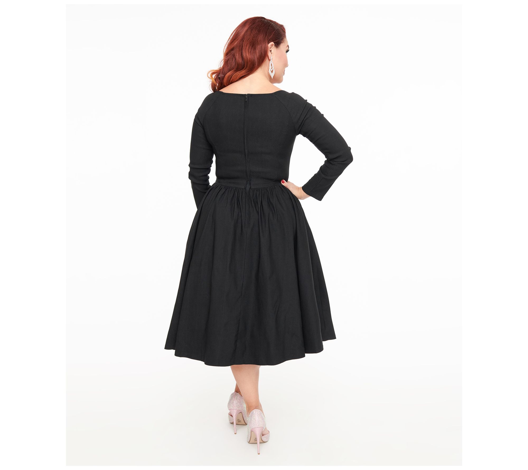 Showcase your vintage charm in this 1950s-inspired swing dress. The sweetheart neckline and long sleeves create a silhouette that flatters any figure. Perfect for cocktail parties or a night out, the solid black color adds timeless elegance to your look. From Unique Vintage.