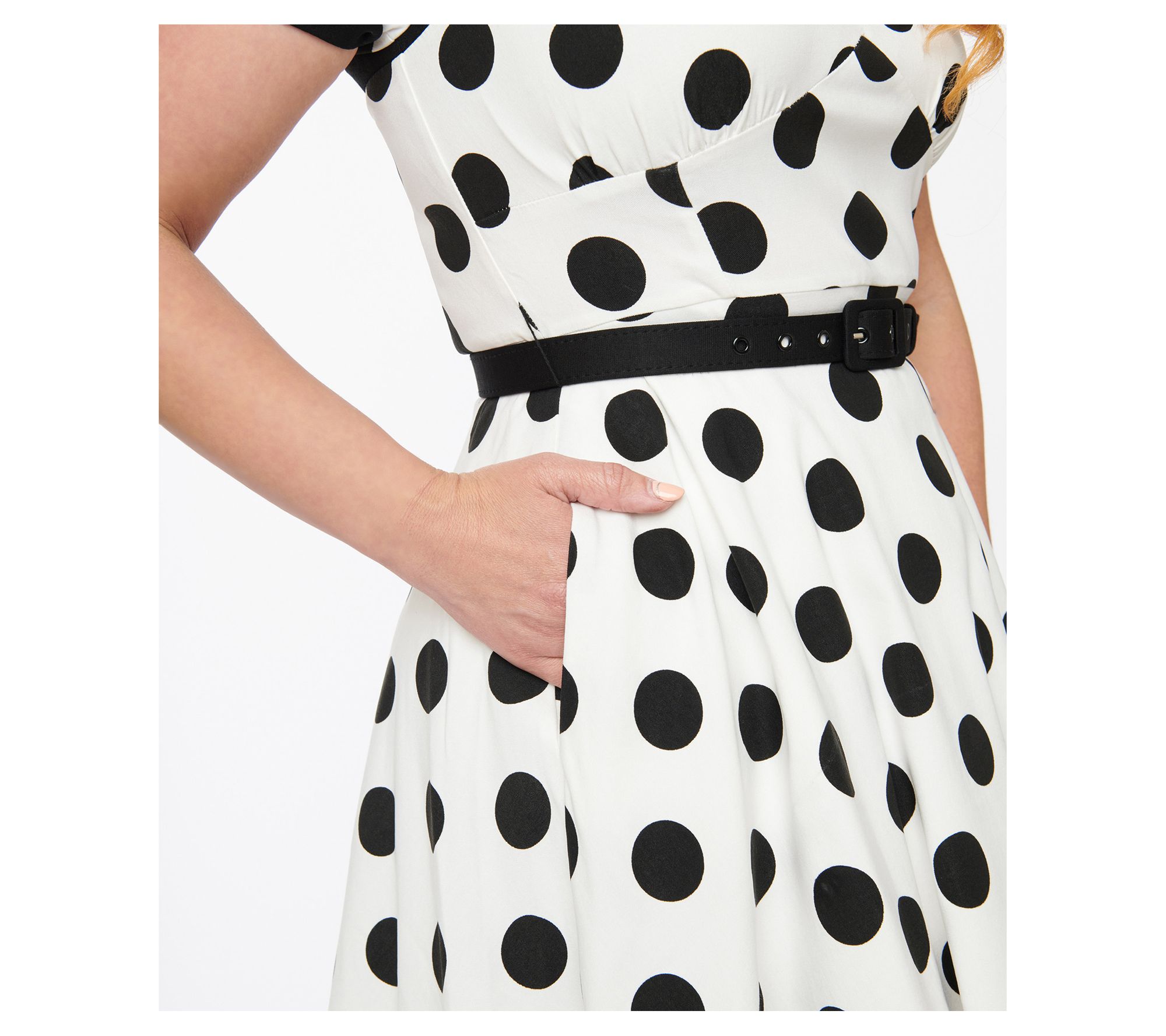 • Features: sweetheart neckline, short sleeves with black trim, black belt, side pockets