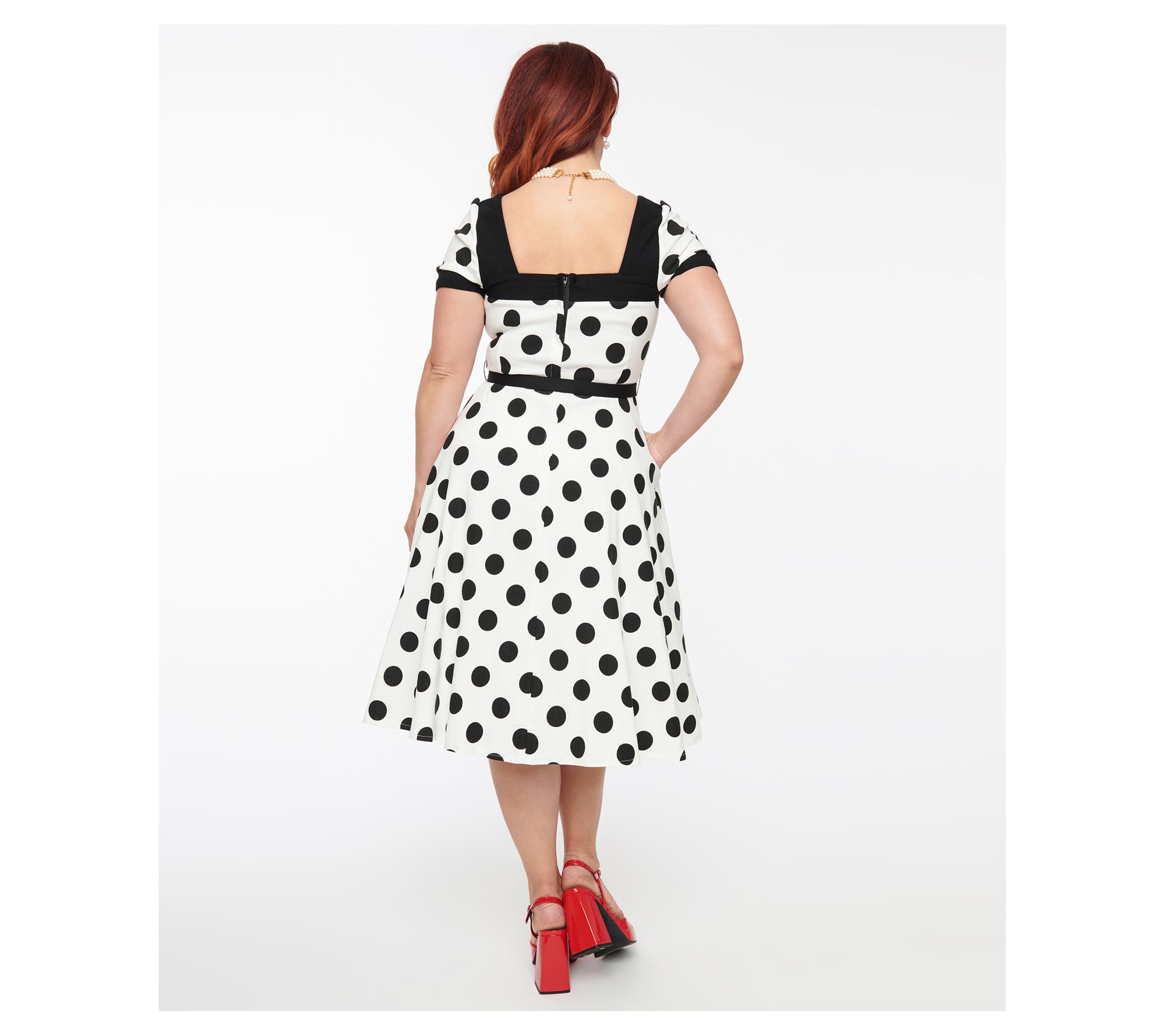 Step into timeless elegance with this 1950s-style white and black polka dot swing dress. This charming piece features a sweetheart neckline, short sleeves with black trim, and a black belt to cinch the waist, creating a flattering silhouette. From Unique Vintage.