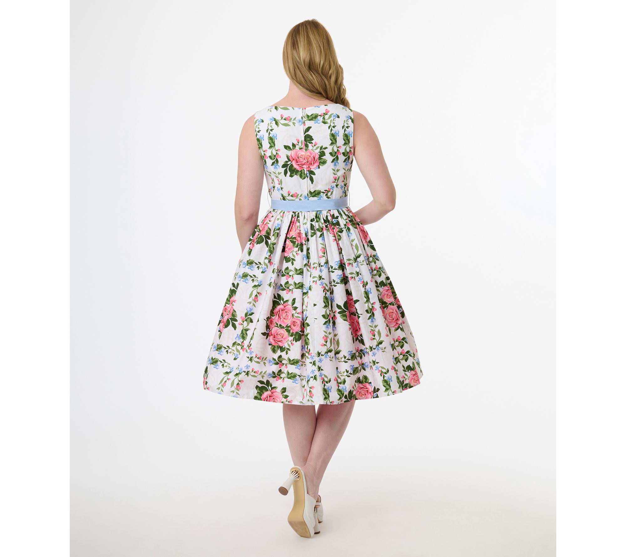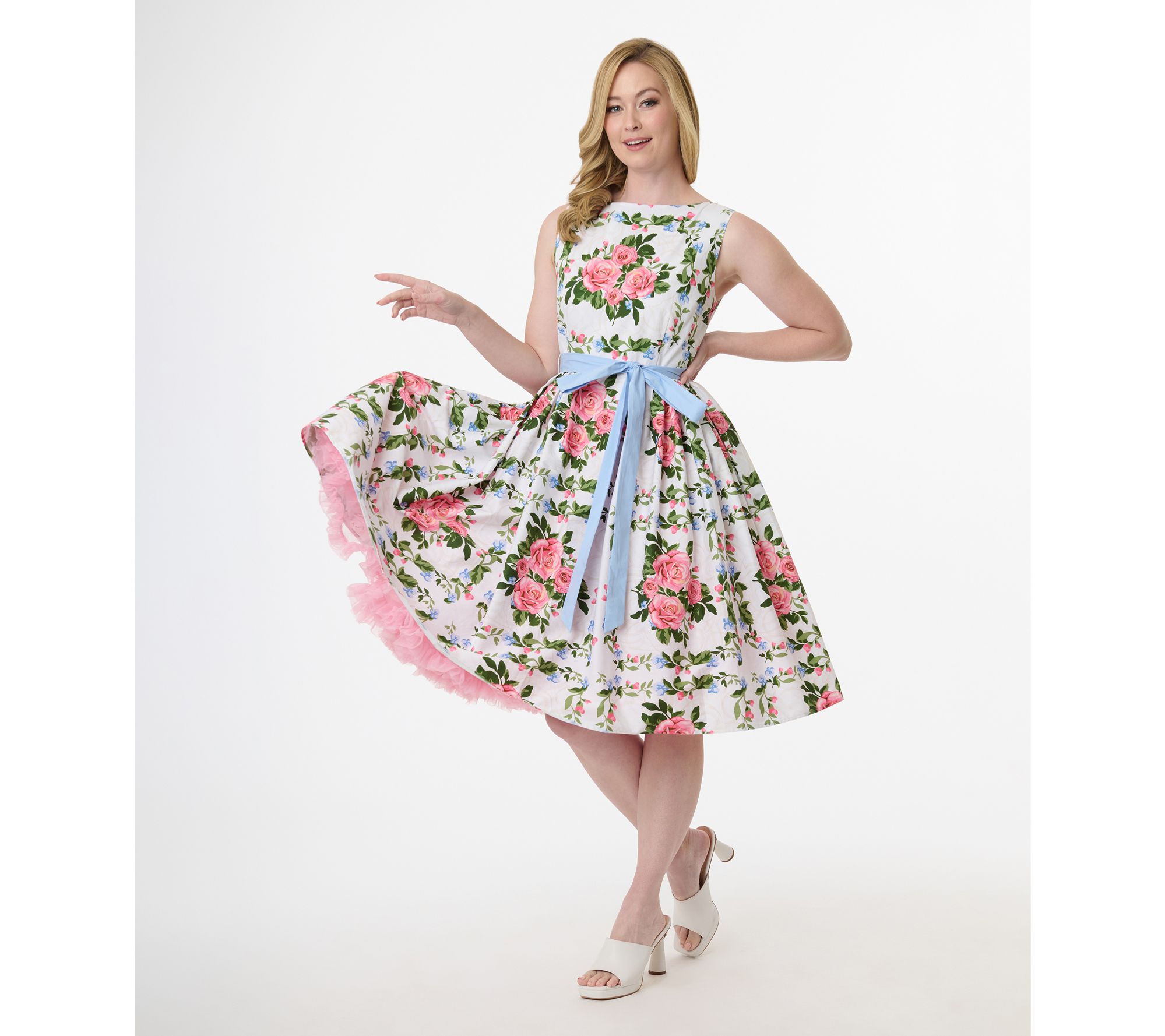 Sunlit garden parties and springtime brunches come alive in this 1950s-inspired A-line dress, showcasing a delicate pink rose print on crisp white cotton. The sleeveless, boatneck silhouette and light blue self-tie sash create a romantic, vintage look that moves with you through every twirl and toast. From Unique Vintage.