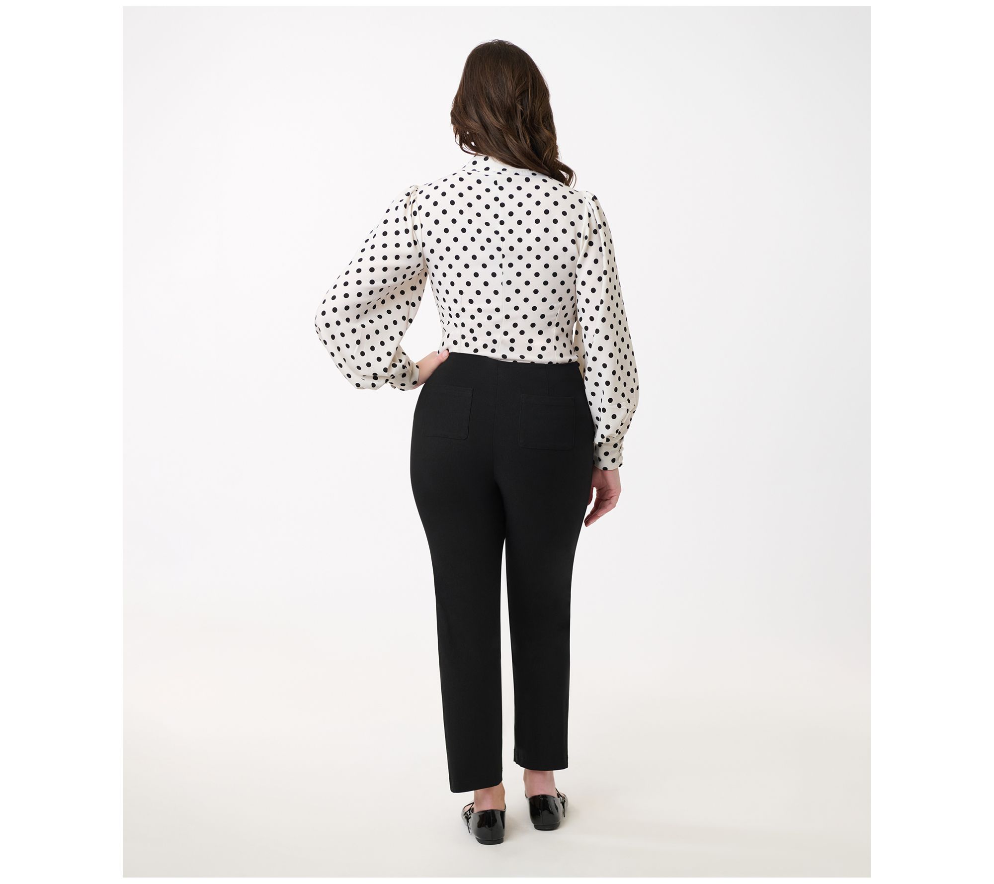 Create a retro-inspired look with these stylish cigarette pants, crafted in a fabulous black stretch bengaline fabric. The dramatic high waist slims and elongates your form, while the straight leg glides to your ankles. From Unique Vintage.
