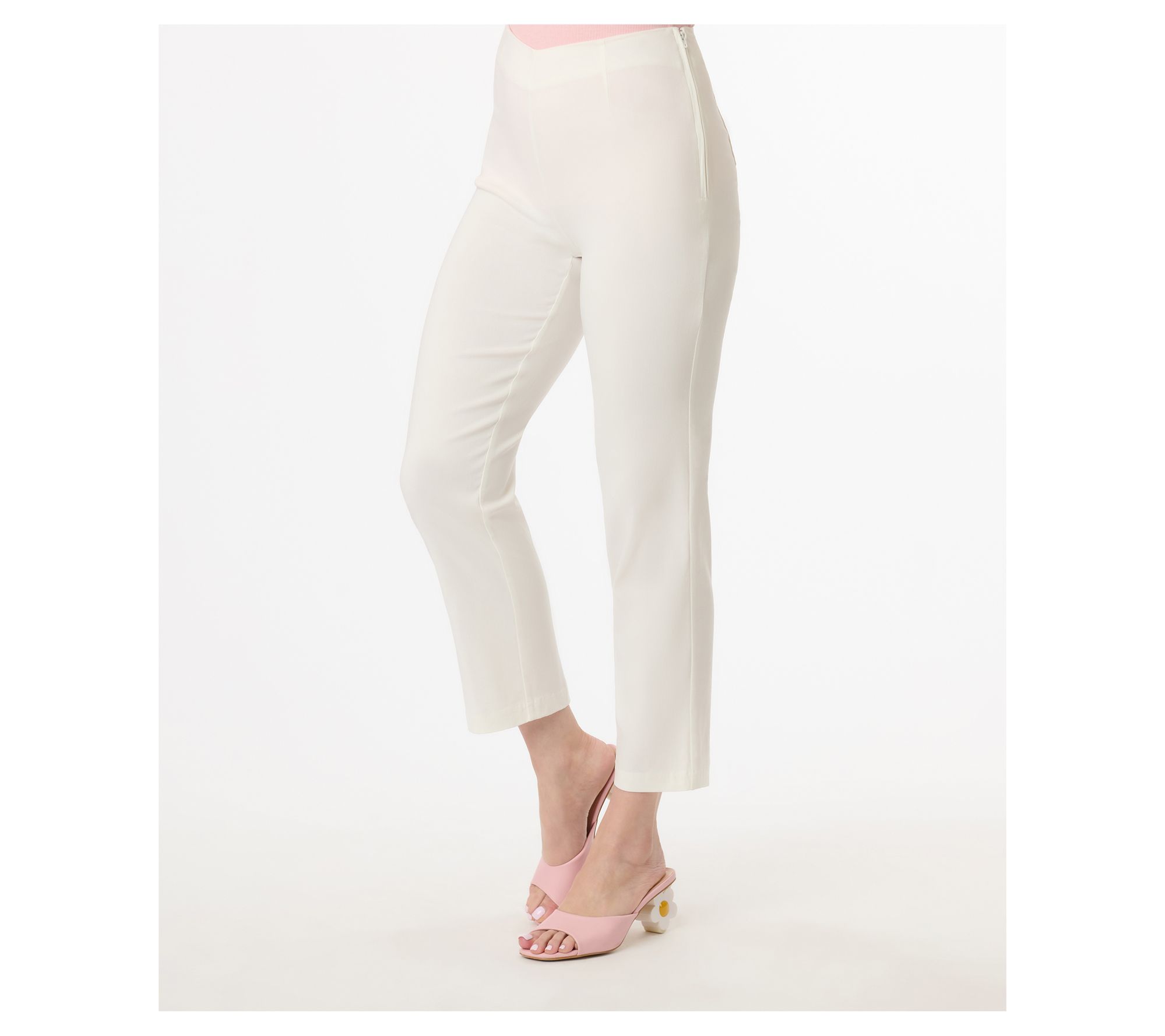 Features: high waist, stretch bengaline fabric, back pockets, ankle length