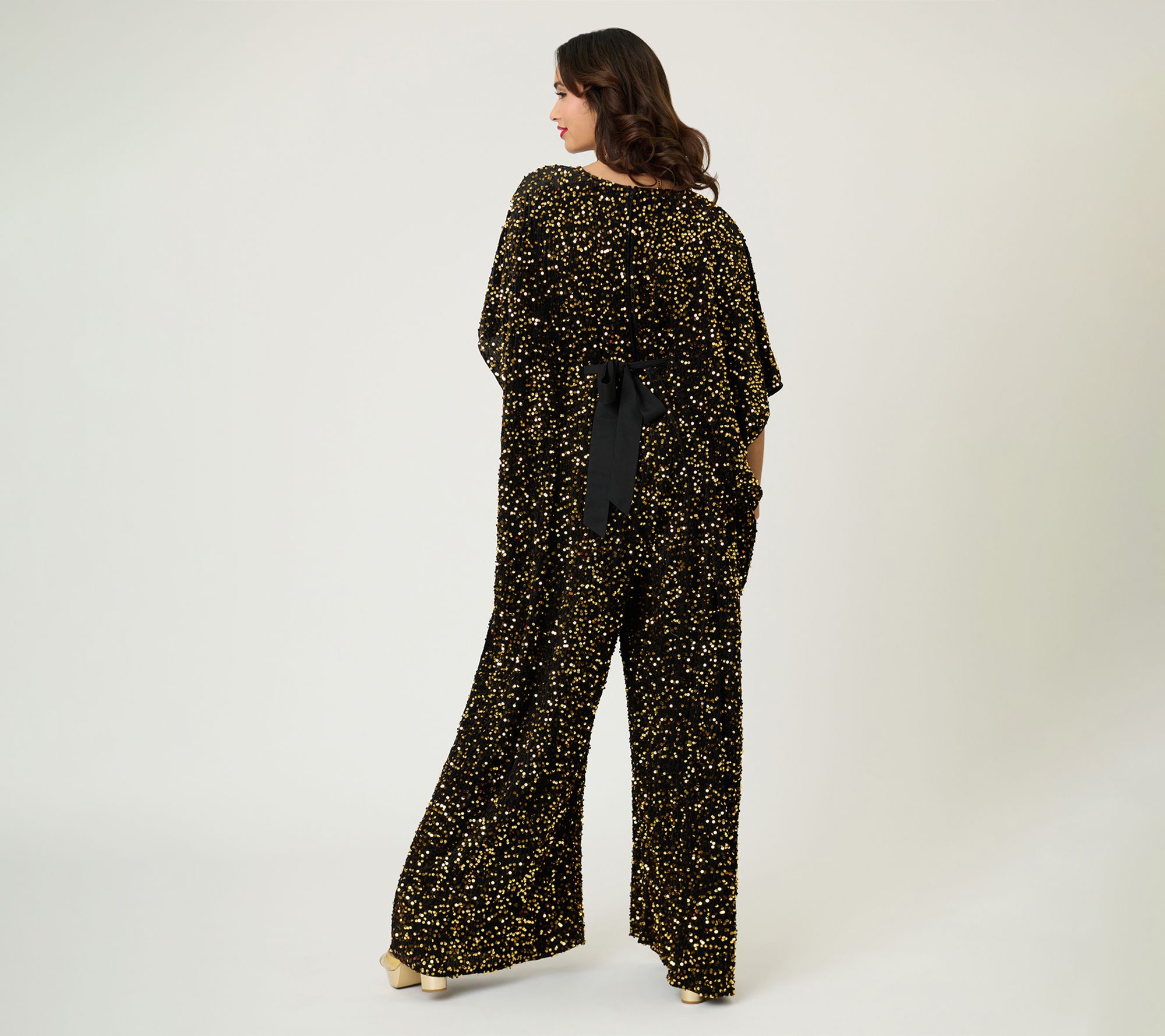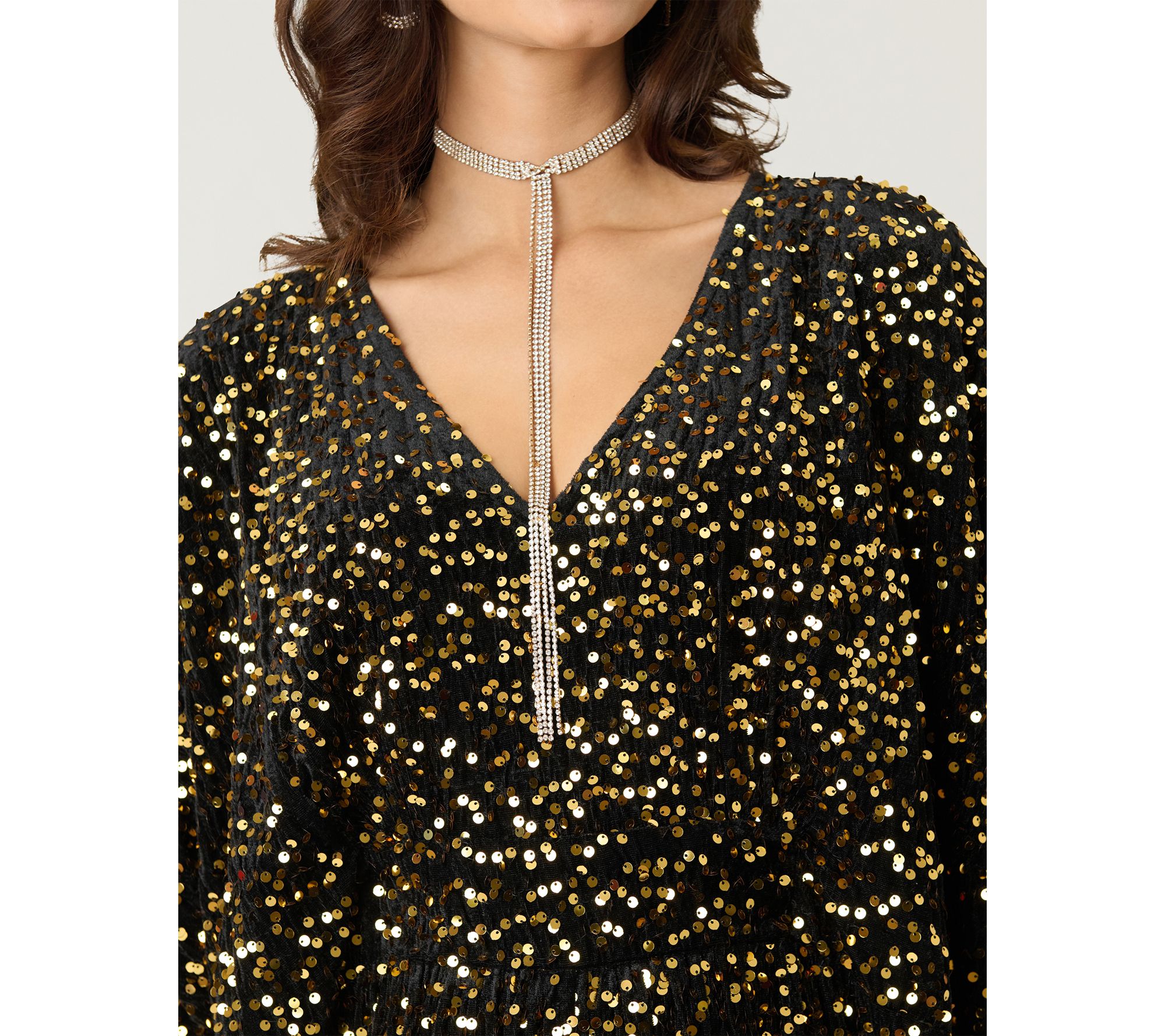 • Features: caftan sleeves, V-neckline, allover gold sequin design