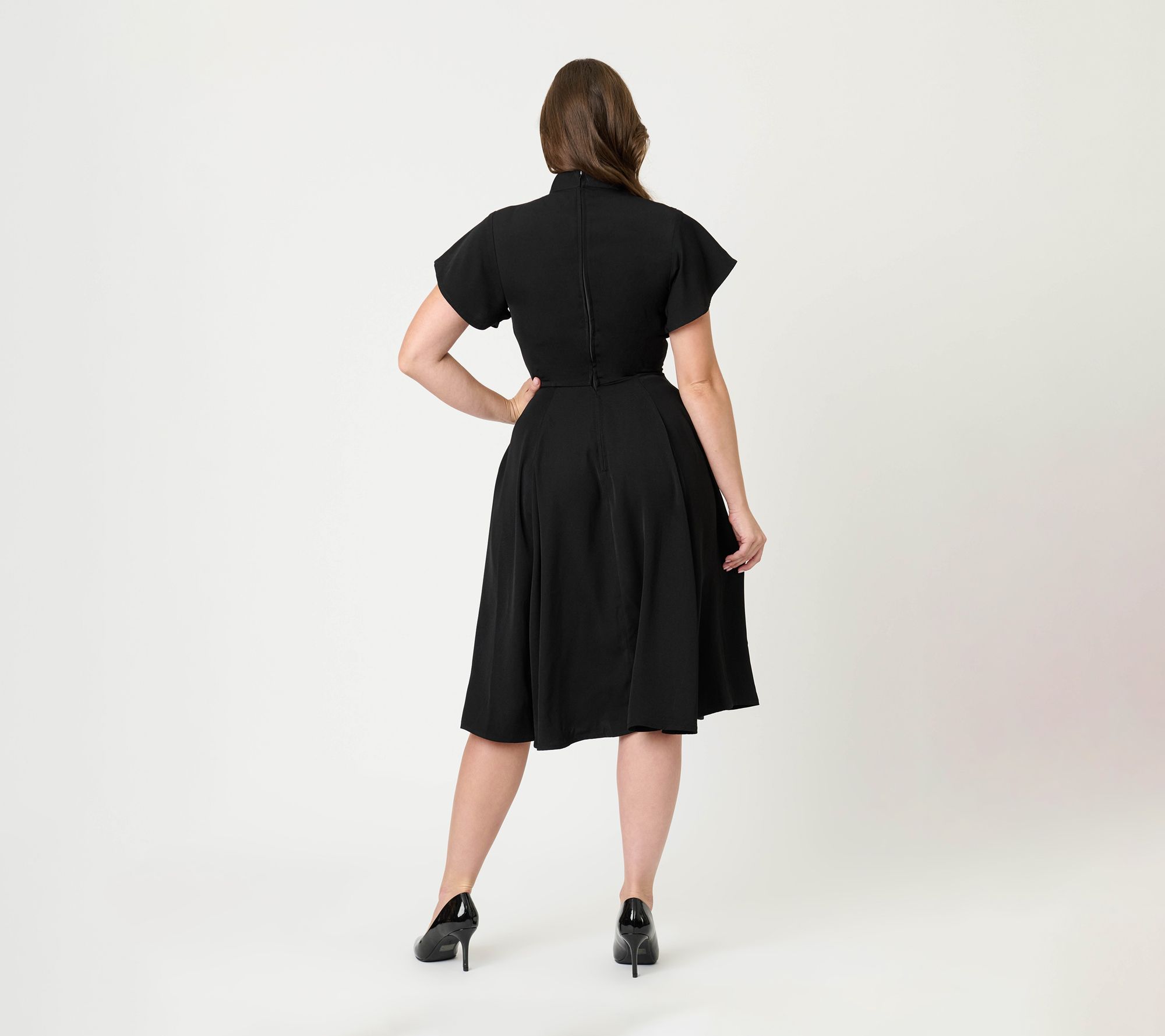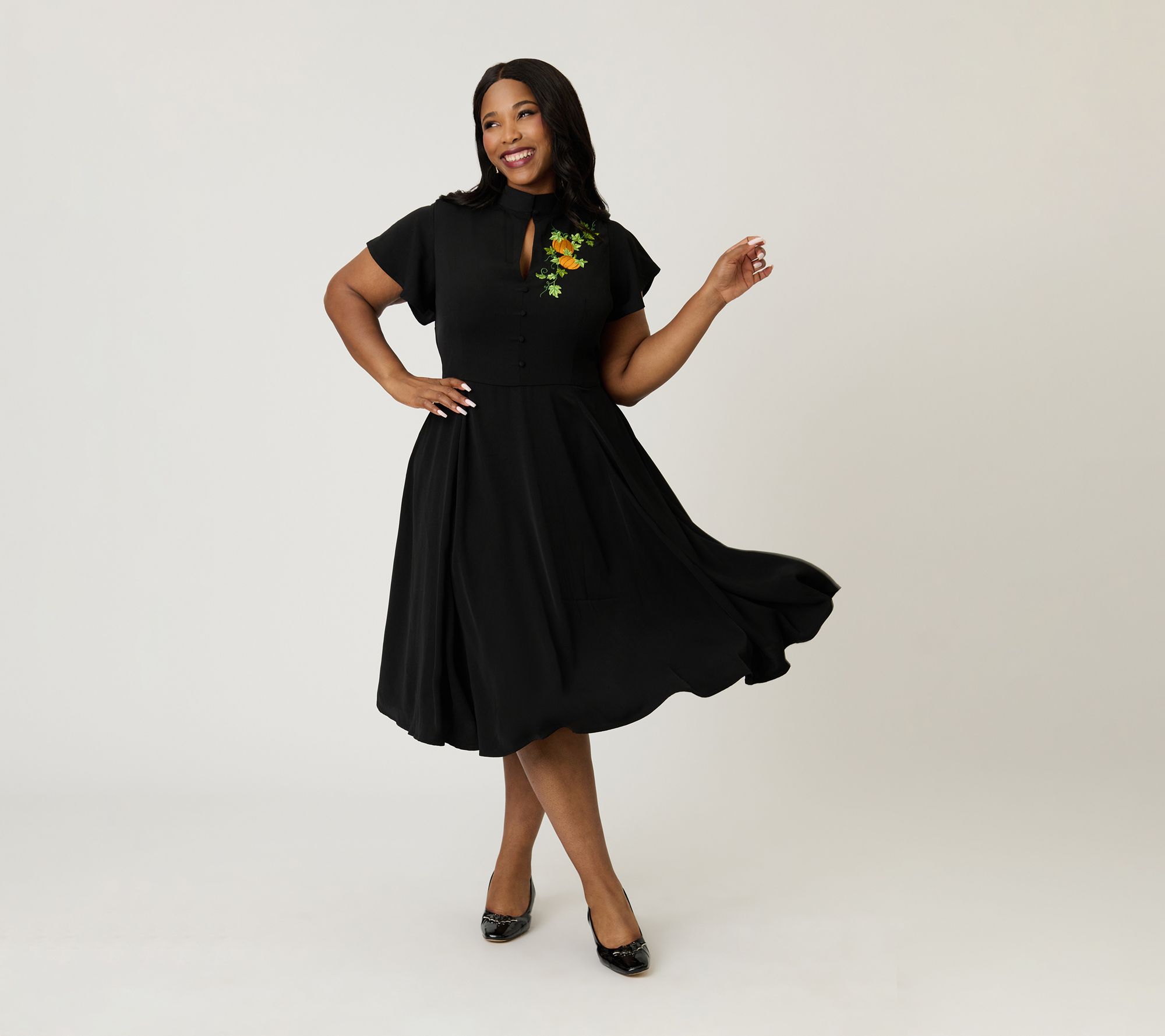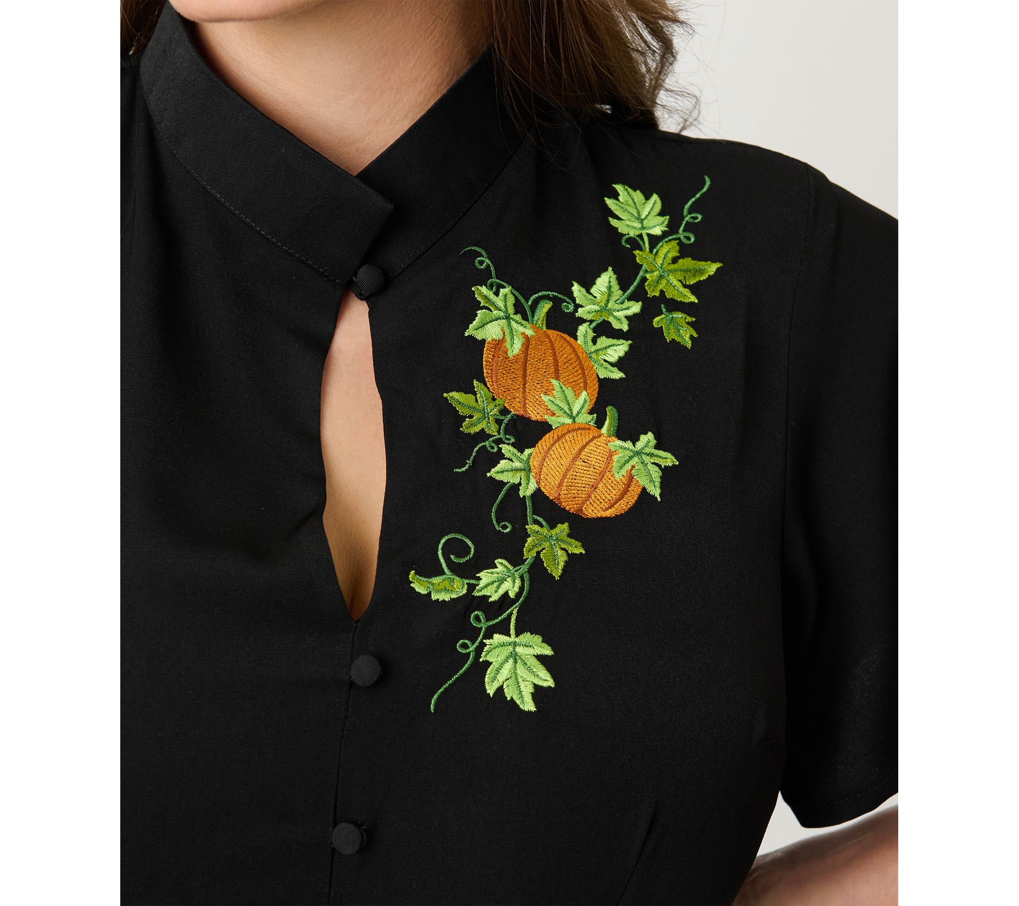 • Features: button-front closure, high mock-neck collar, embroidered pumpkin detailing, cap sleeves, seamed waist, paneled A-line swing skirt, straight hem, hidden side pockets, back zipper