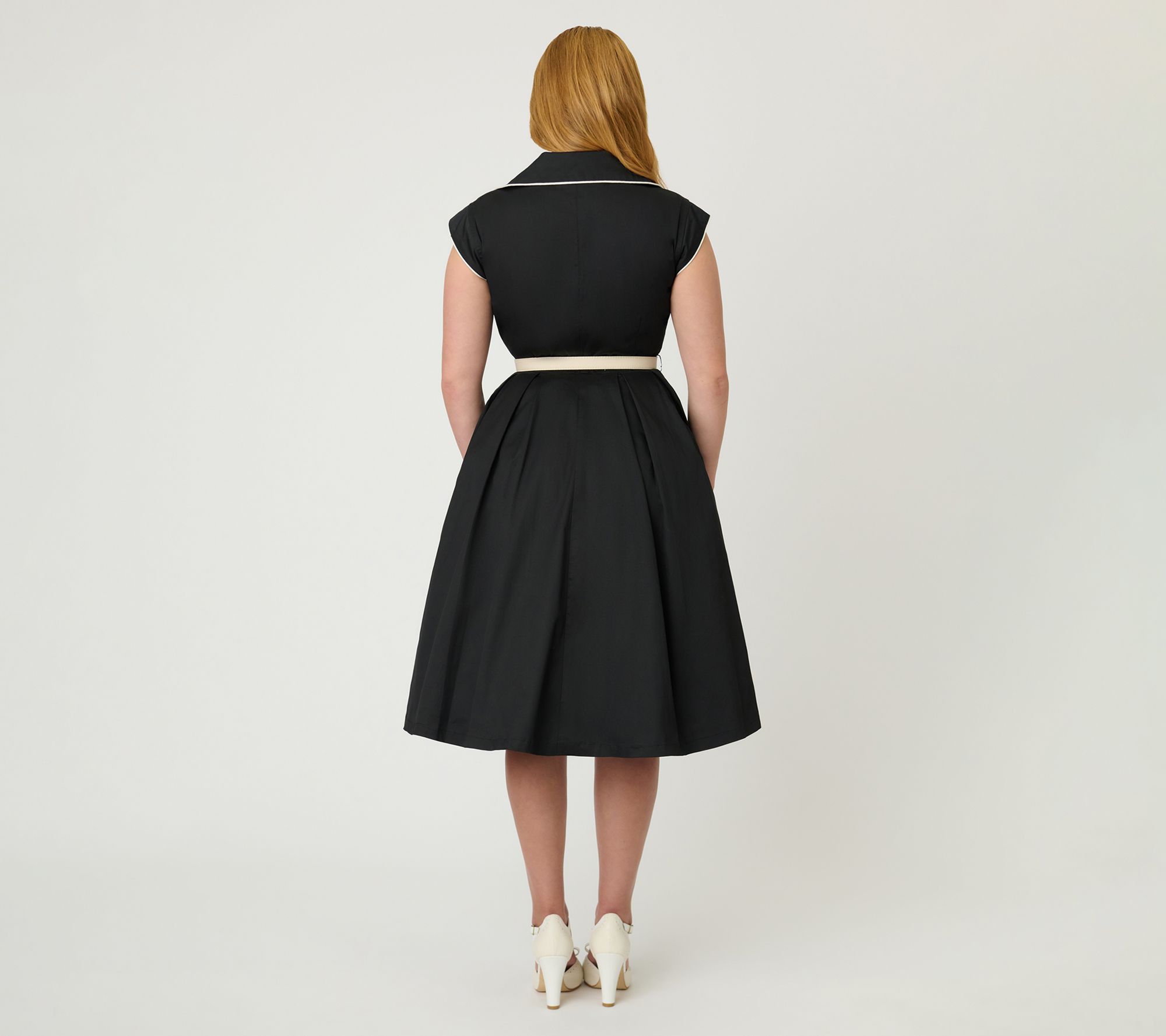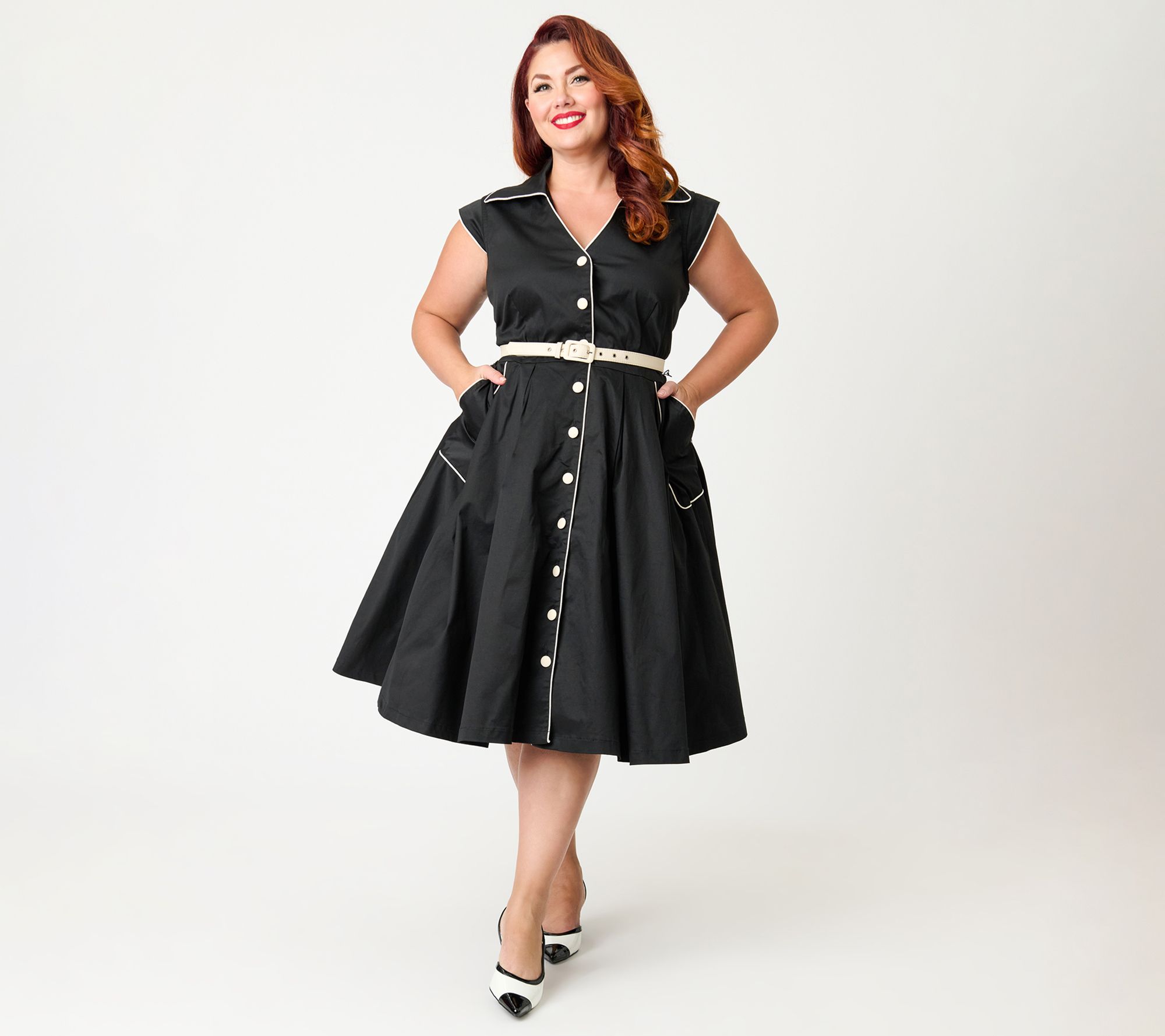 Slip into an easygoing mood with this woven A-line dress, styled in classic black with crisp white piping and a flattering button-front design. The sleeveless cut and fold-over collar pair effortlessly for lunch dates, office meetings, or busy days around town, while the adjustable belt and side pockets add function and flair to your routine. From Unique Vintage.