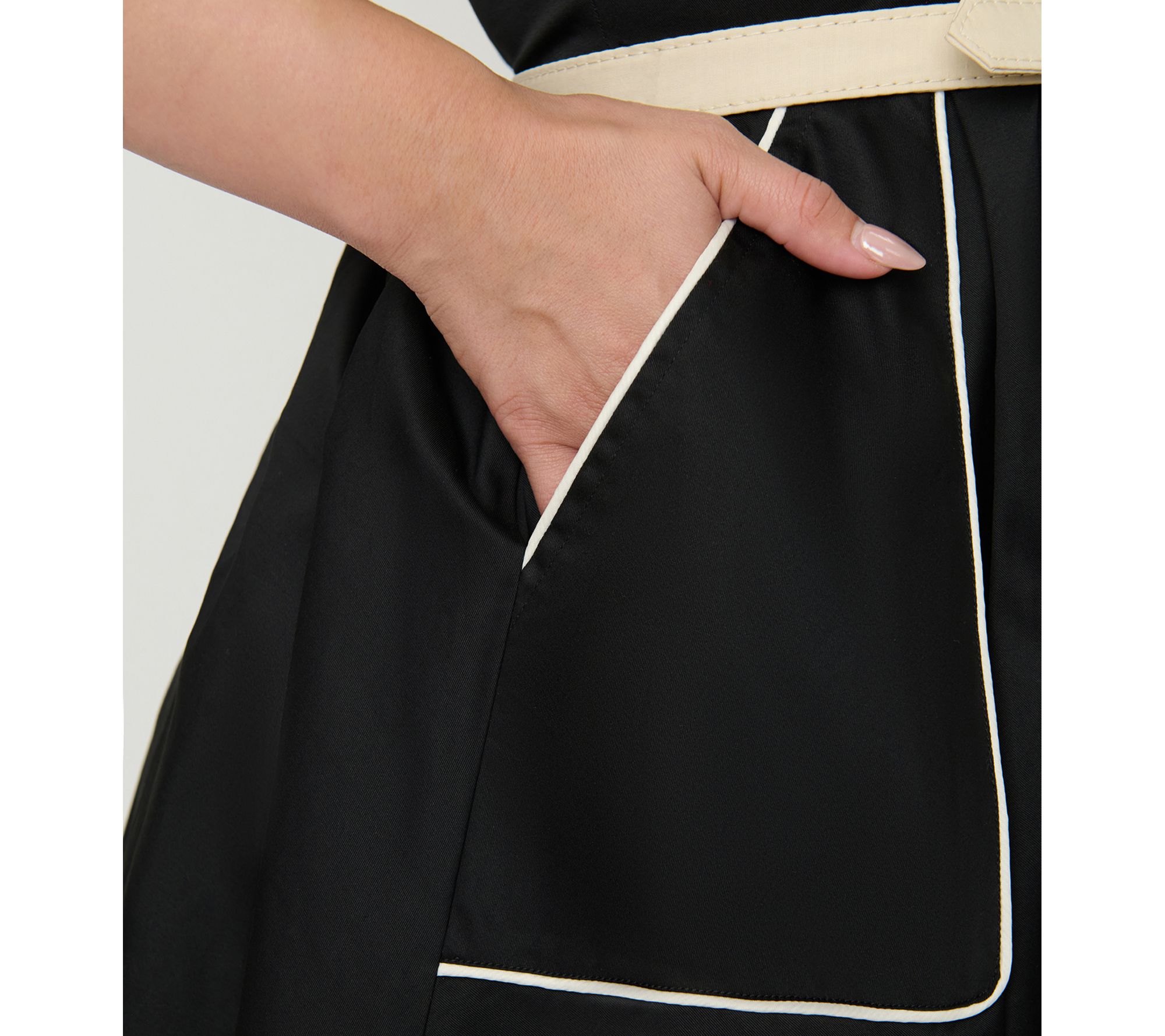 • Features: fold-over collar, sleeveless, knee length, white piping detail, side pockets, adjustable belt