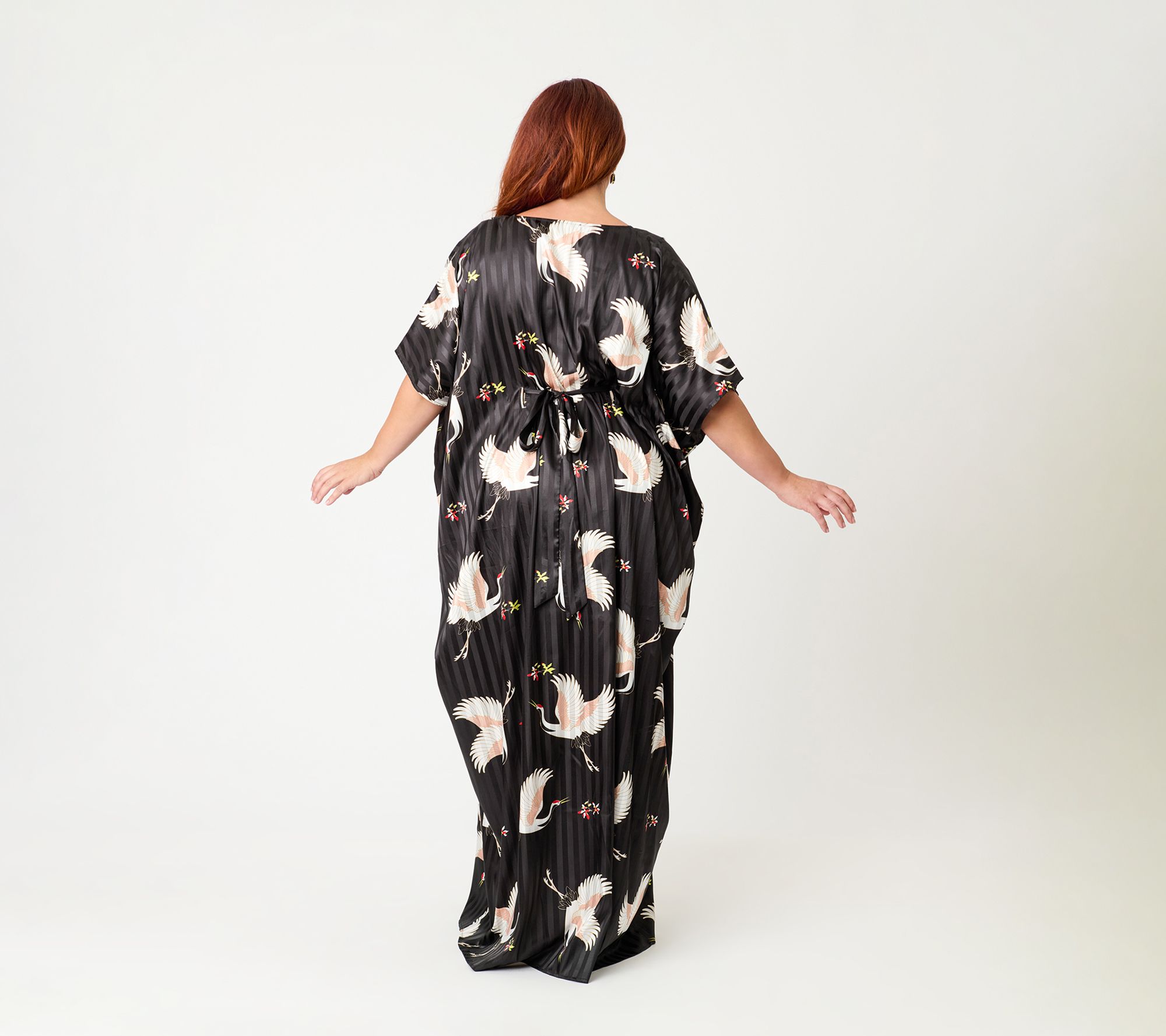 • Features: V-neck; 3/4-length sleeves; ankle-length caftan silhouette; no collar; self-tie at waist; crane print on black striped backdrop
