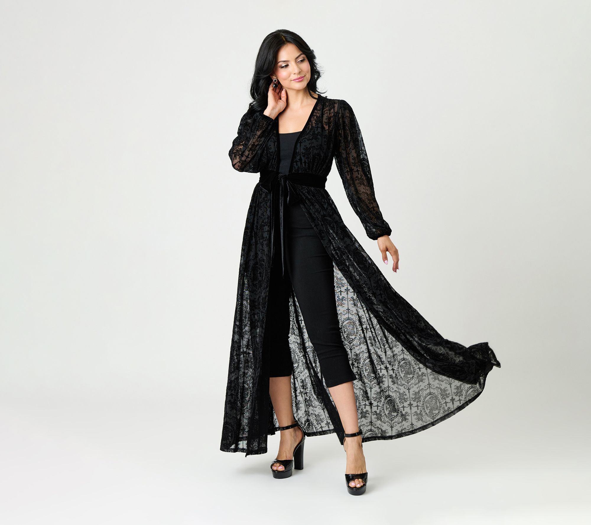 Turn heads as you move through the evening in this dramatic duster, blending vintage-inspired style with soft flocked details for a touch of Hollywood glamour. Whether thrown over jeans for an art gallery stroll or layered atop your favorite dress for a night out, this piece brings drama and sophistication to any look. From Unique Vintage.