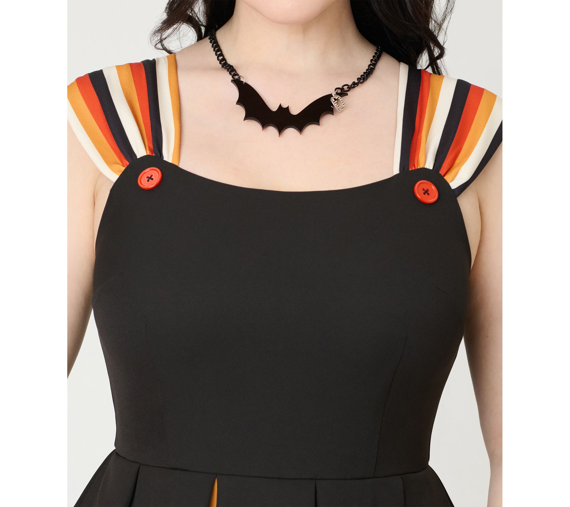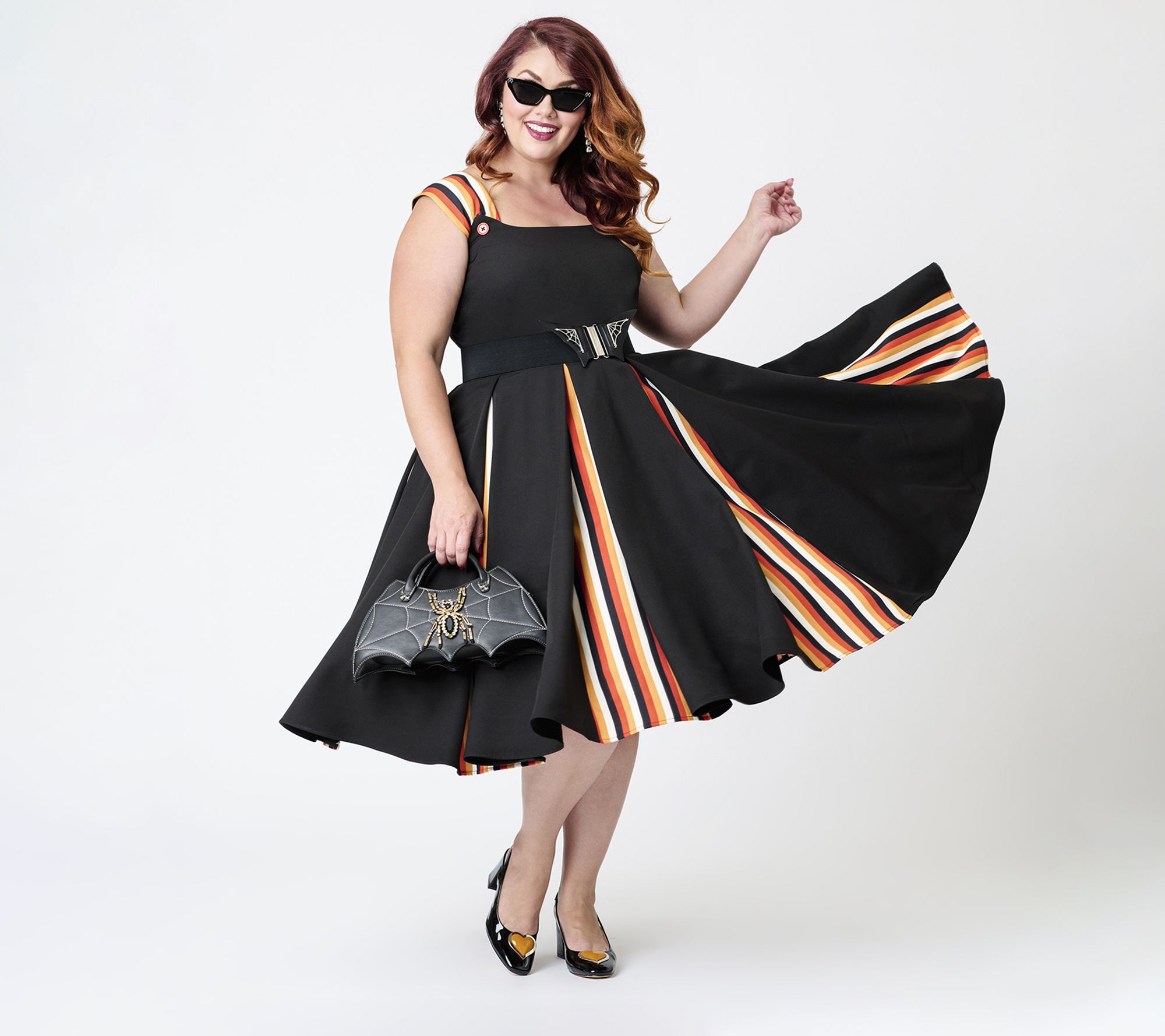 Bring a playful touch to fall celebrations with this A-line swing dress that brightens every haunted house gathering or spirited seasonal party. Its striped skirt and bold godets, sweet square neckline, and side pockets make it a comfortable choice that transitions easily from daytime festivities to evening fun. From Unique Vintage.