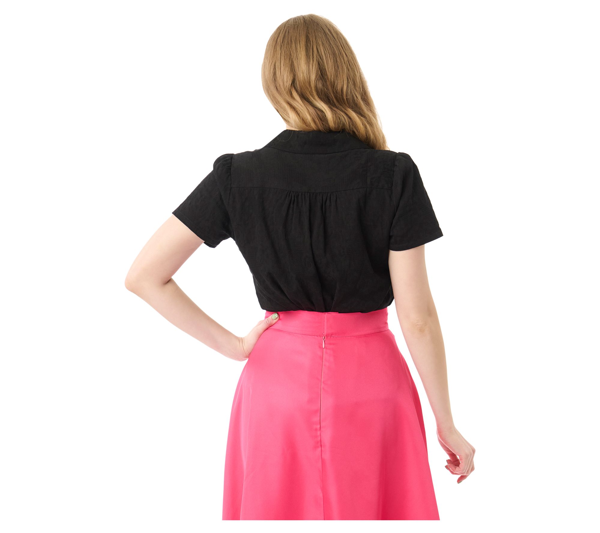 • Features: floral jacquard pattern, fold-over collar, short sleeves, button-front closure
