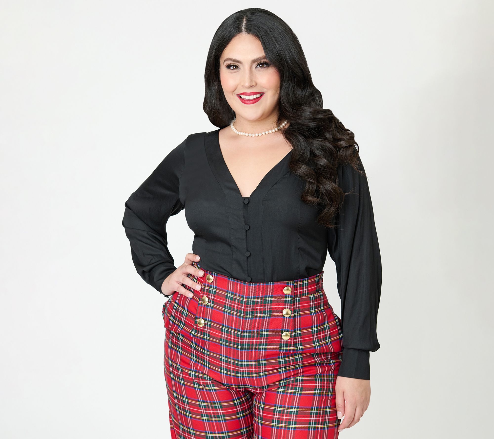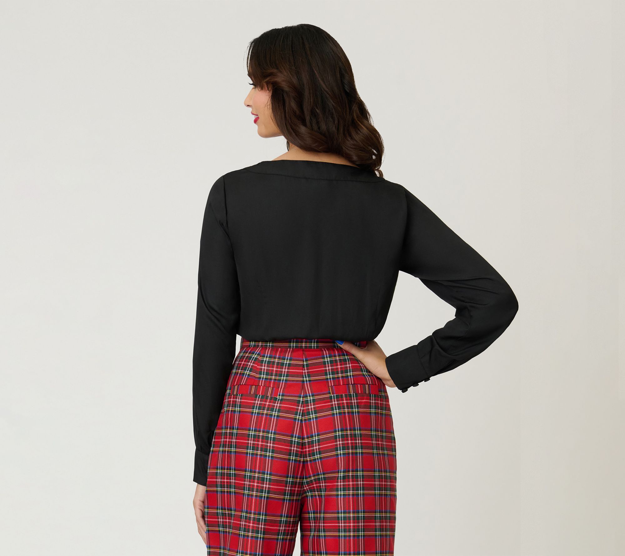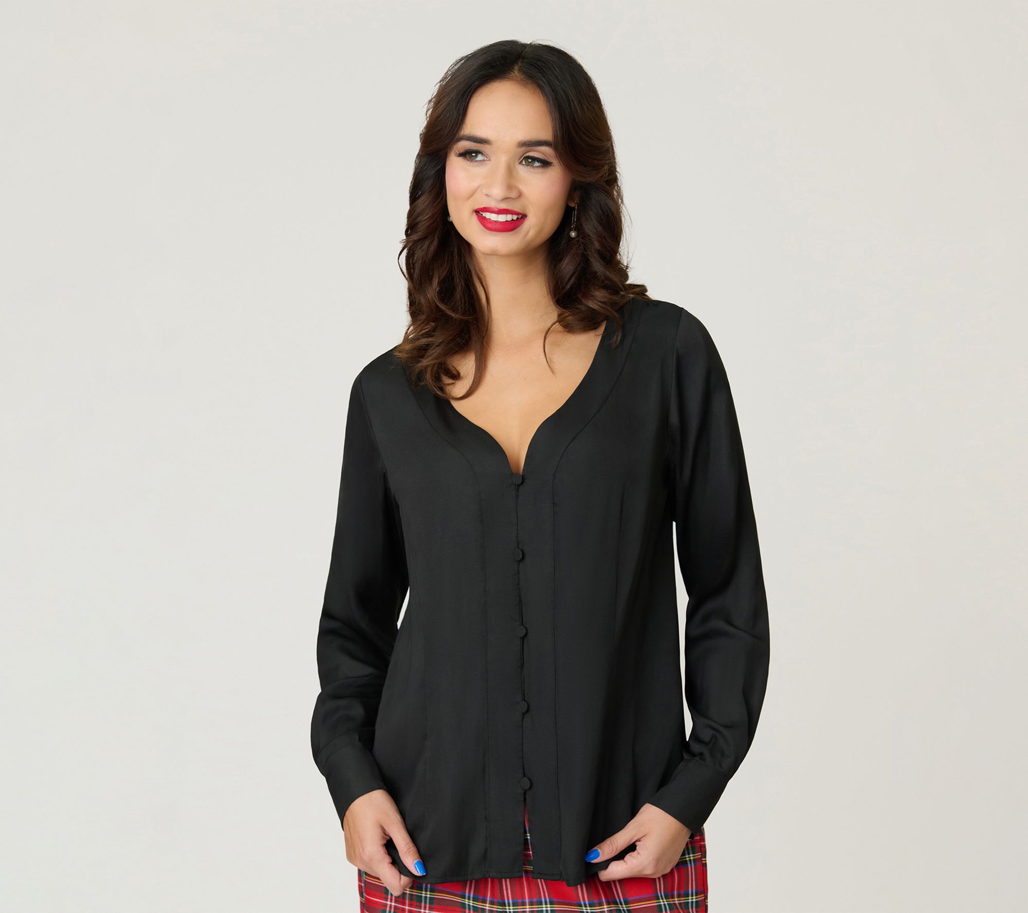 Go from desk to dinner with this chic blouse, designed in a lightweight woven fabric and a rich black hue. The button-front style and V-neckline lend sophisticated appeal, while the long sleeves with button cuffs offer effortless elegance for any occasion. From Unique Vintage.