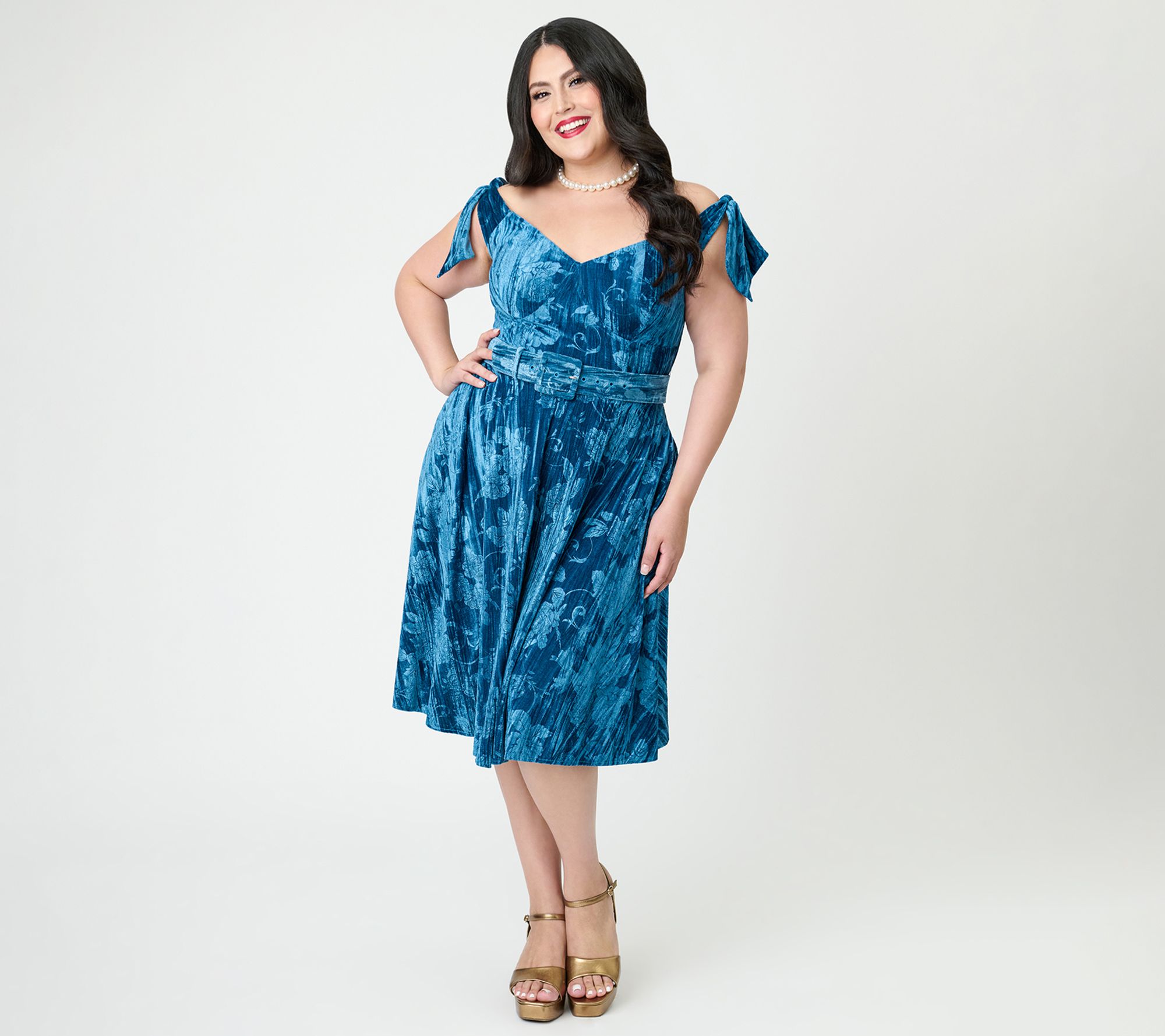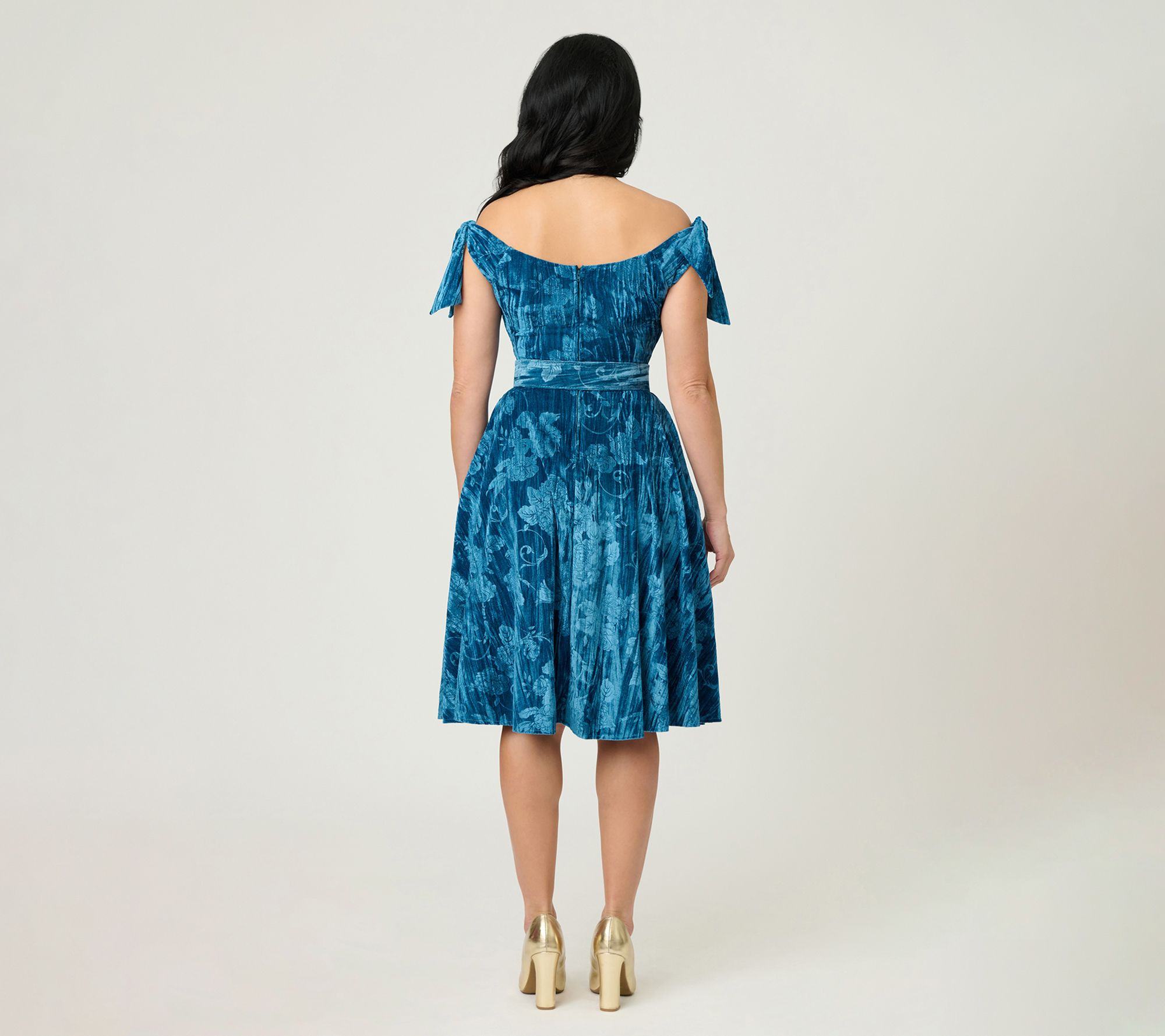 Unique Vintage Blue Floral Embossed Velvet Prairie Swing Dress