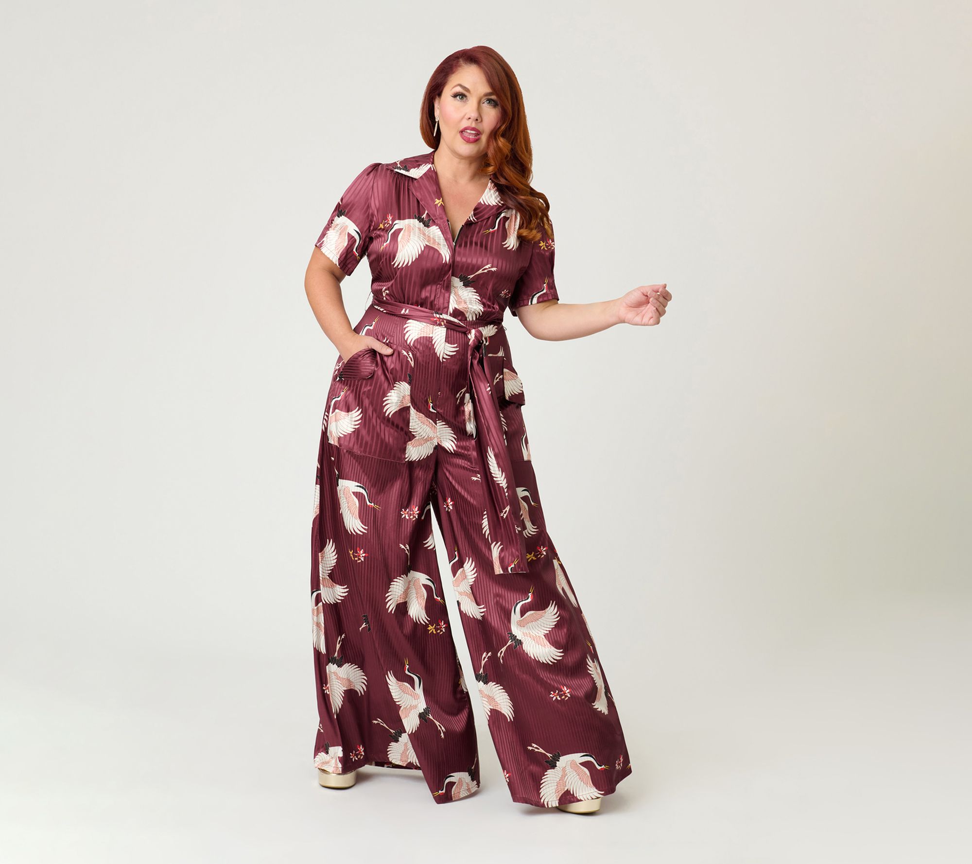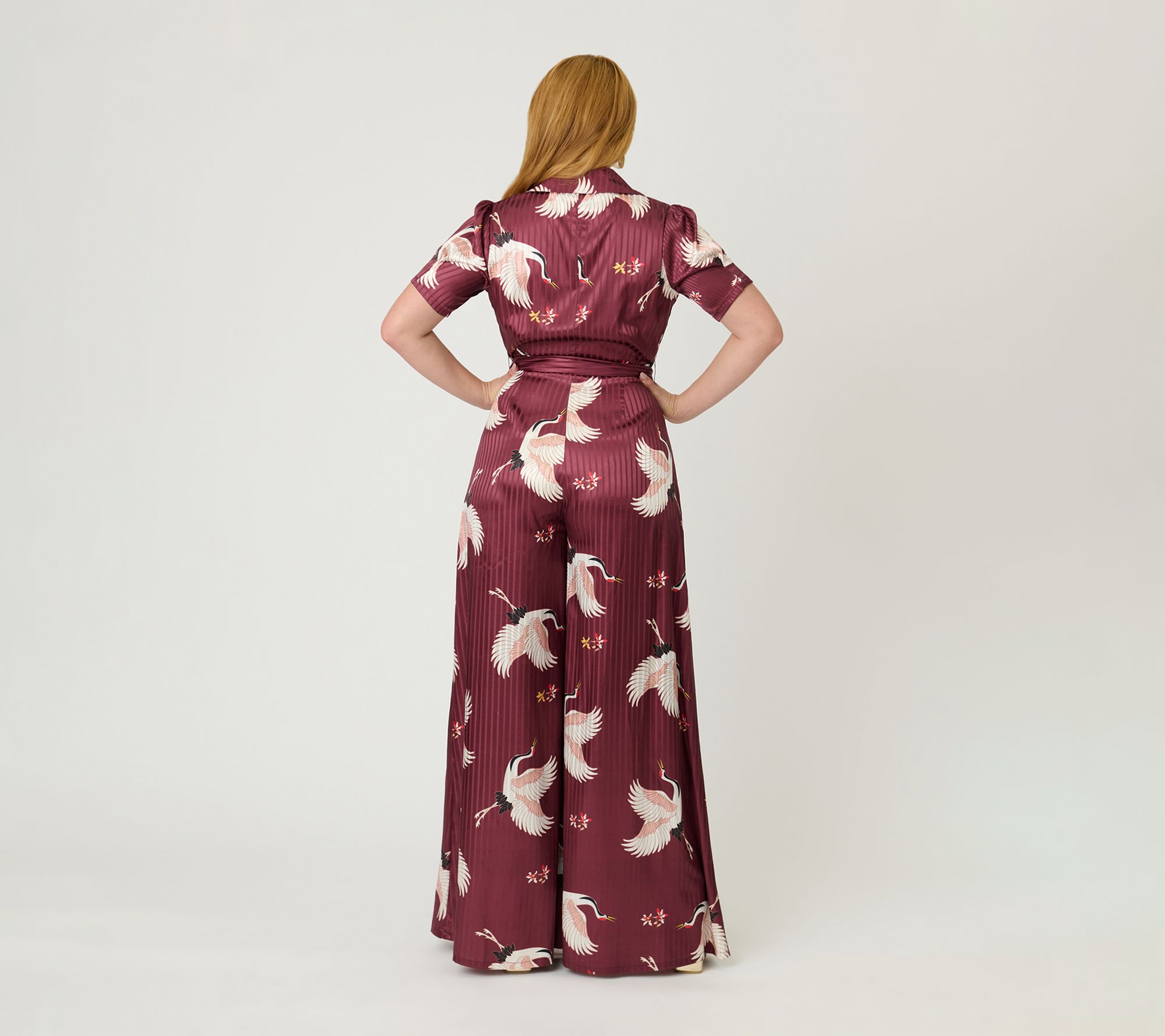 A statement jumpsuit that instantly transforms your look -- whether you're attending a special event or heading out for a stylish brunch. The lively burgundy hue paired with white crane motifs brings an artistic flair, while the flared silhouette offers comfort and movement for those days when you want to stand out. From Unique Vintage.
