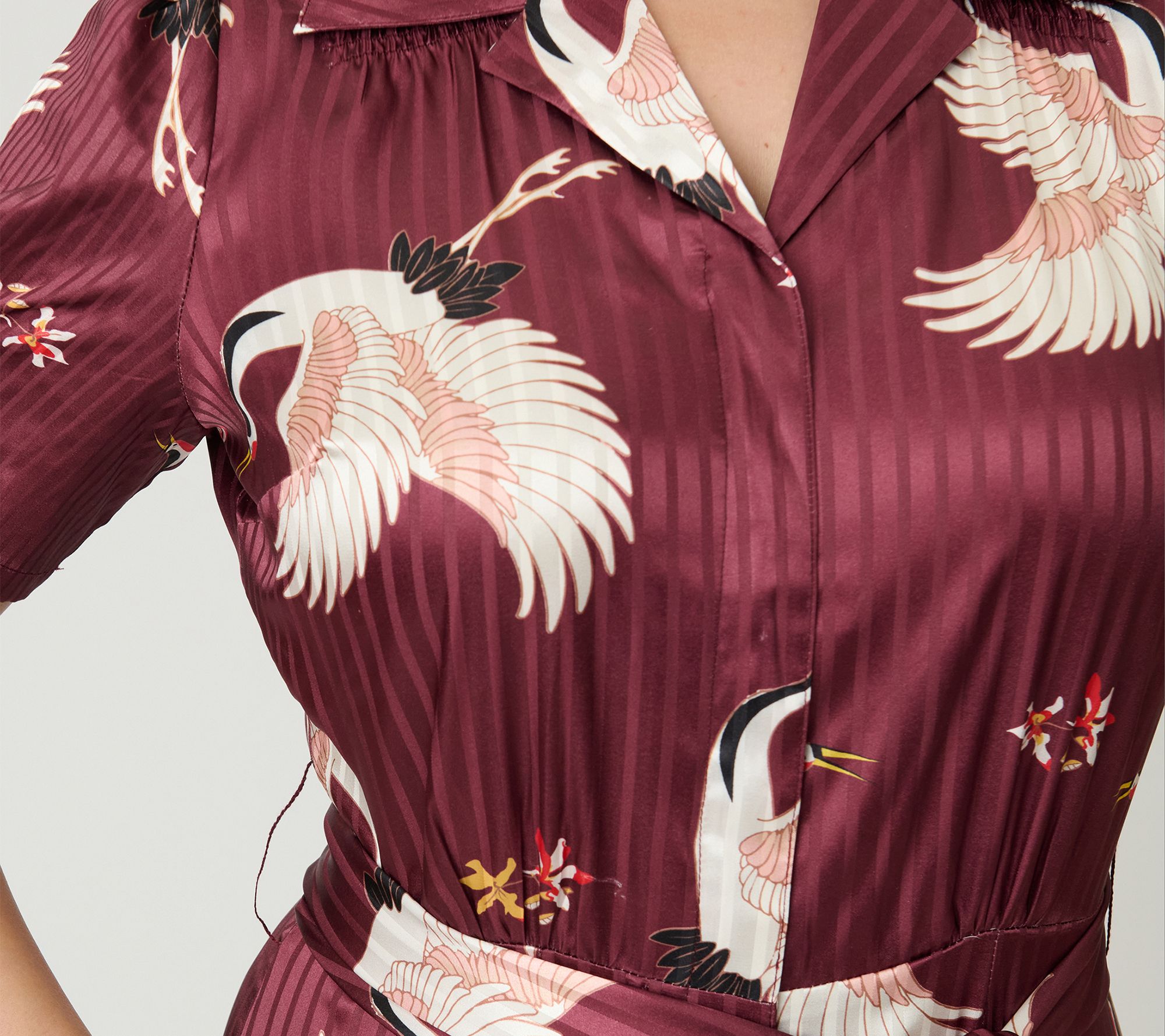 • Features: notch collar, crane pattern, self-tie sash, short puff sleeves