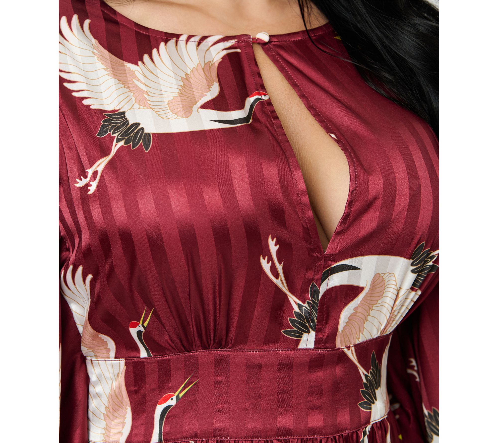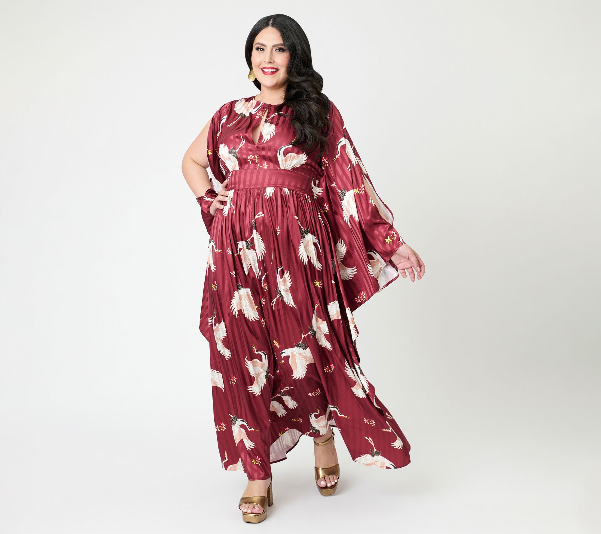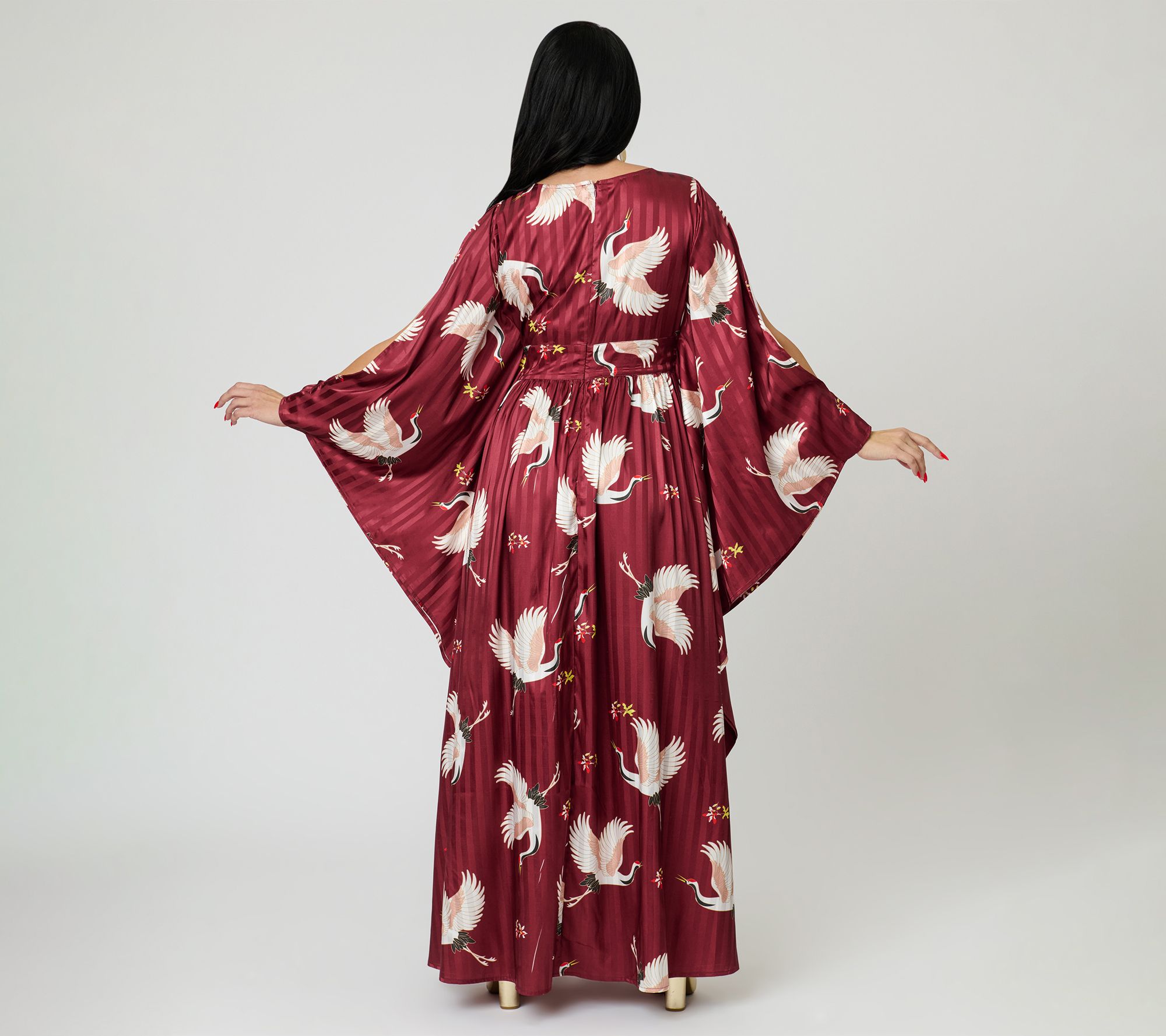 • Features: scoop neckline, no collar, long flutter sleeves, ankle length, burgundy stripe sateen with white crane print