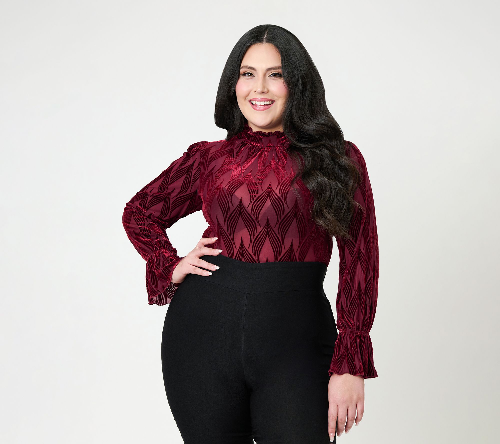 Whether you're heading out for dinner or dressing up a casual day, this velvet burnout blouse brings a touch of elegance to your wardrobe. Rich, burgundy leaf motifs add an artful flair, while soft texture creates a luxe feel for any occasion. From Unique Vintage.