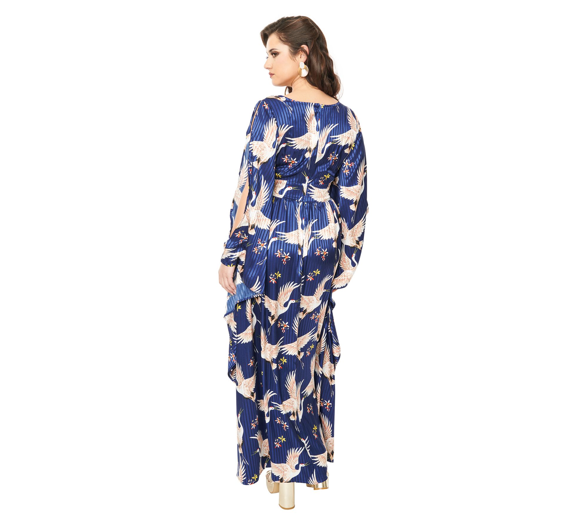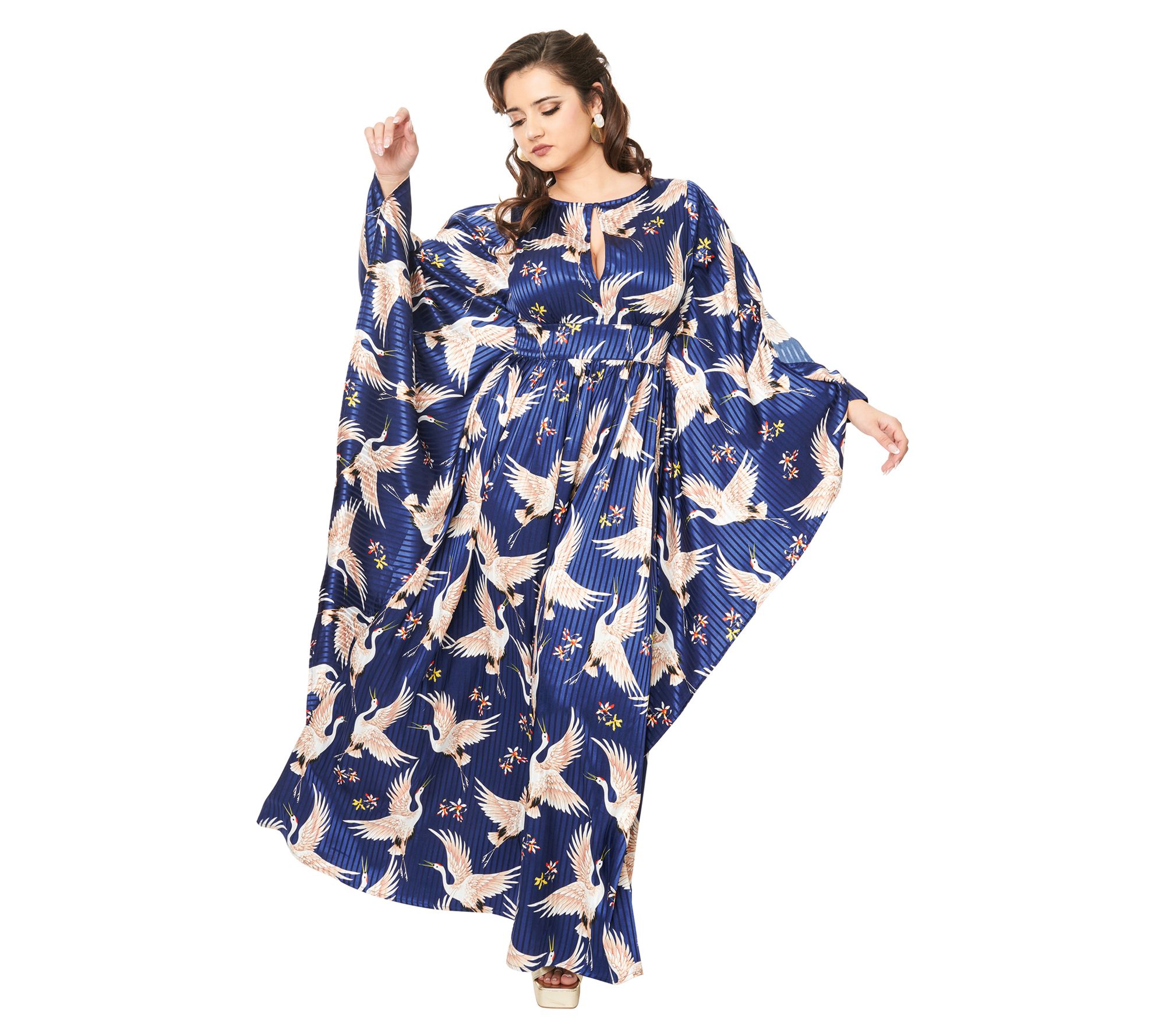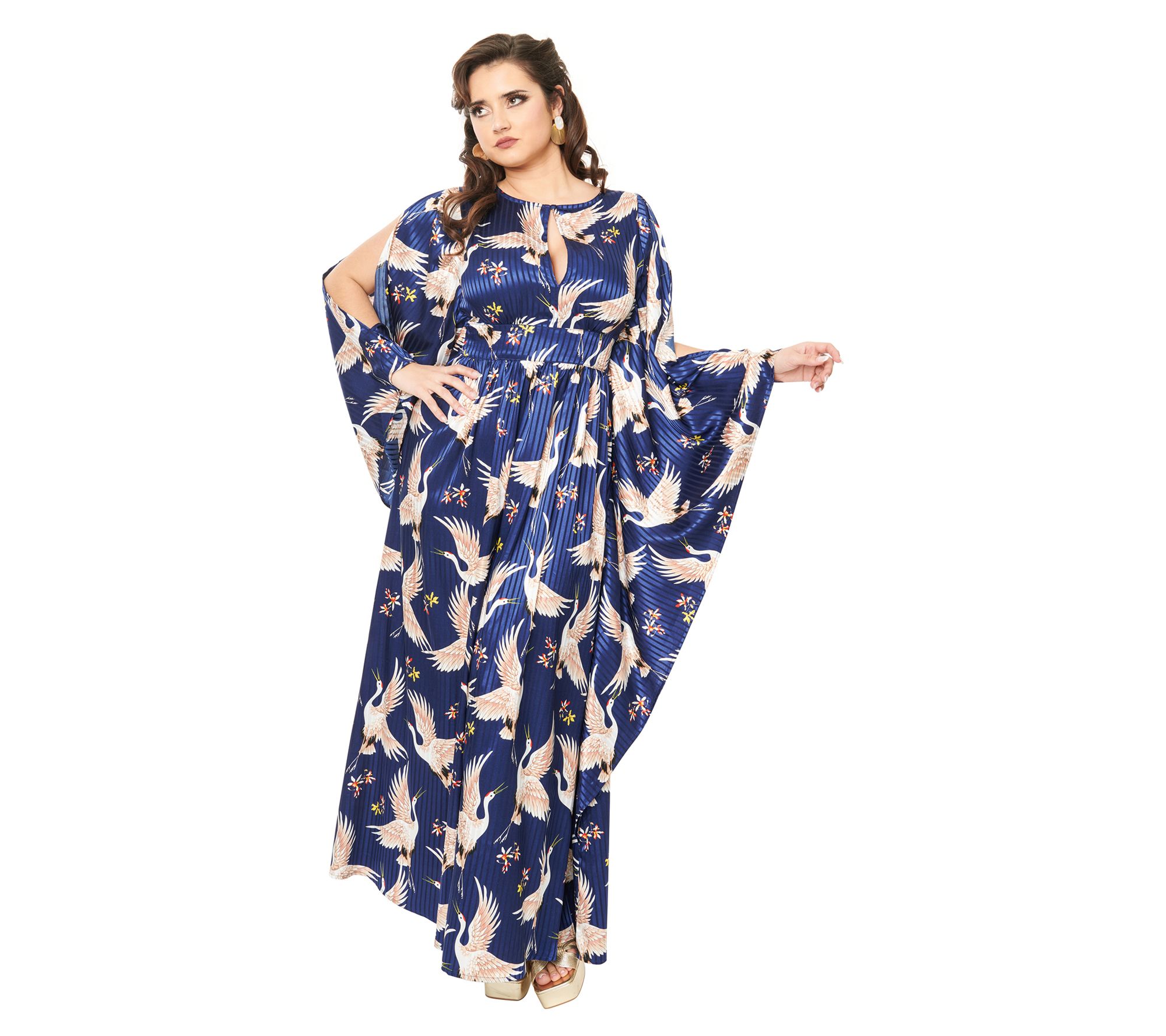 Step into a world of elegance and vintage charm with this ankle-length caftan inspired by the 1960s. It features a captivating crane print set against a navy background, a seductive front button keyhole, and is beautifully framed by long cold shoulder flutter sleeves. From Unique Vintage.