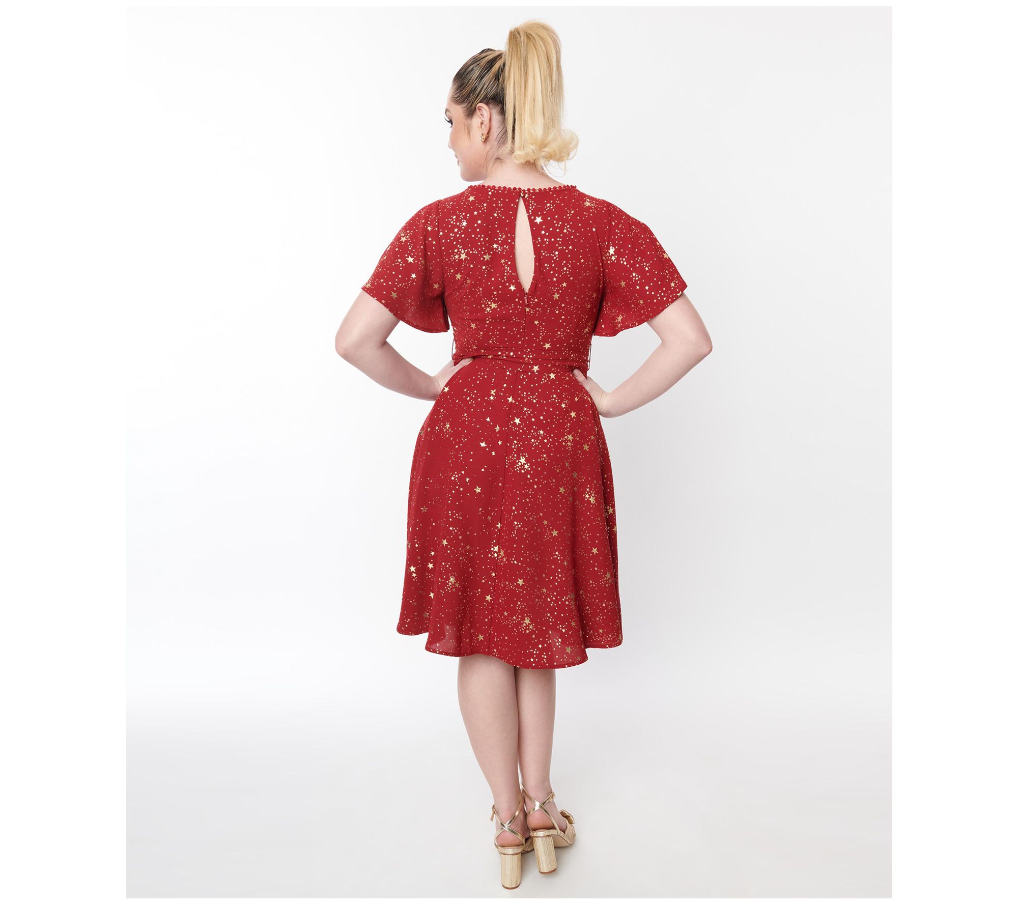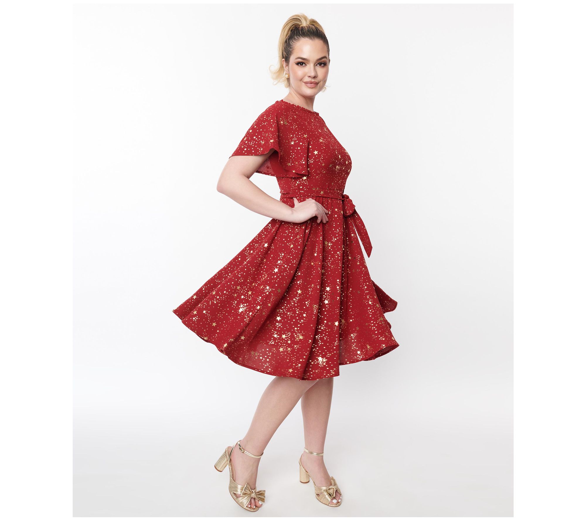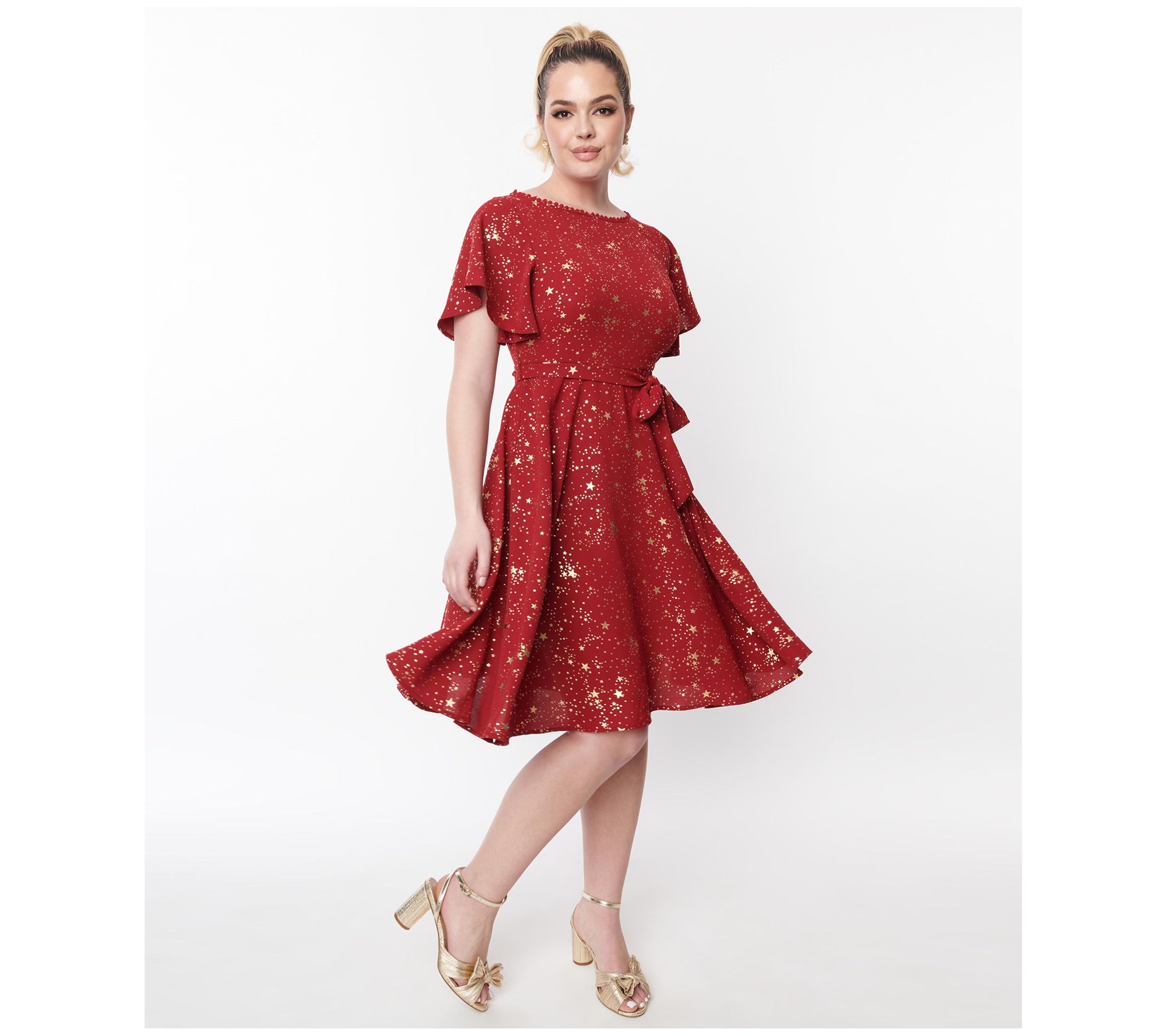 Add throwback flair to your rotation with this romantically styled dress boasting flirty flutter sleeves and a sprinkling of sparkling stars. From Unique Vintage.