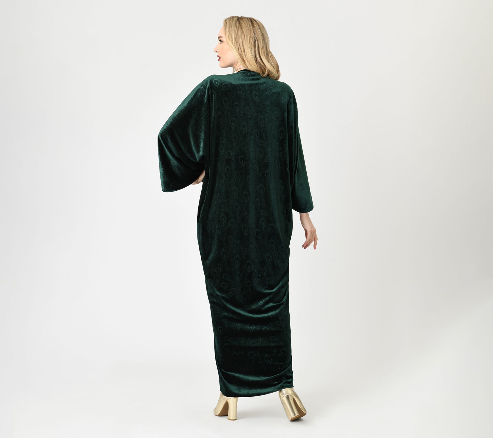 Channel vintage glamour wherever you go in this statement-making velvet kimono. The lush emerald hue and embossed peacock feather design add a touch of drama to evenings out or cozy nights in, while the relaxed fit and 3/4-length sleeves offer effortless sophistication. From Unique Vintage.