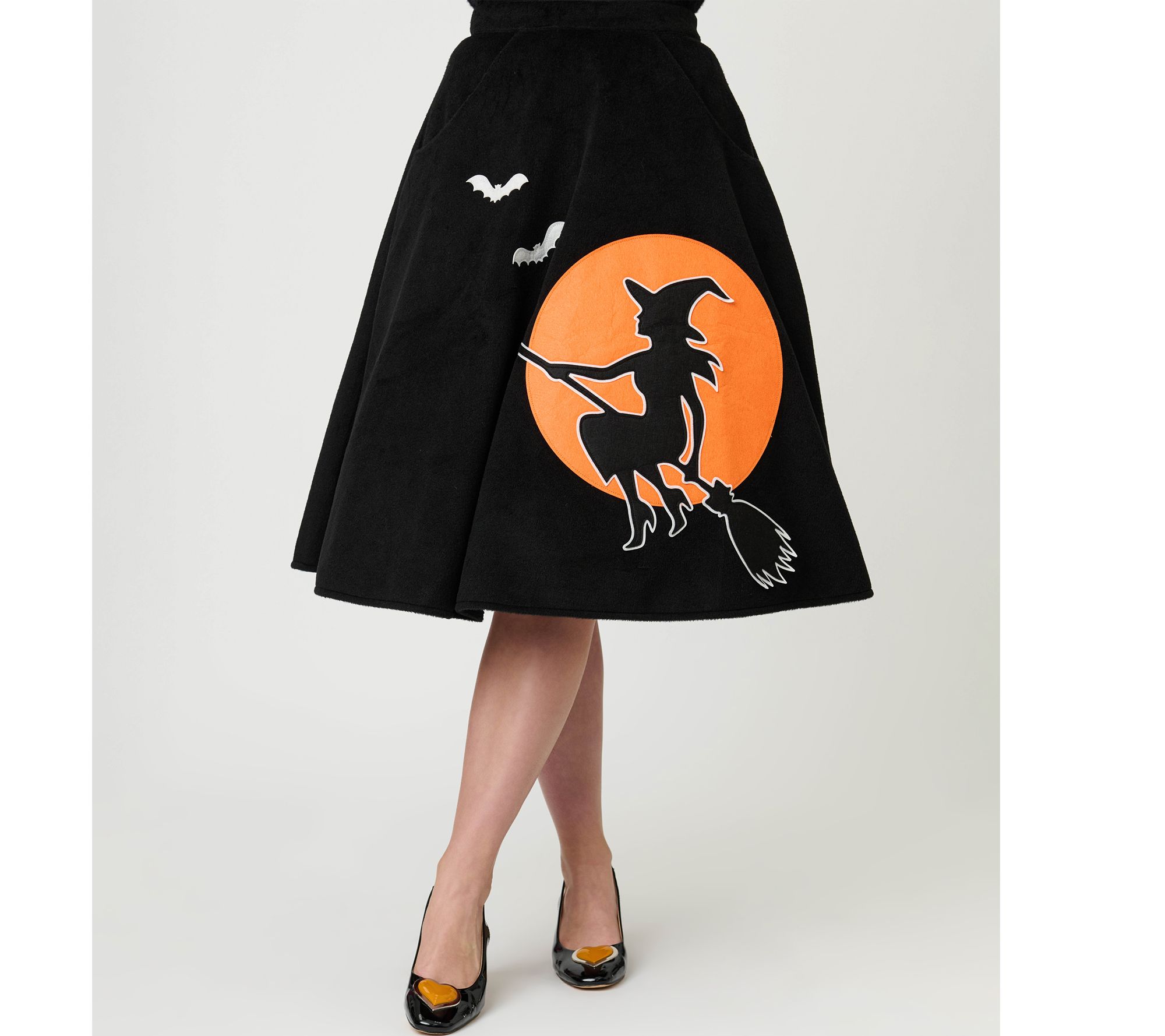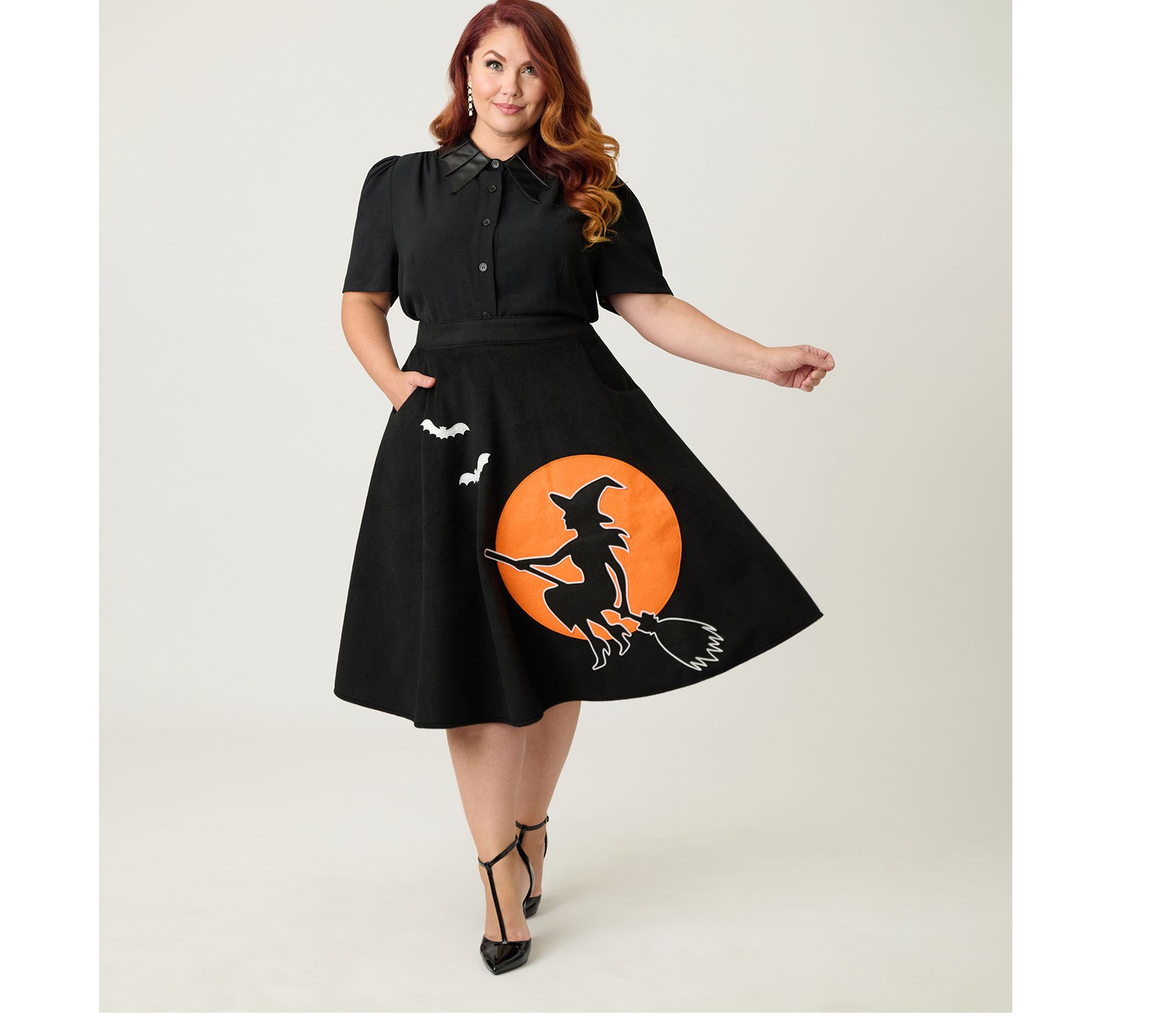 Whether you're meeting friends for milkshakes or adding a dash of whimsy to your weekend stroll, this swing skirt brings retro charm and playful style to any outing. Its enchanting flying witch motif and classic soda shop silhouette promise to turn heads and spark smiles wherever you go. From Unique Vintage.