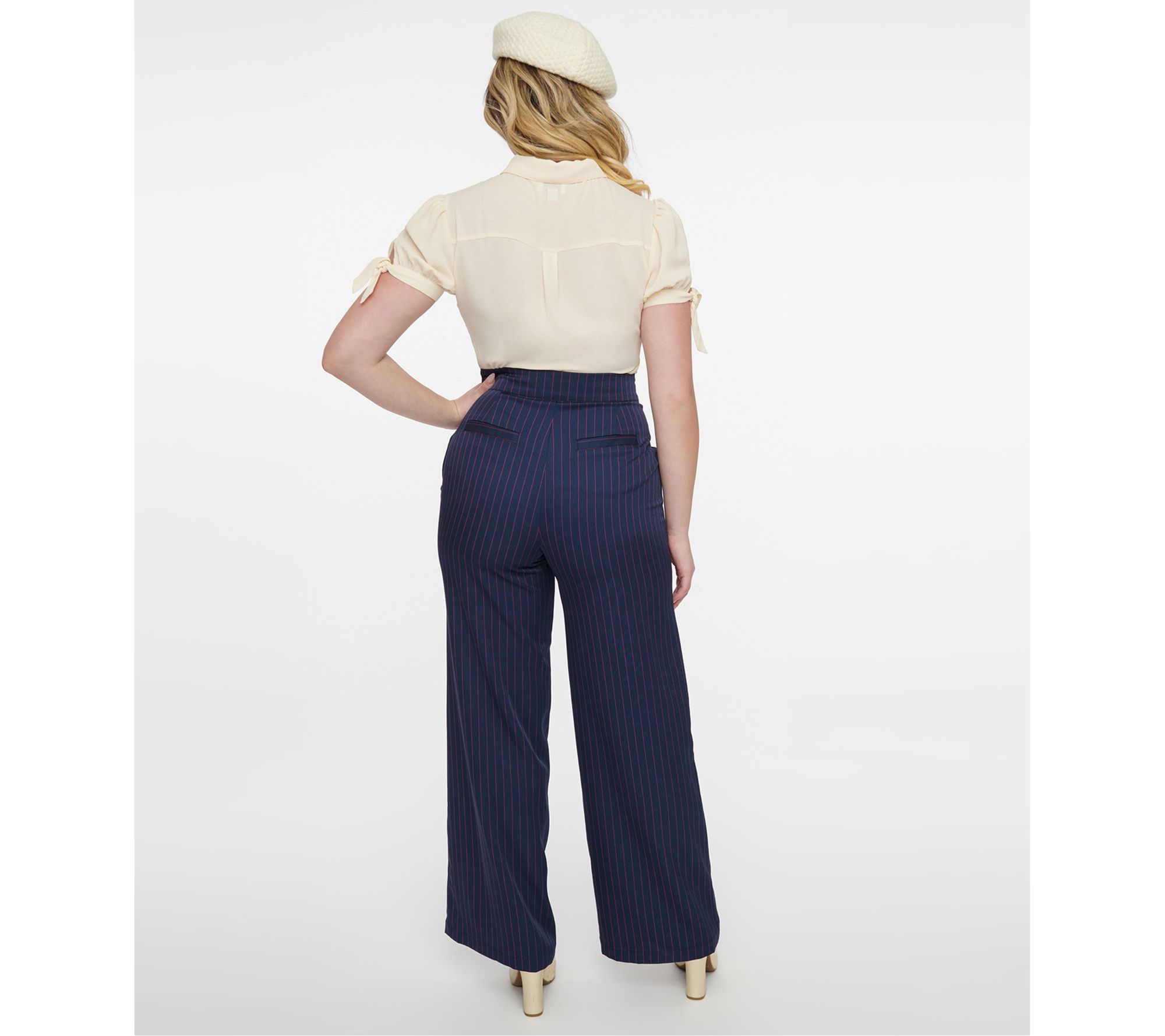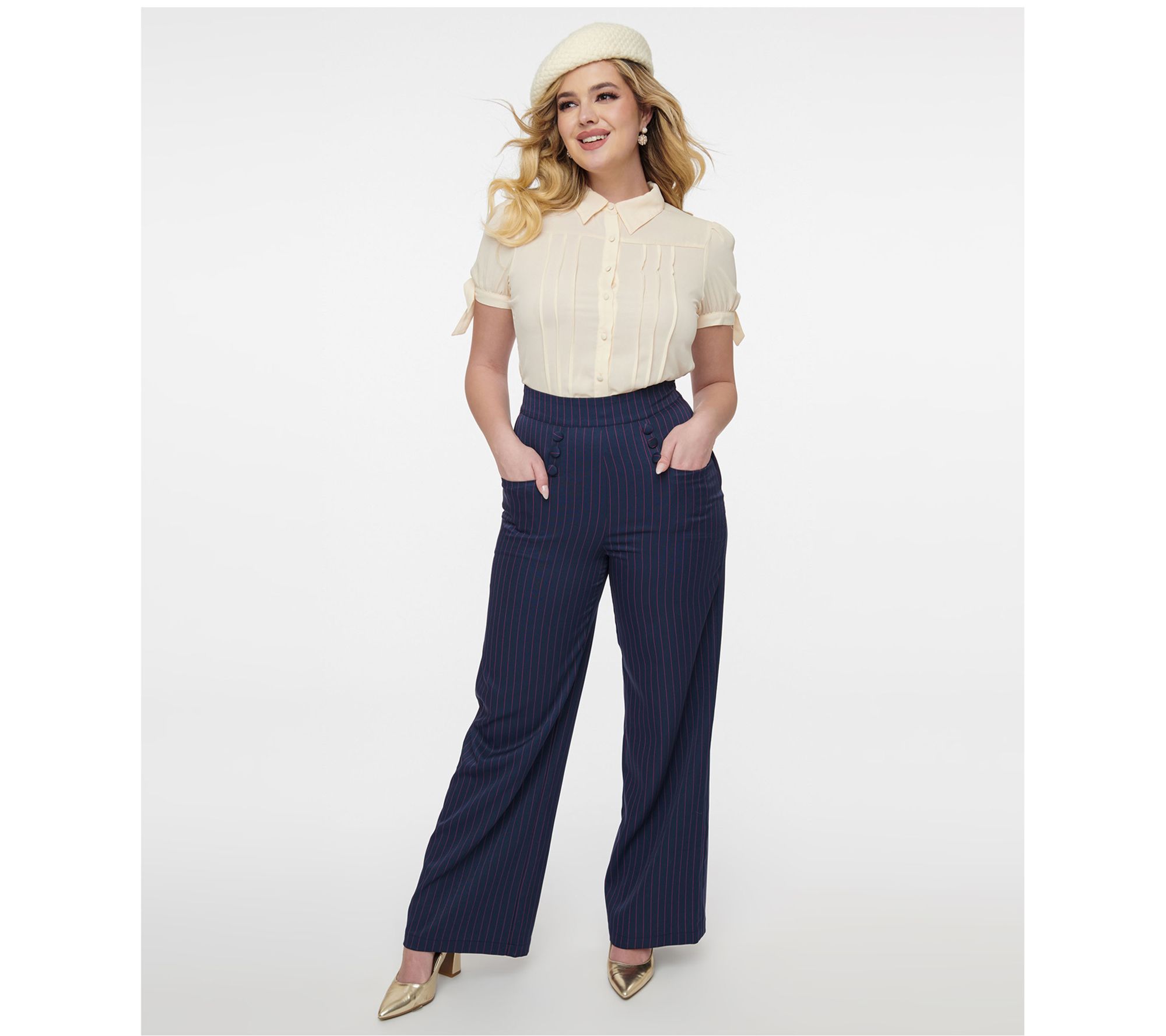 A nod to the classic 1940s sailor style, step into the past with the Unique Vintage Ginger High Waisted Sailor Trouser. The wide leg design not only slims and flatters but also ensures you're ready for any adventure, whether on land or sea. From Unique Vintage.