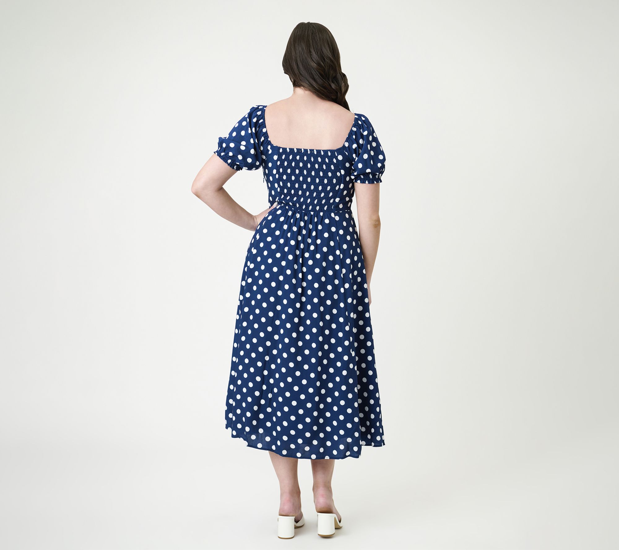 Perfect for brunch dates and holiday celebrations, this A-line midi dress brings playful charm to any gathering with its navy blue woven fabric and whimsical white polka dots. The sweetheart neckline and puff sleeves offer a flattering, feminine silhouette, while the easy mid-calf length lets you move with ease from daytime errands to evening festivities. From Unique Vintage.