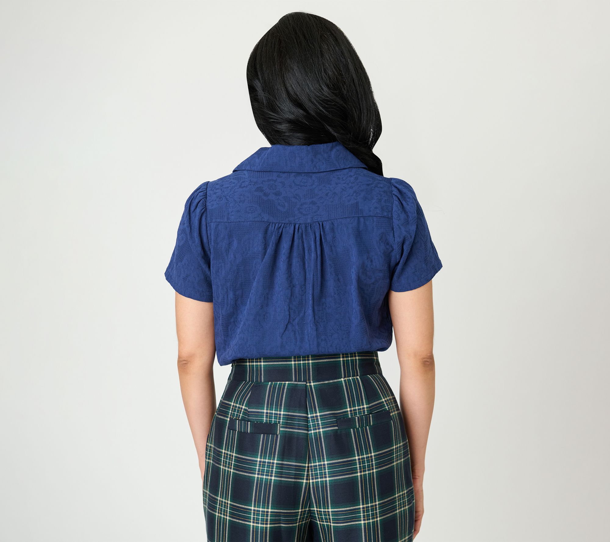• Features: button front closure, notched collar, short sleeves, jacquard pattern, semi-sheer