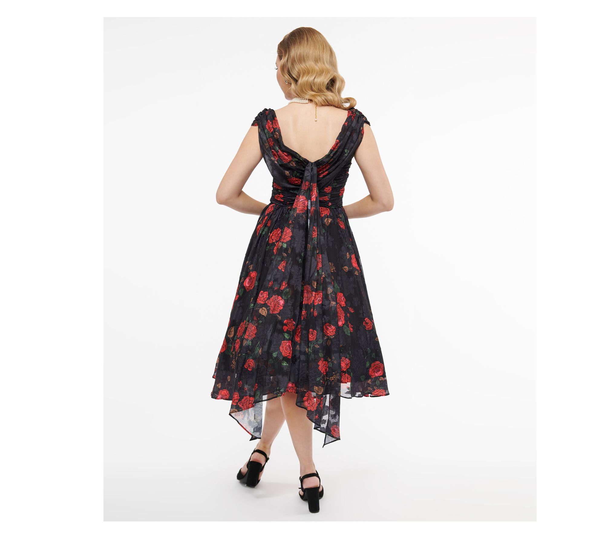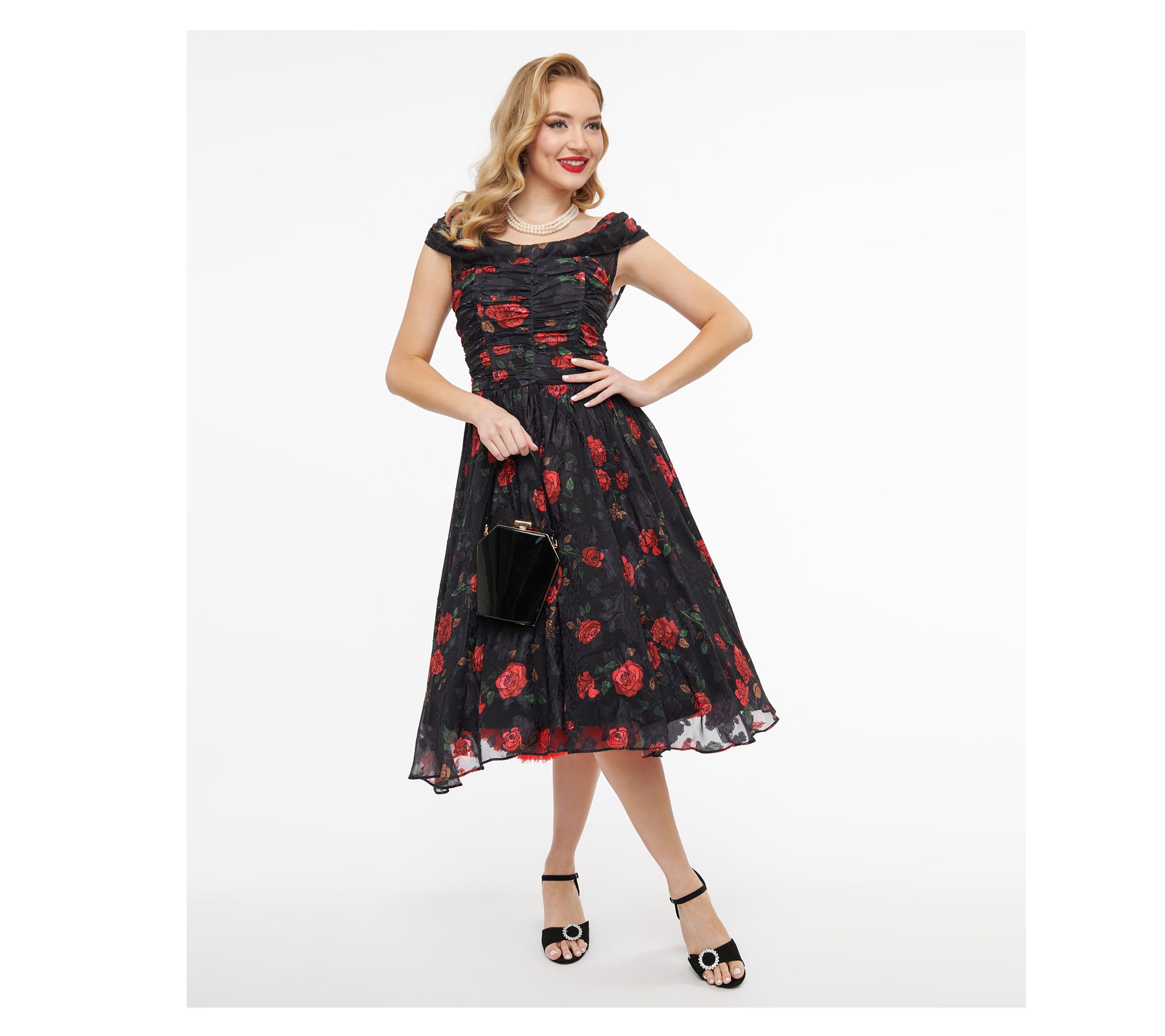 Celebrate! This stunning 1950s-inspired dress features a charming off-the-shoulder neckline and a ruched bodice adorned with striking red roses against a classic black background. From Unique Vintage.
