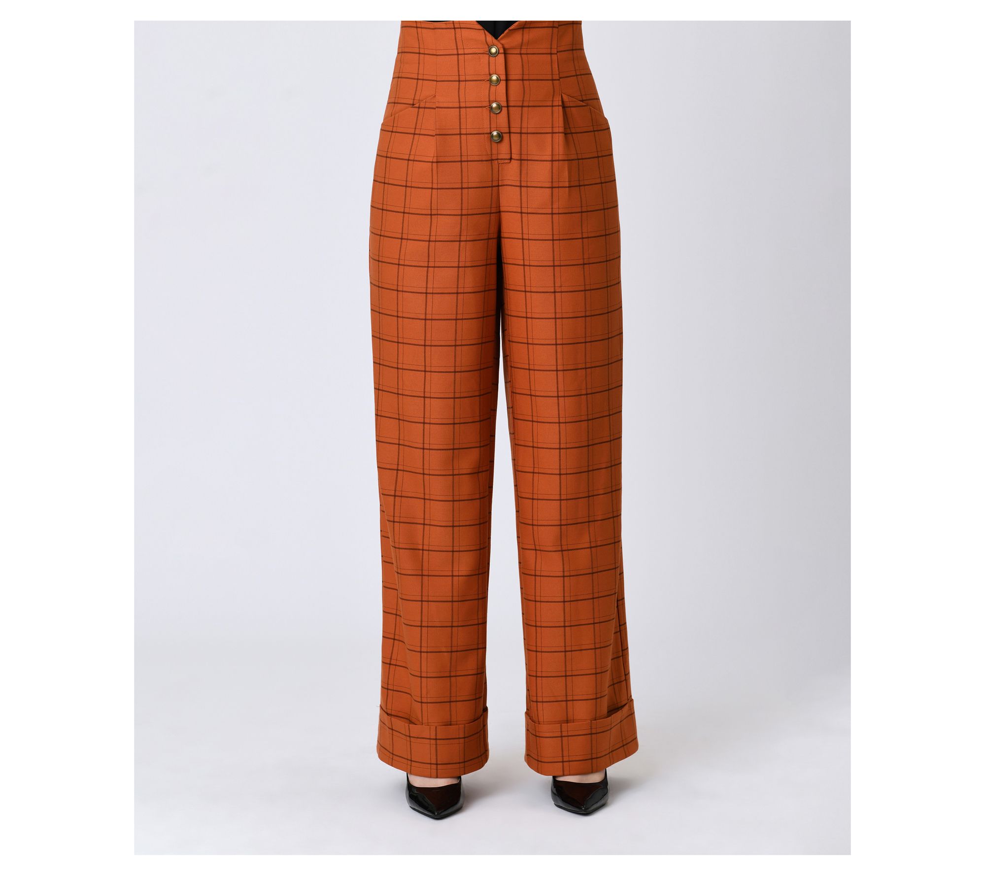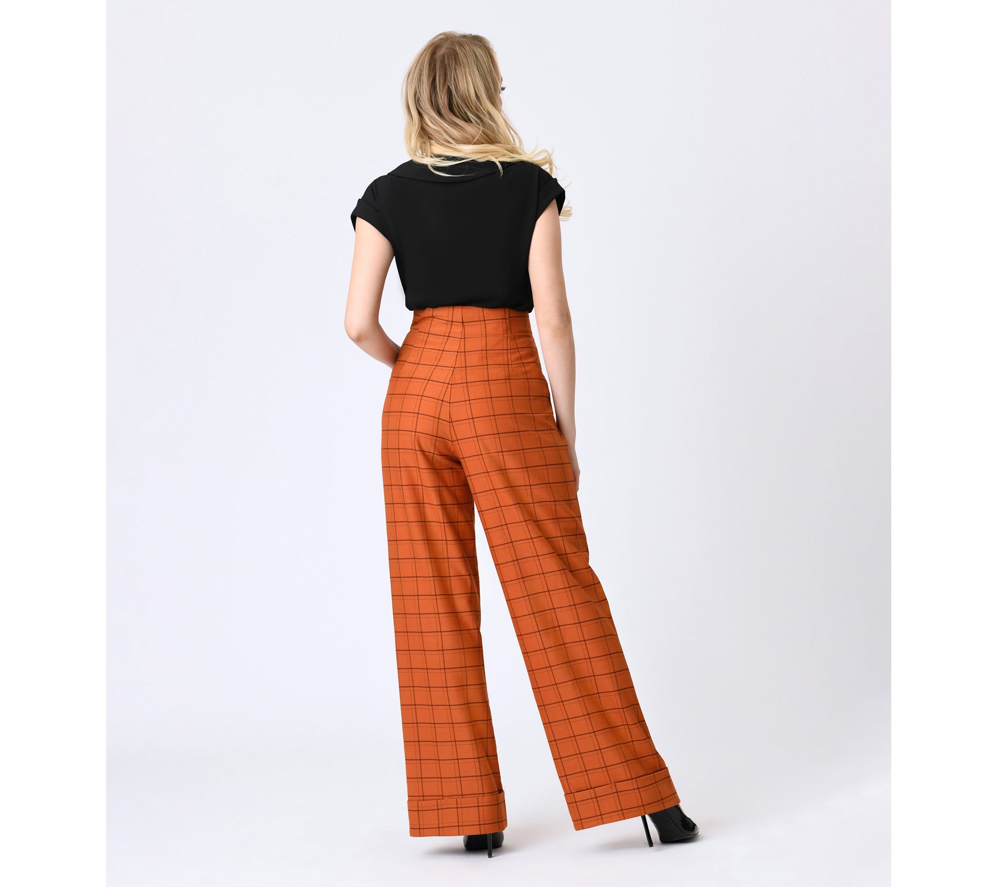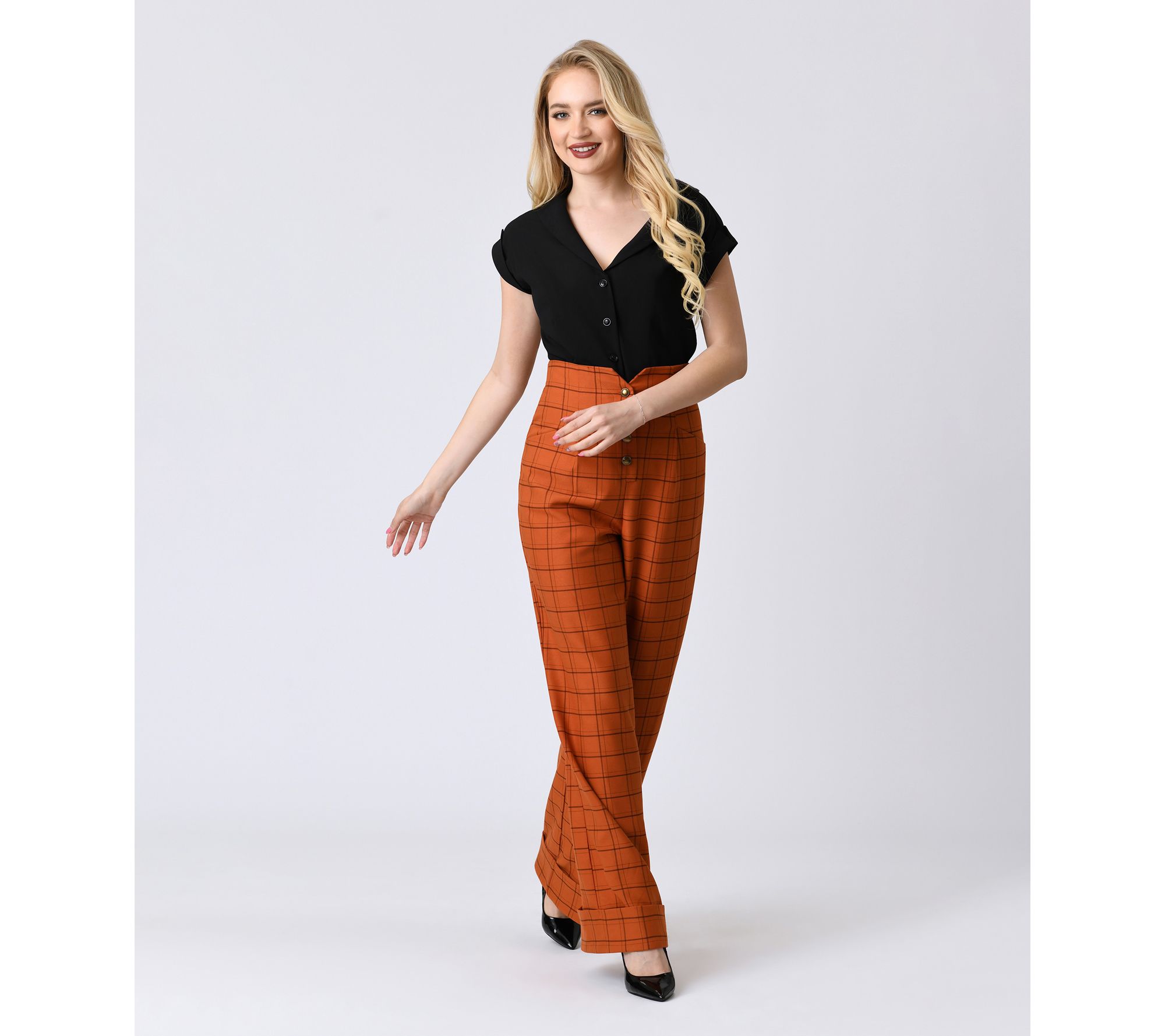 Put a retro-inspired spin on your workwear or weekend style with these vibrant windowpane plaid woven pants in a flattering wide-leg silhouette. Designed for comfort and standout appeal, their above-the-waist fit and exposed button front bring a vintage touch to everyday outings or special get-togethers. From Unique Vintage.