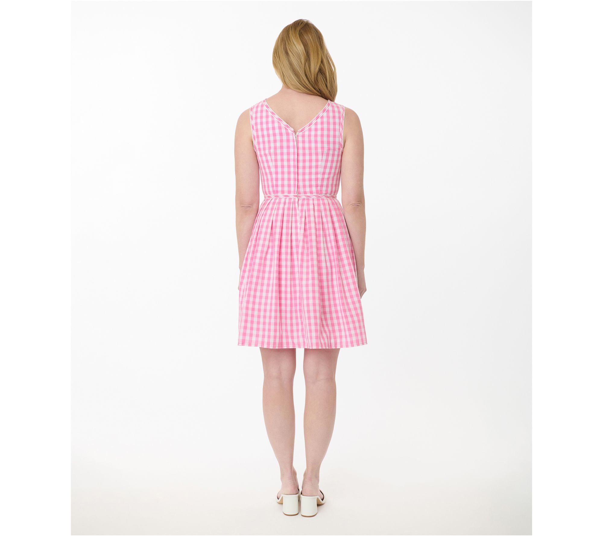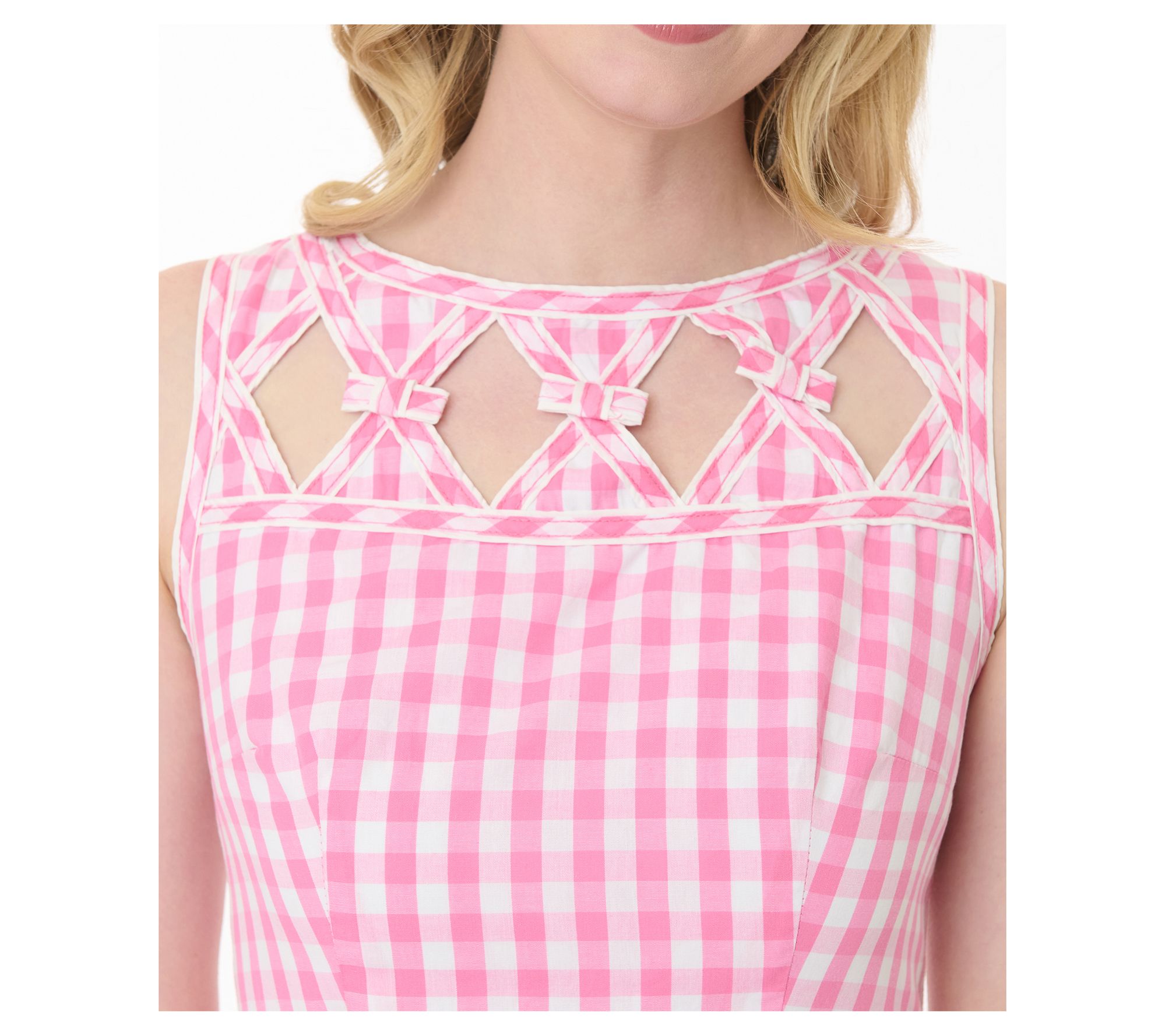• Features: sleeveless, straight neckline with woven cutout detail, piped waistline, darted bodice, white piping, bows, knife-pleated A-line swing skirt, gingham pattern, knee length, single side pocket, lined