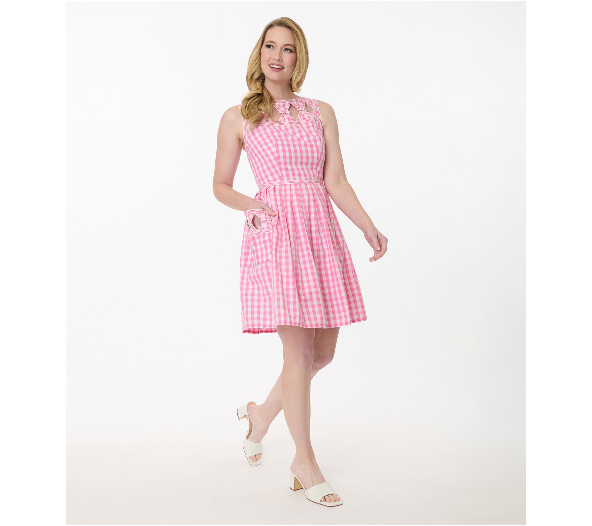 Summer get-togethers feel sweeter in this swing dress, crafted in soft woven cotton with playful pink gingham and charming cutout detail along the straight neckline. With a sleeveless, fitted bodice and knife-pleated A-line skirt, it's ready for picnics, garden parties, or sunny brunches with friends. From Unique Vintage.