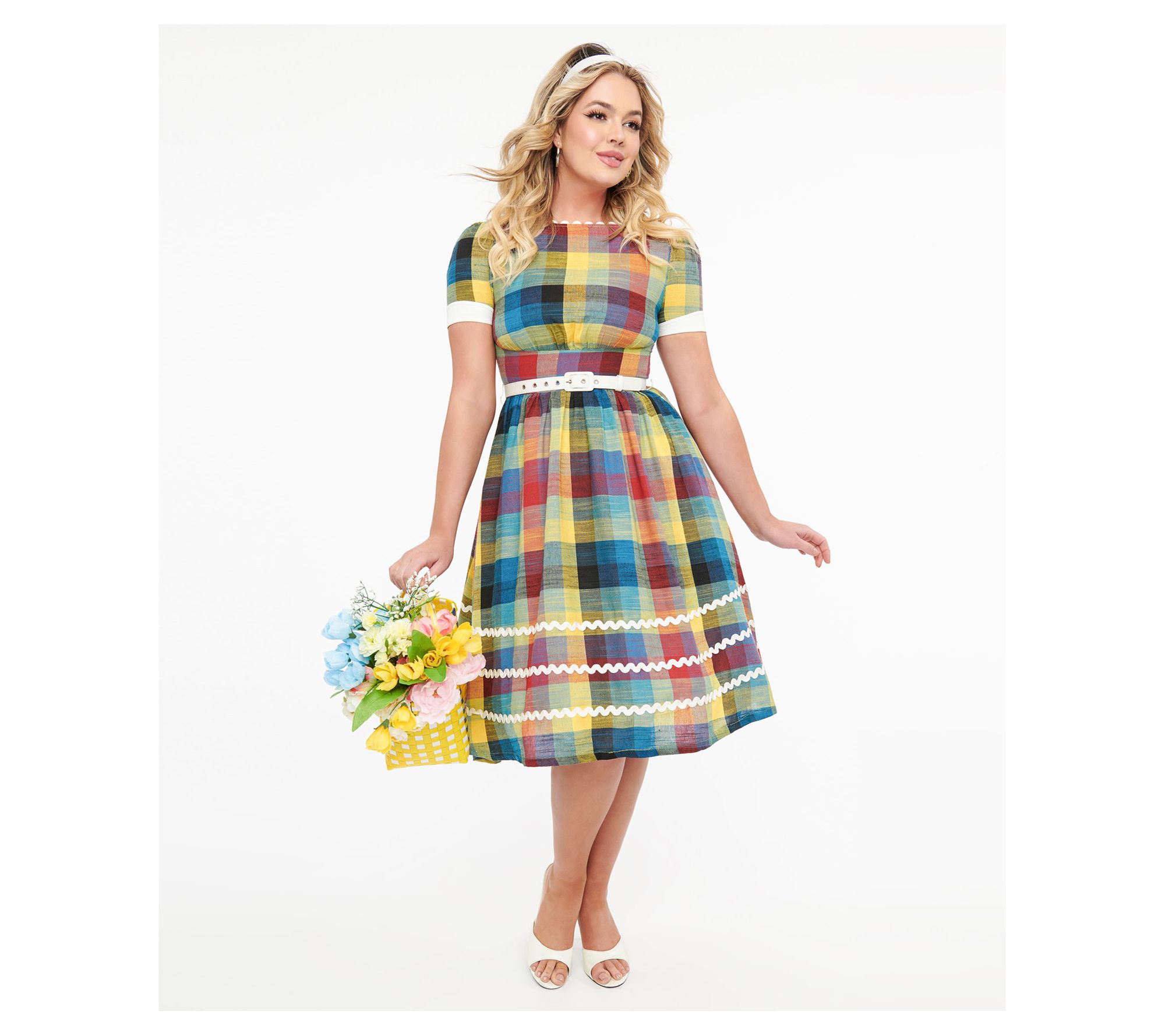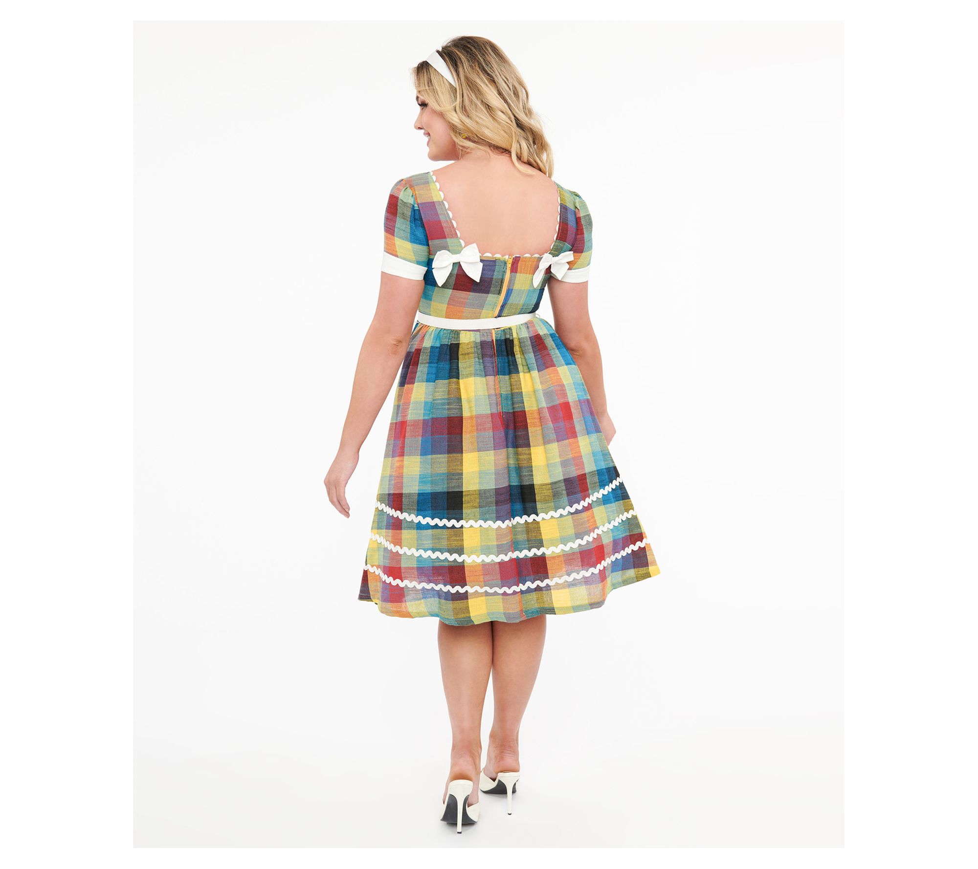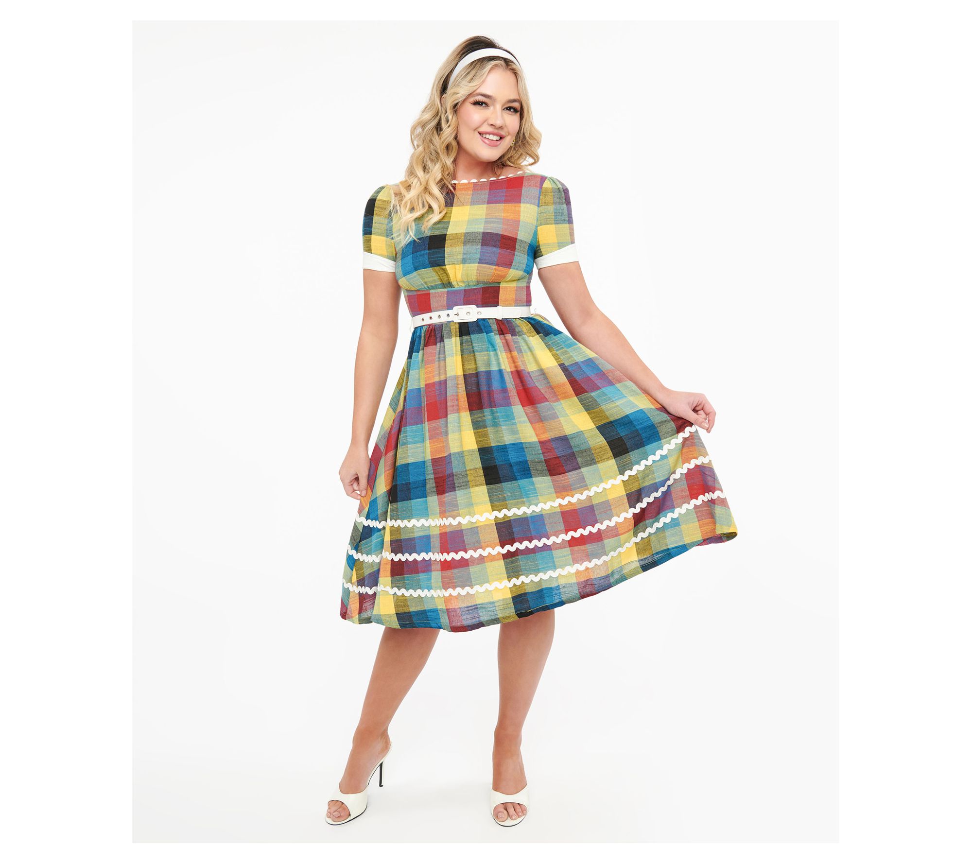 Embrace a timeless elegance with this plaid swing dress featuring charming ric rac trim that adds a whimsical touch to the classic silhouette. The included white belt highlights your waist, while faux bows on the back bring a playful flair to this eye-catching piece. From Unique Vintage.