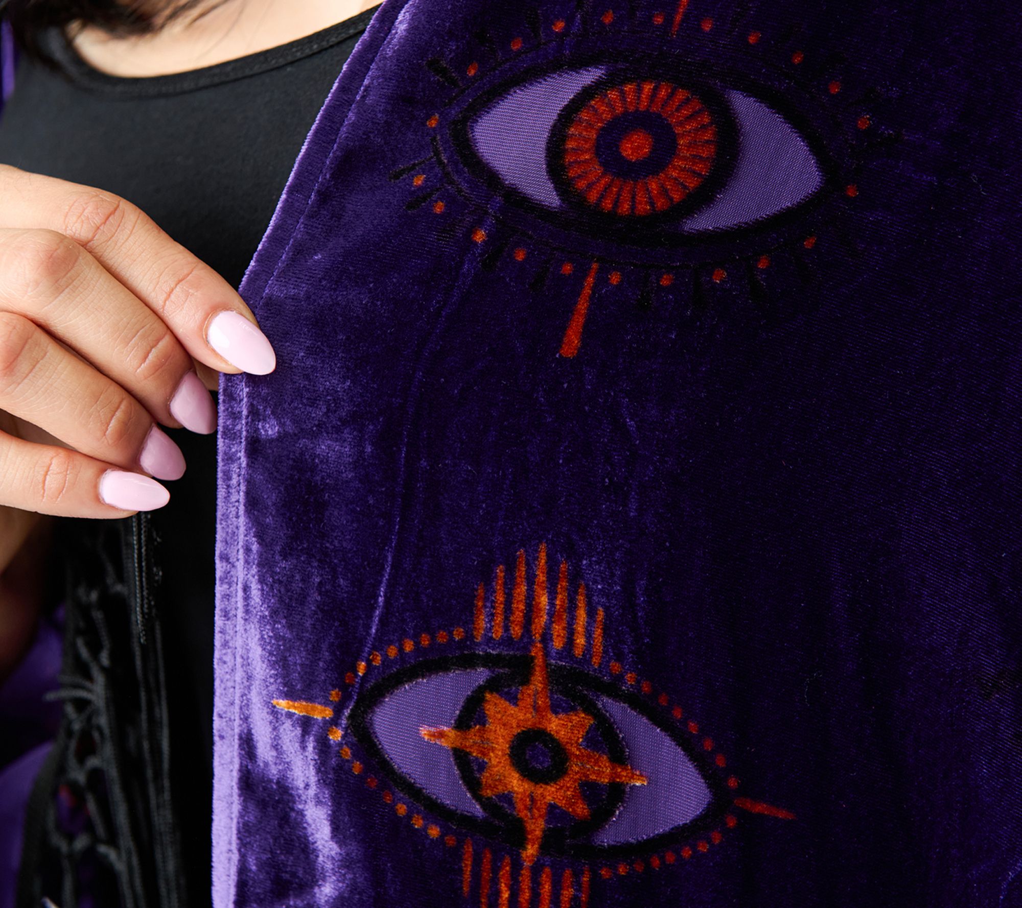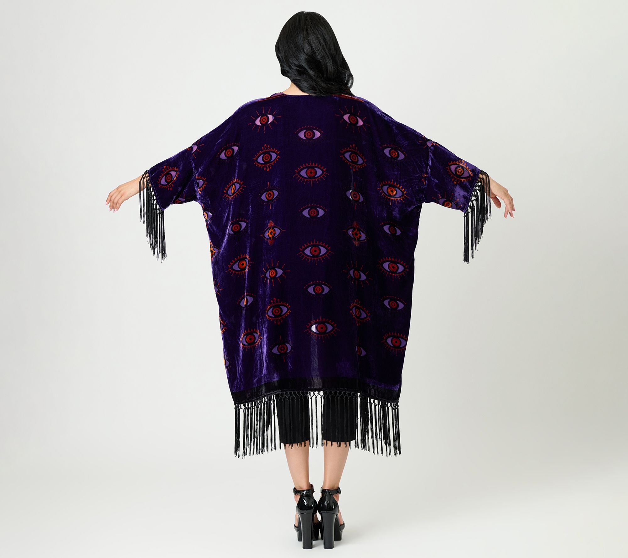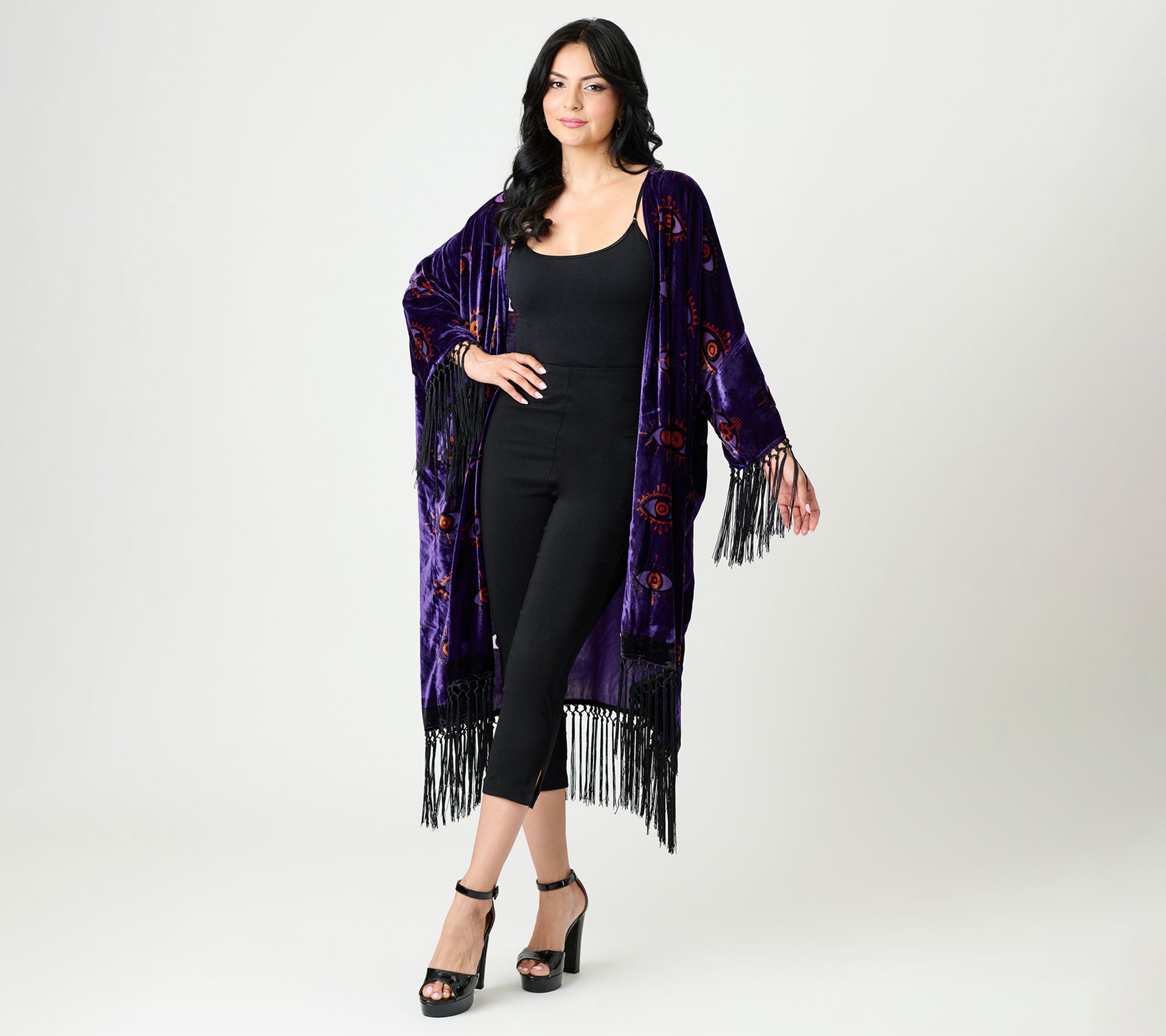 Add a touch of drama to your everyday look with this women's cardigan, featuring sheer burnout velvet and a mesmerizing evil eye motif. The flowing fringe trim and relaxed silhouette make it a standout piece for layering over jeans or dresses, whether you're heading to brunch or an evening out. From Unique Vintage.