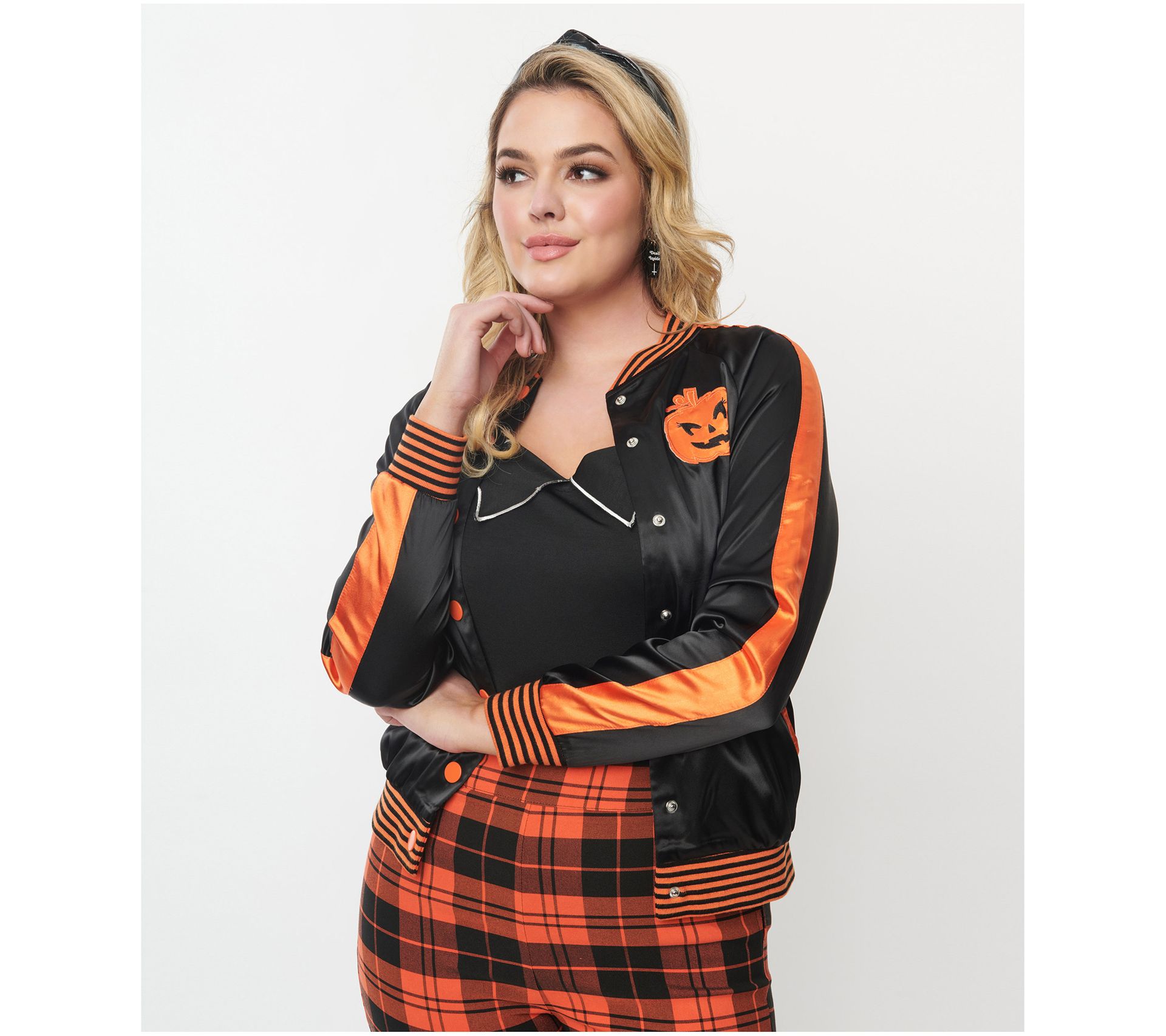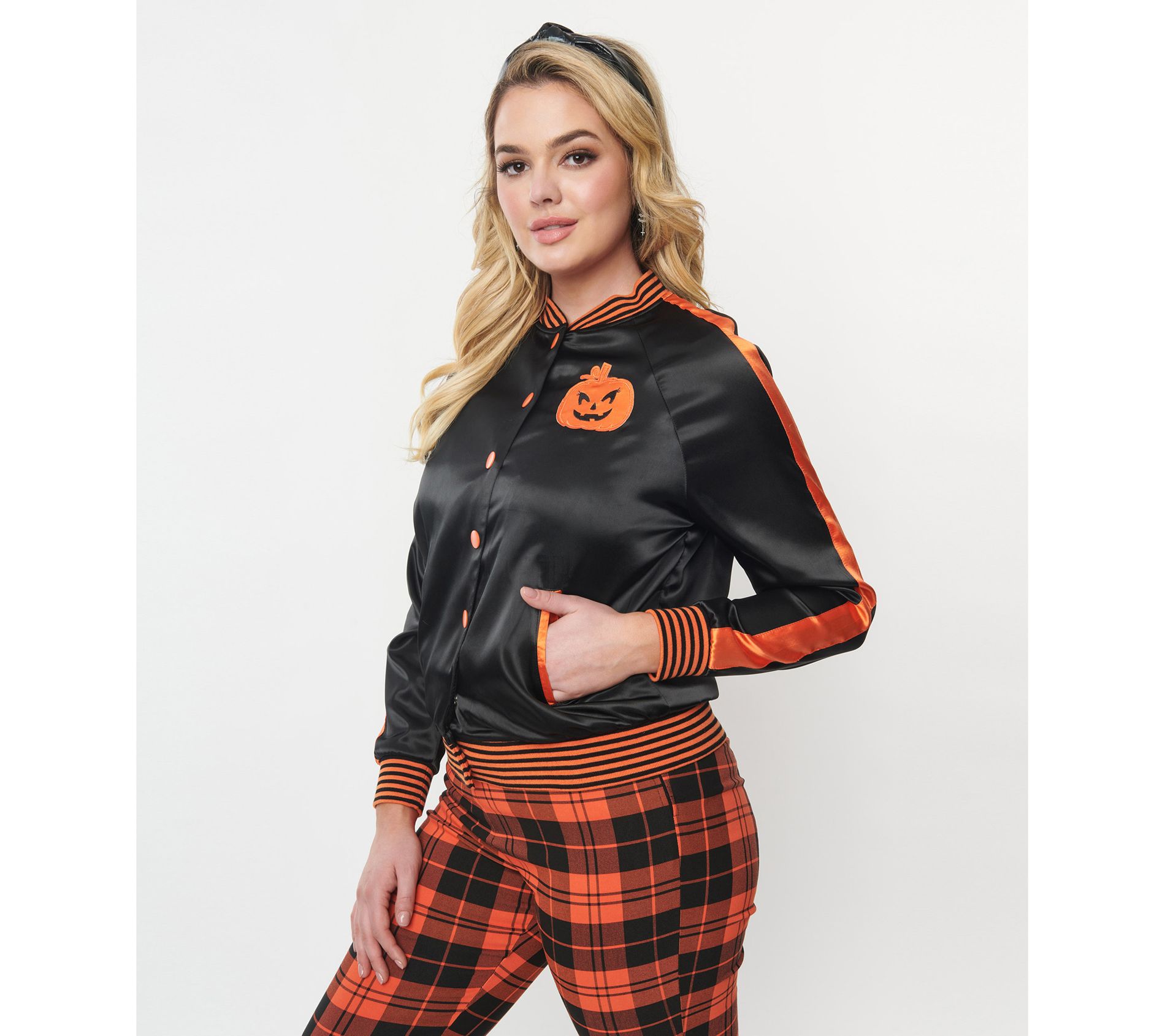 Embrace your scream queen status with this Unique Vintage satin bomber jacket. Crafted in striking black and orange satin-like fabric, this sleek and scary style ups your Halloween fashion factor. From Unique Vintage.