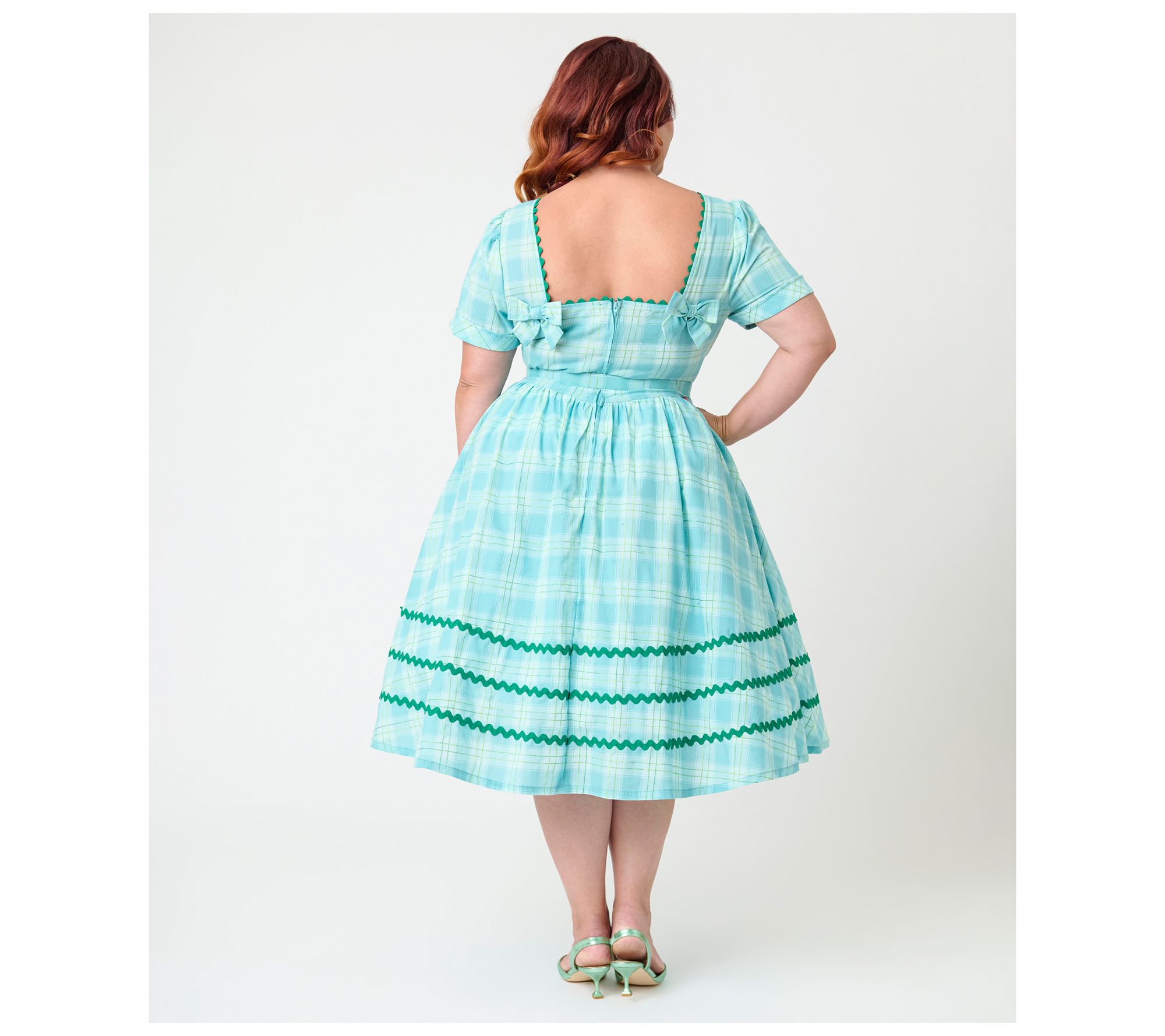 Features: scoop neckline, short sleeves, A-line silhouette, knee length, plaid pattern, green ric rac detailing, matching belt, faux bows on back, lined