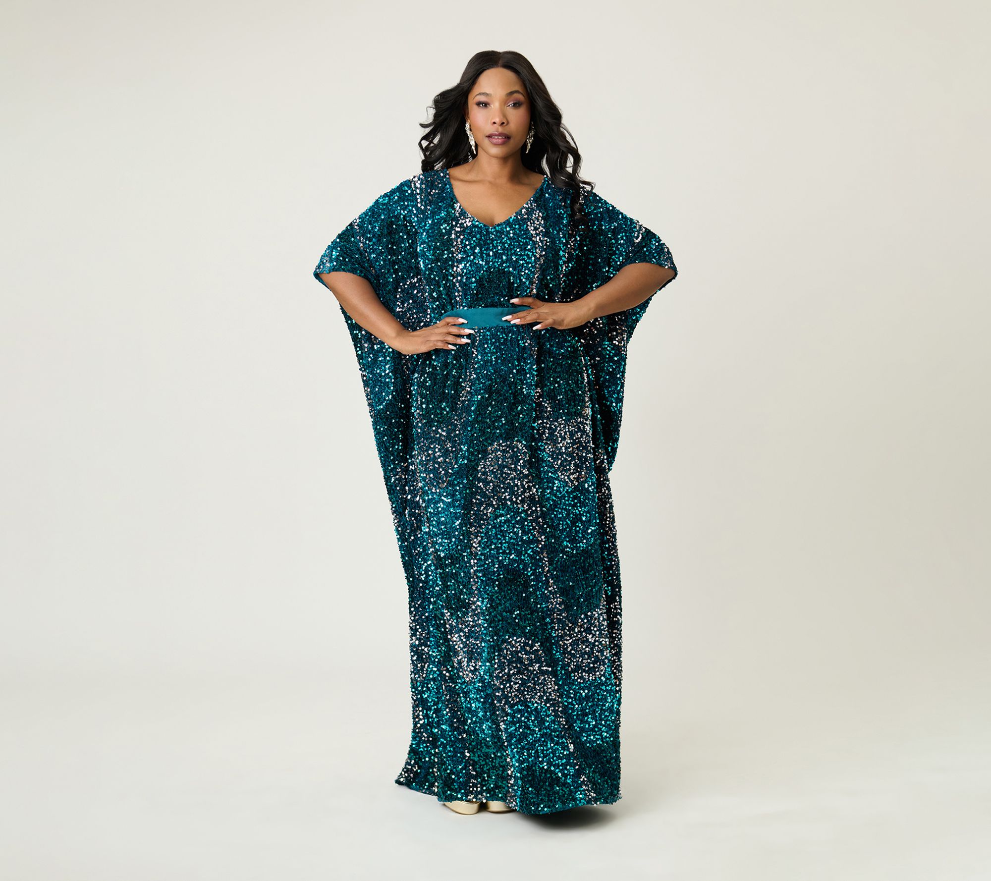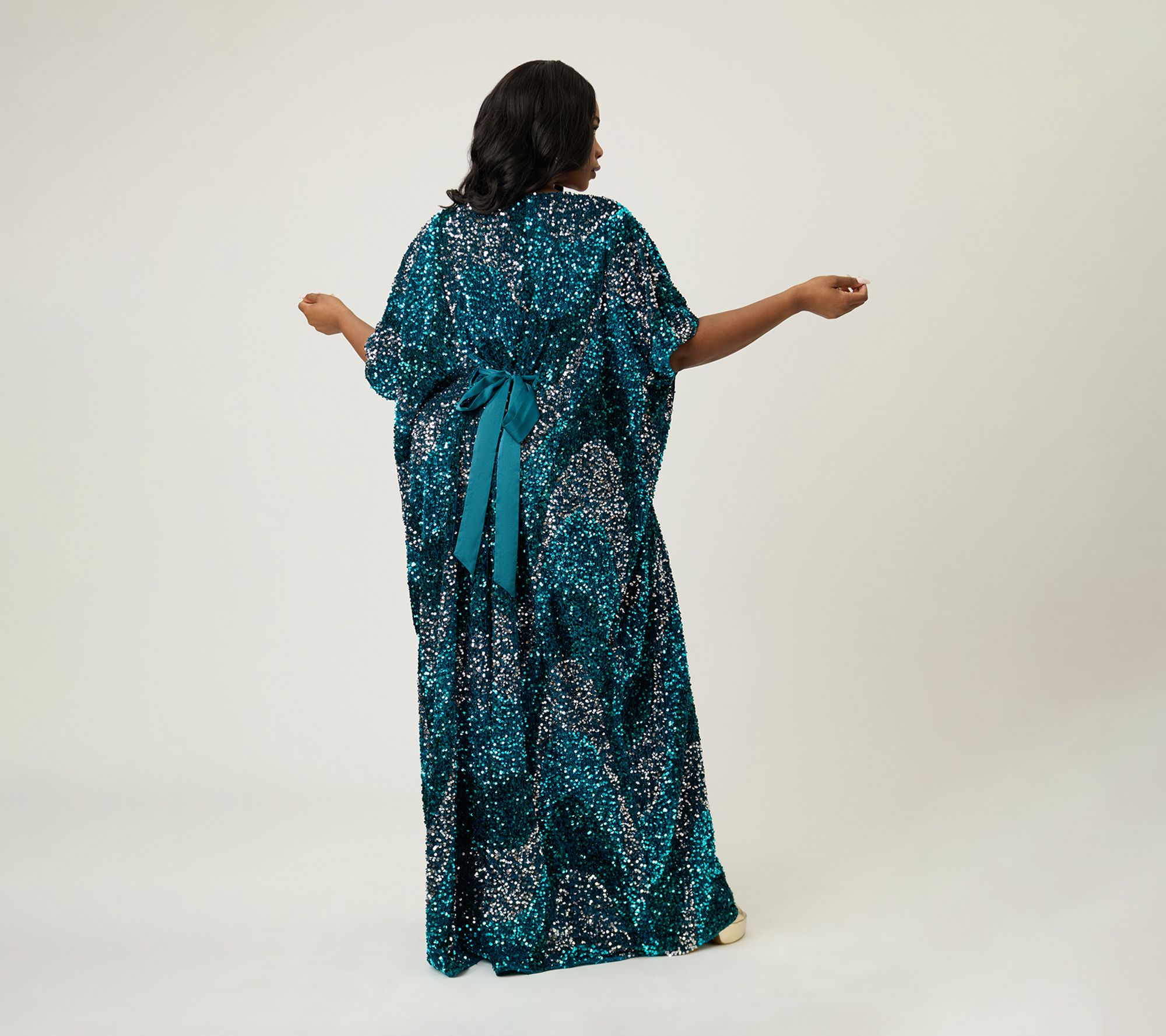 • Features: teal sequins, V-neckline, self-tie waist, 3/4-length half sleeves, ankle length
