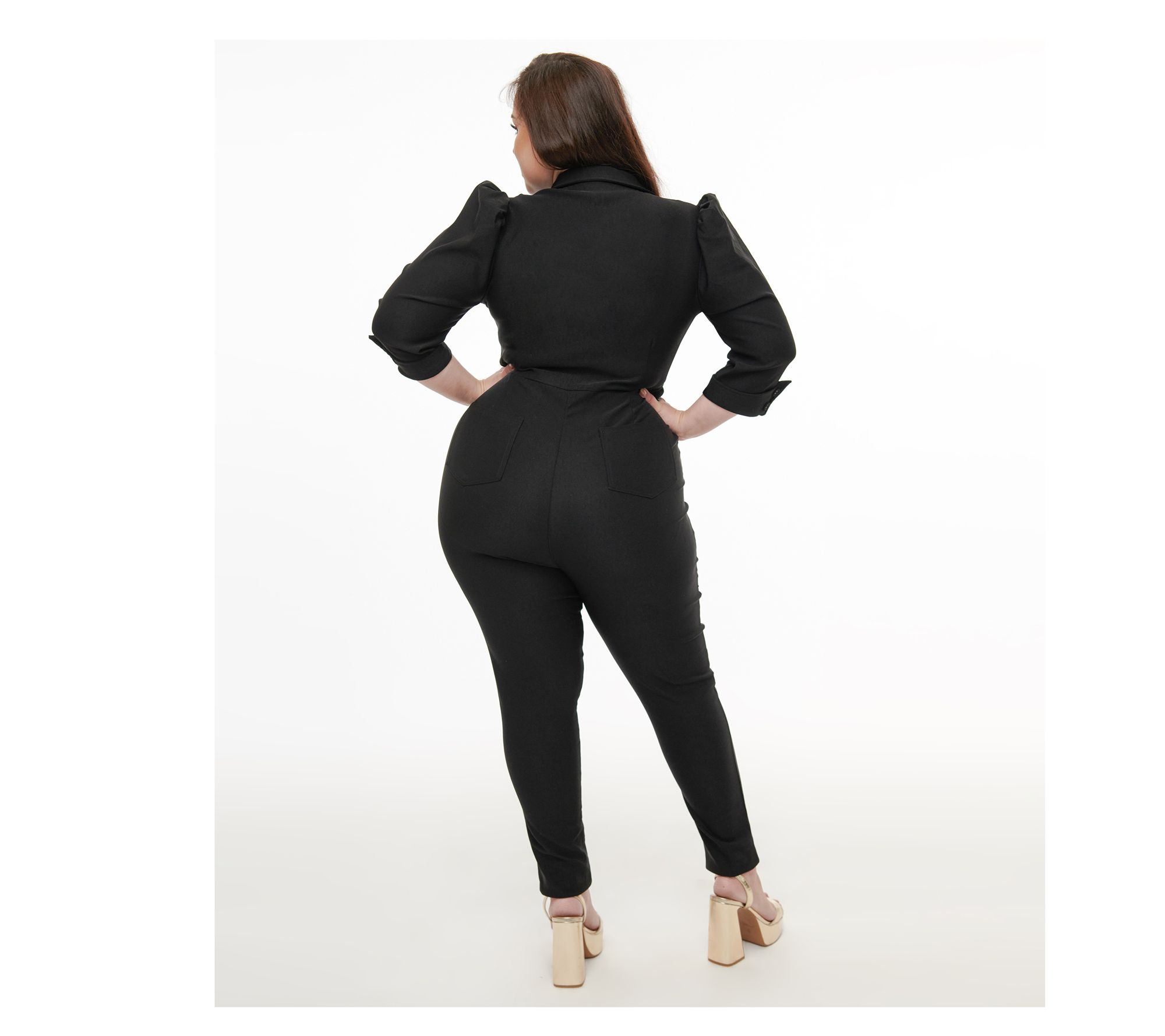 Fashion forward with effortless charm! This V-neck puff sleeve jumpsuit allows you stay stylishly comfortable for any event. With its three-quarter-length puff sleeves, button front bodice, and flattering fitted design, it's easy to dress up or down. Style with your favorite accessories to complete the look. From Unique Vintage.